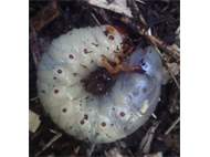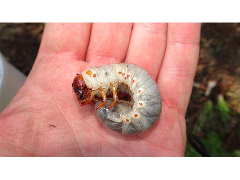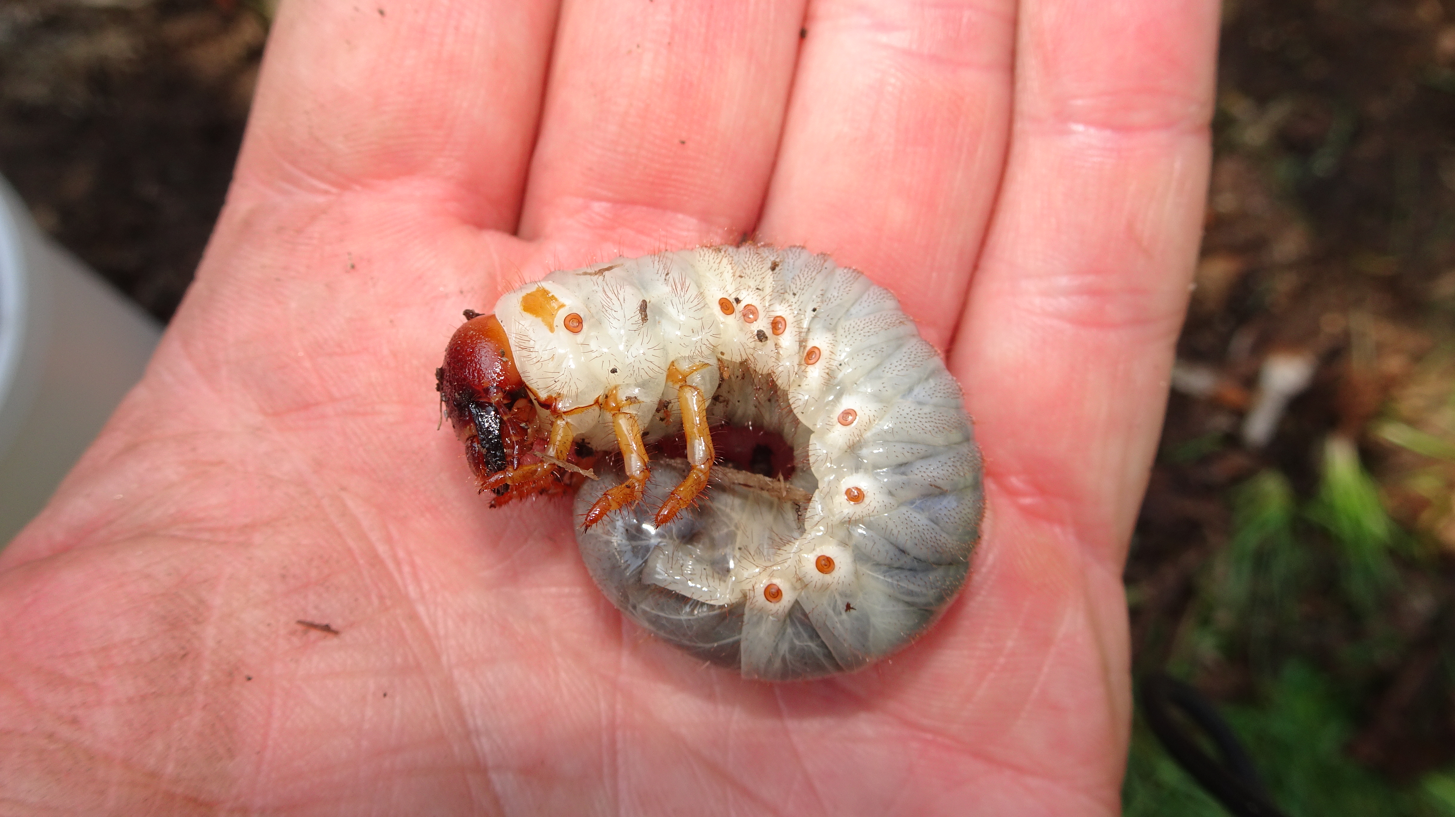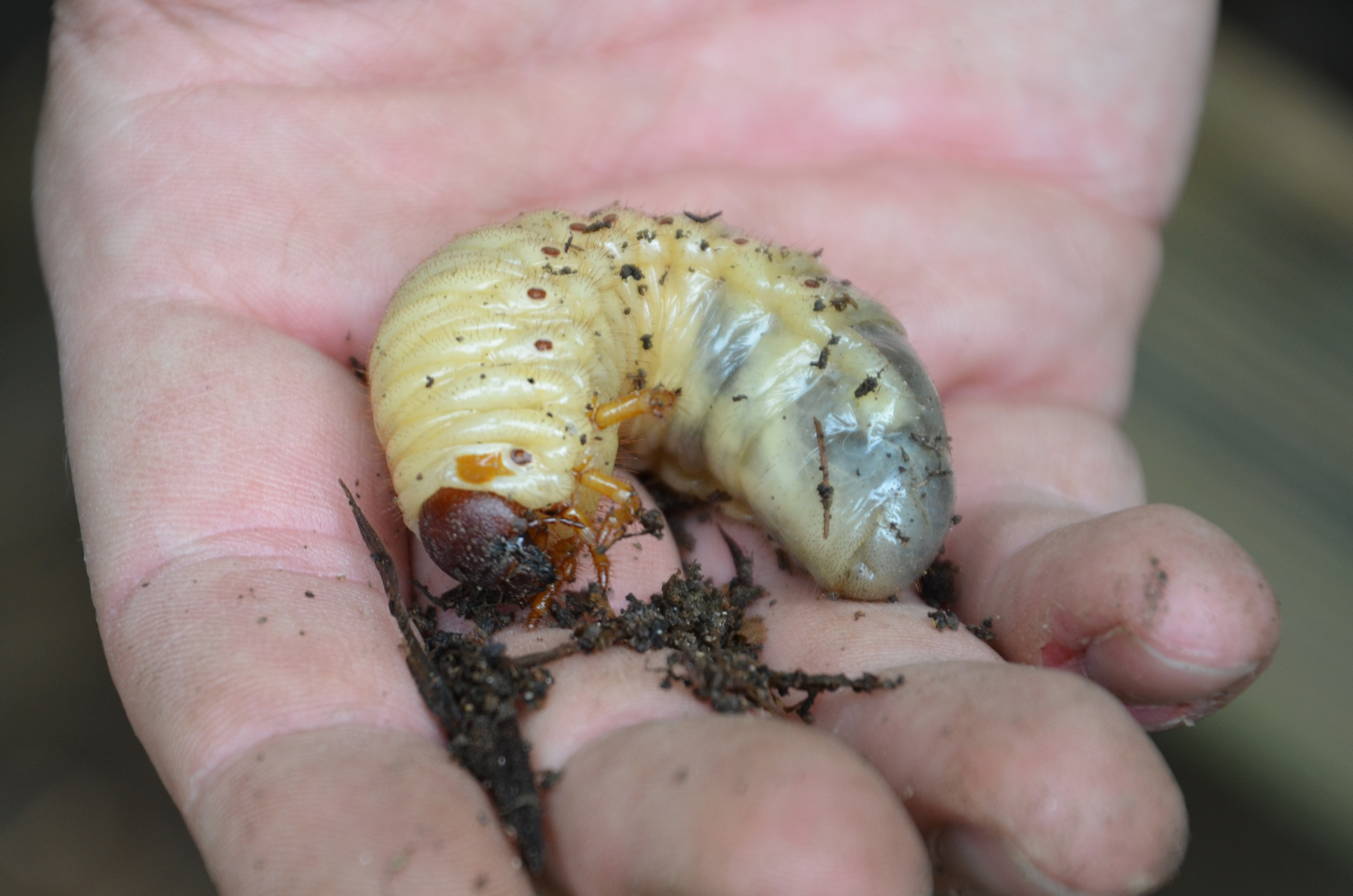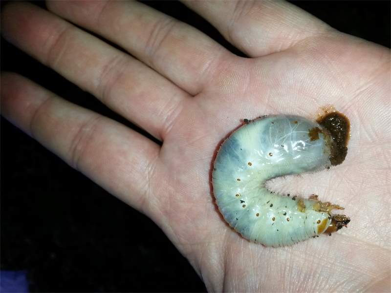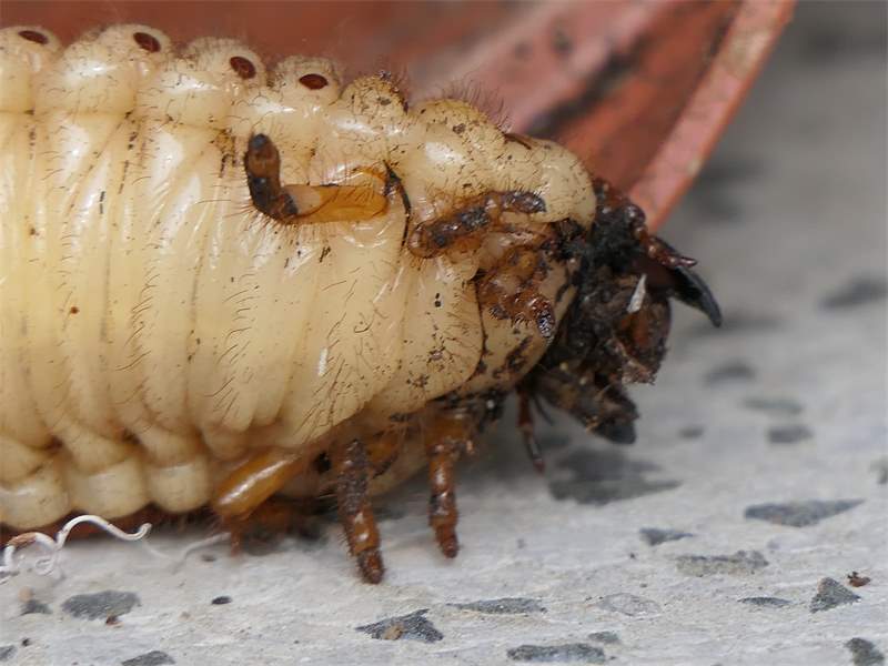 Beim Umsetzen eines Komposthaufens in einem Kleingarten in Dohna/Pirna 2011 wurden 9 Larven, 5 Puppen und 6 Adulte des Nashornkäfers gefunden. Hier im Bild eine Larve.