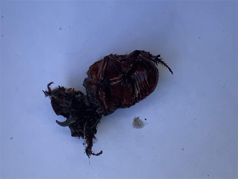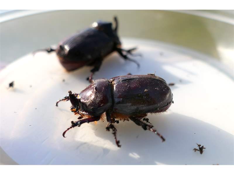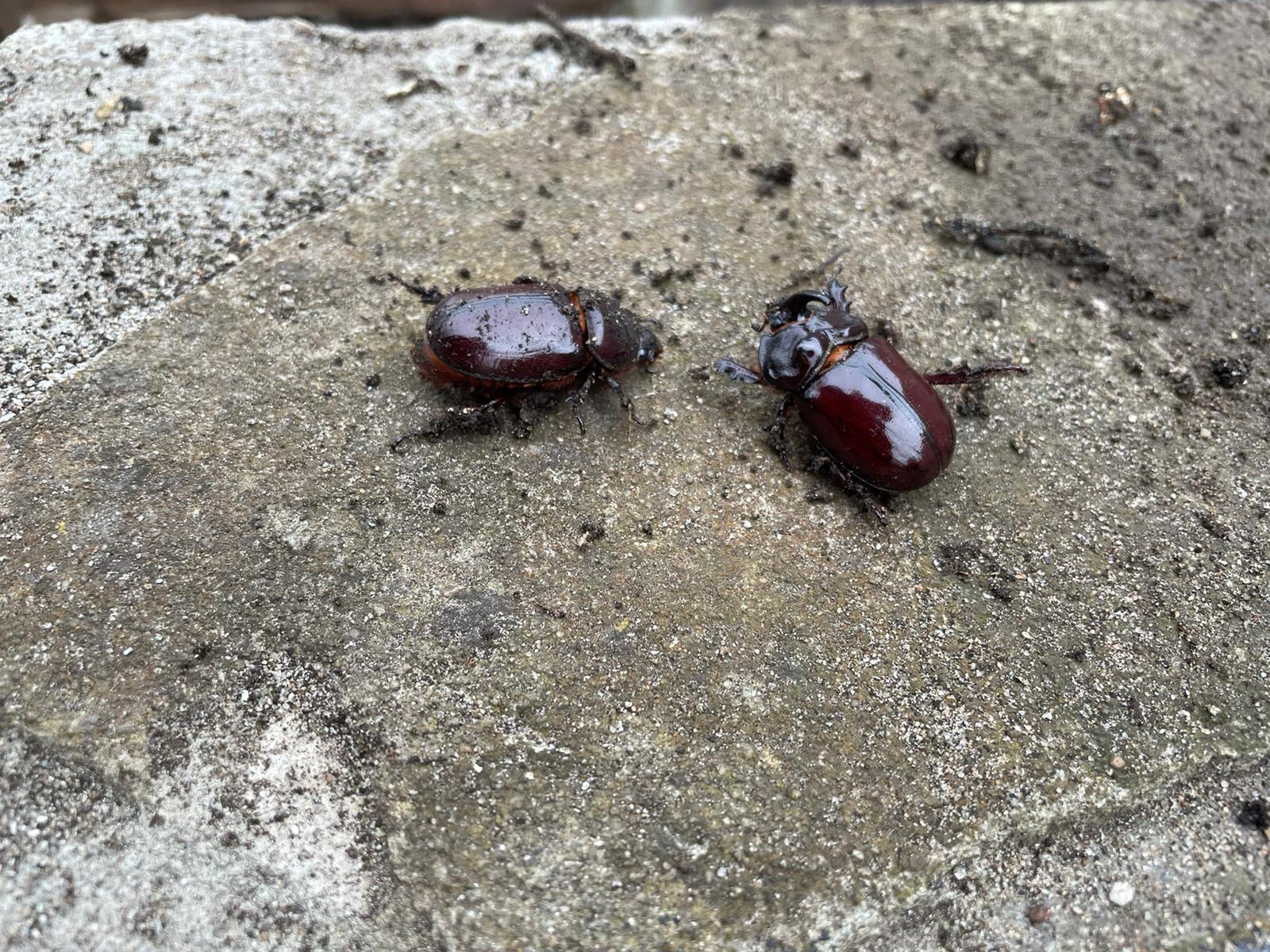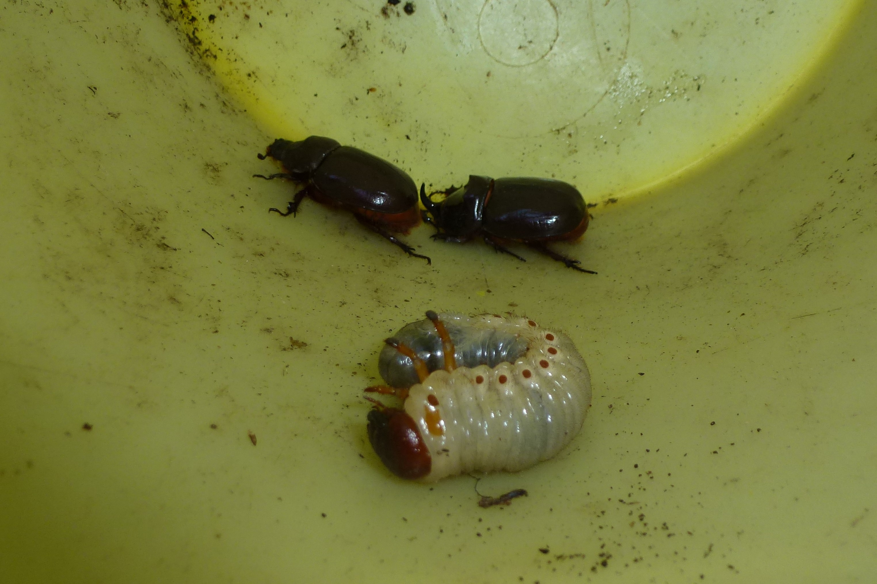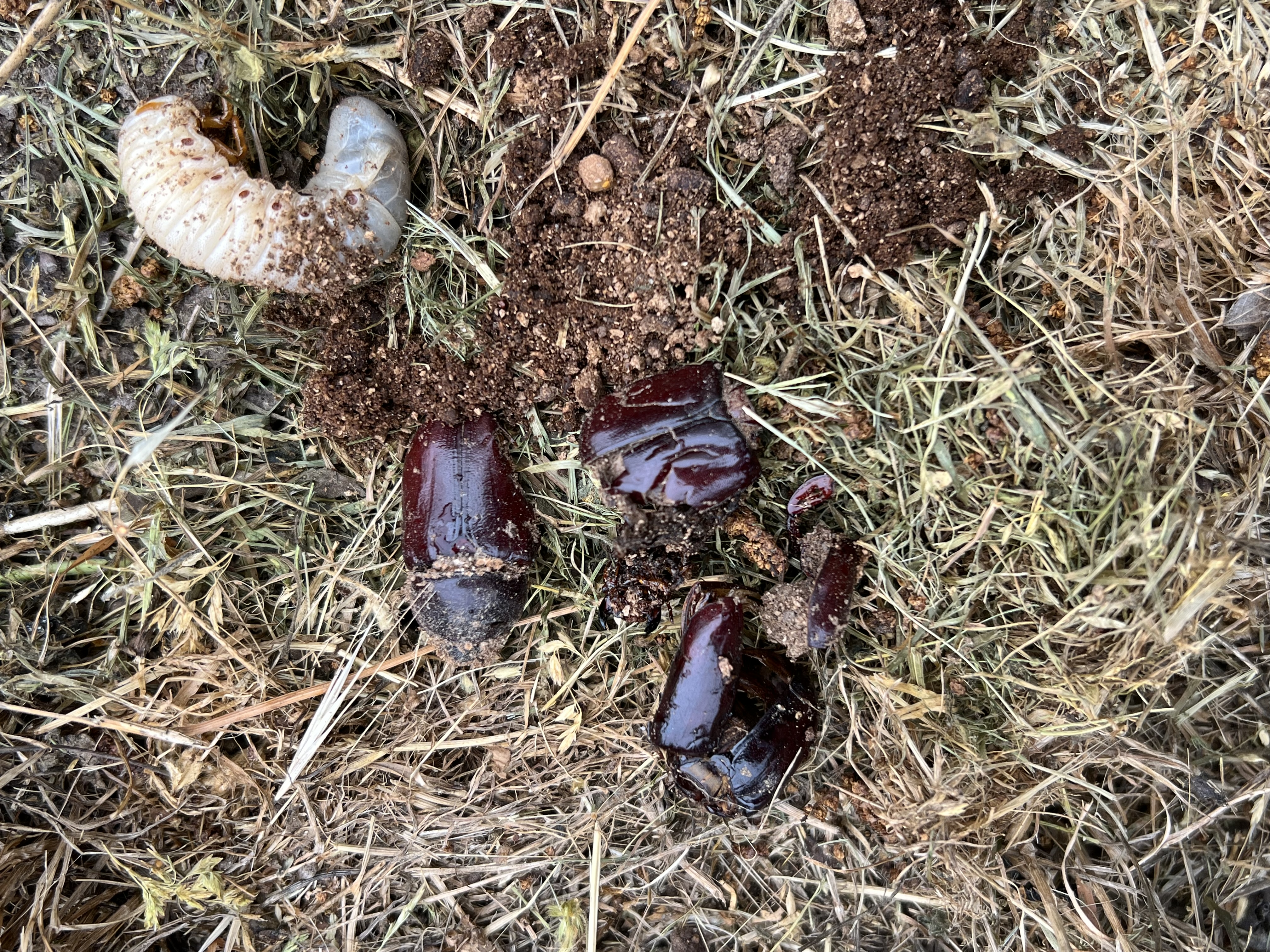 2,4 ad. Nashornkäfer frischtot am Komposthaufen liegend (davon 1 Weibchen noch lebend) Radebeul, Landkreis Meißen, Juli 2025