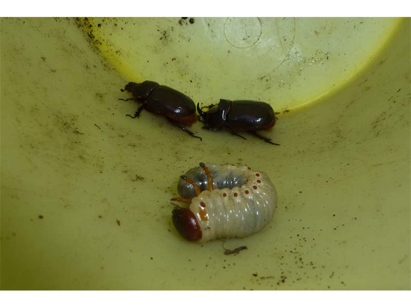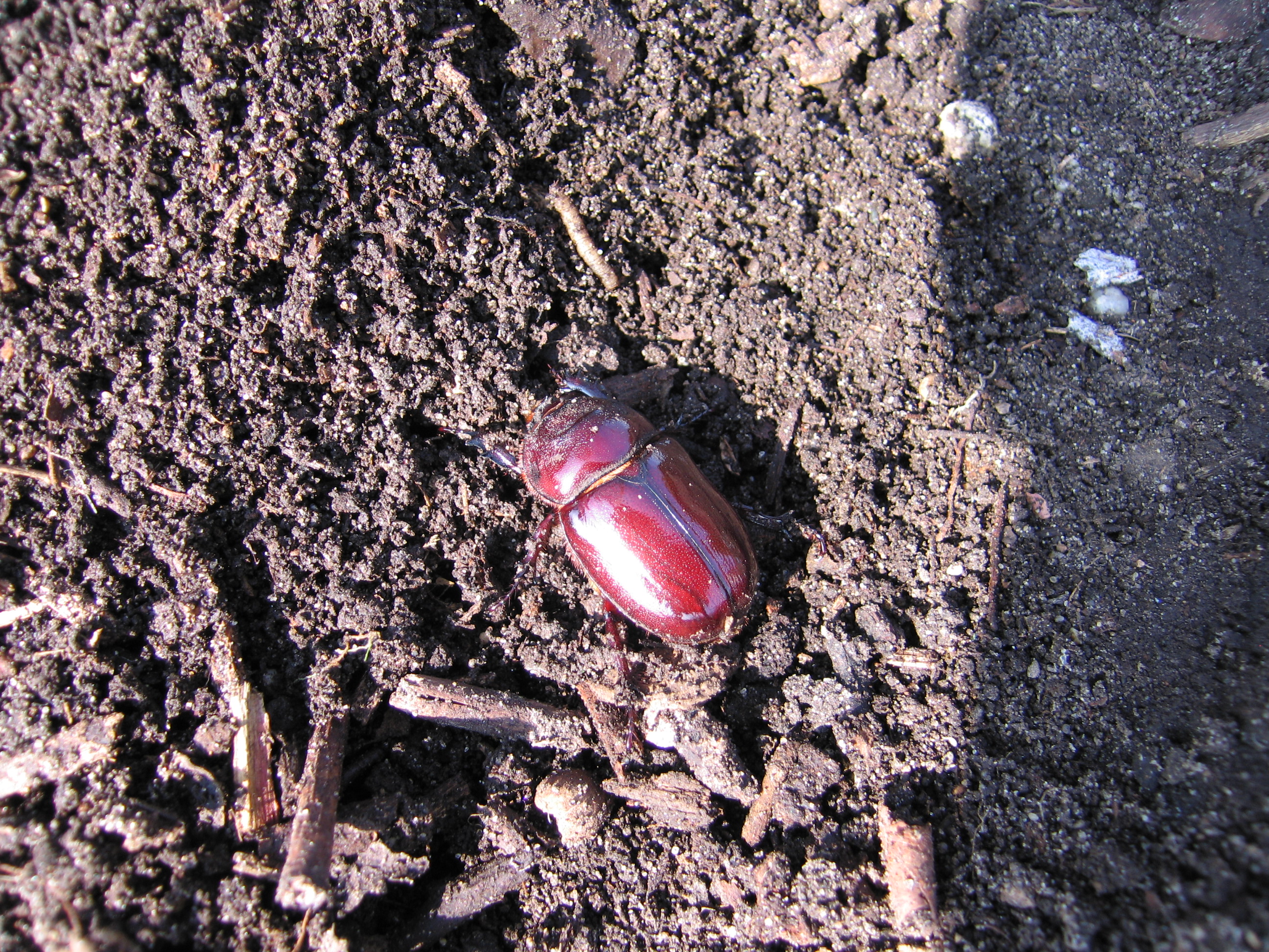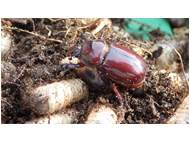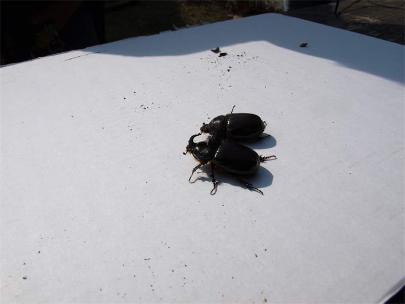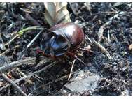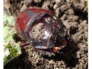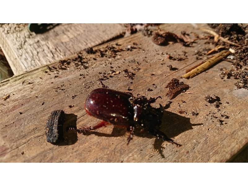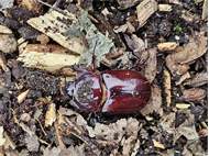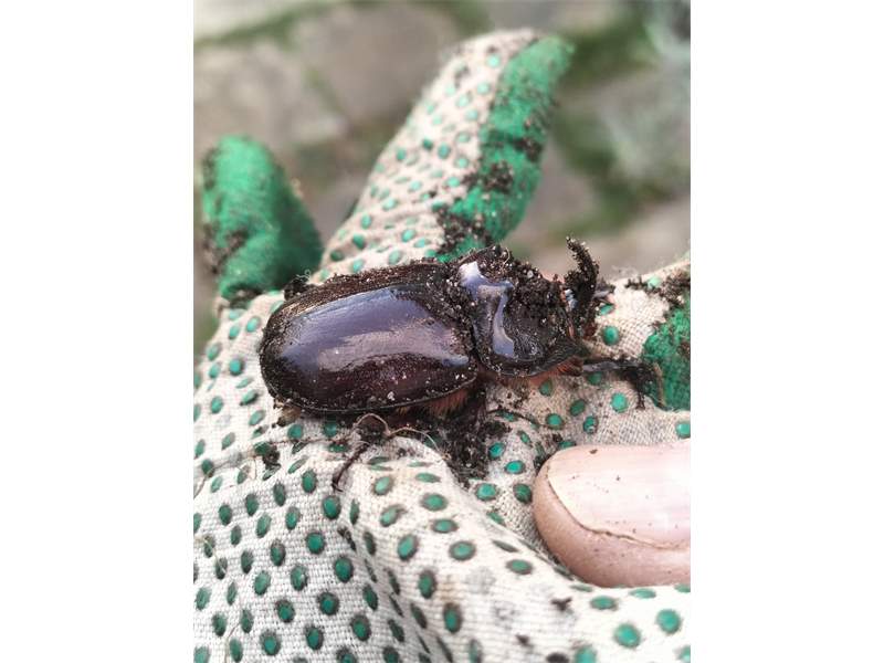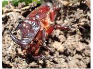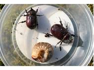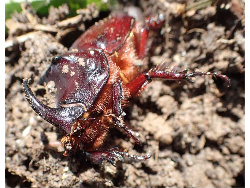 Beim Umsetzen eines Komposthaufens in einem Kleingarten in Dohna/Pirna 2011 wurden 9 Larven, 5 Puppen und 6 Adulte des Nashornkäfers gefunden. Hier im Bild ein adulter Käfer.