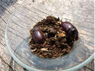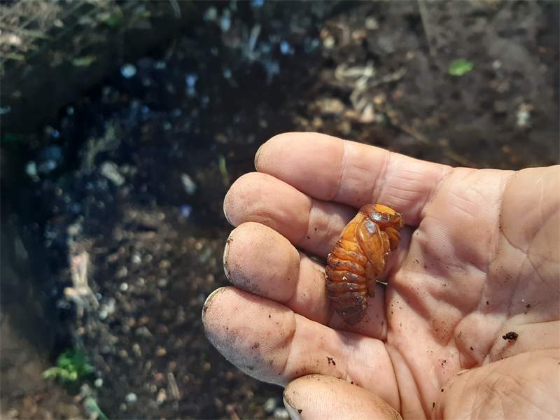 Beim Umsetzen eines Komposthaufens in einem Kleingarten in Dohna/Pirna 2011 wurden 9 Larven, 5 Puppen und 6 Adulte des Nashornkäfers gefunden. Hier im Bild eine Puppe in Seitenansicht.