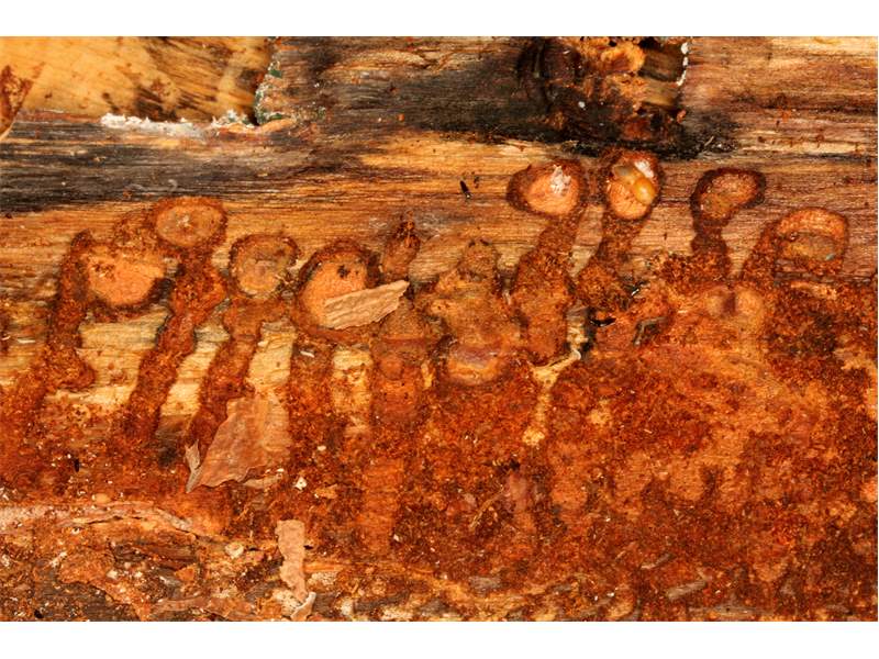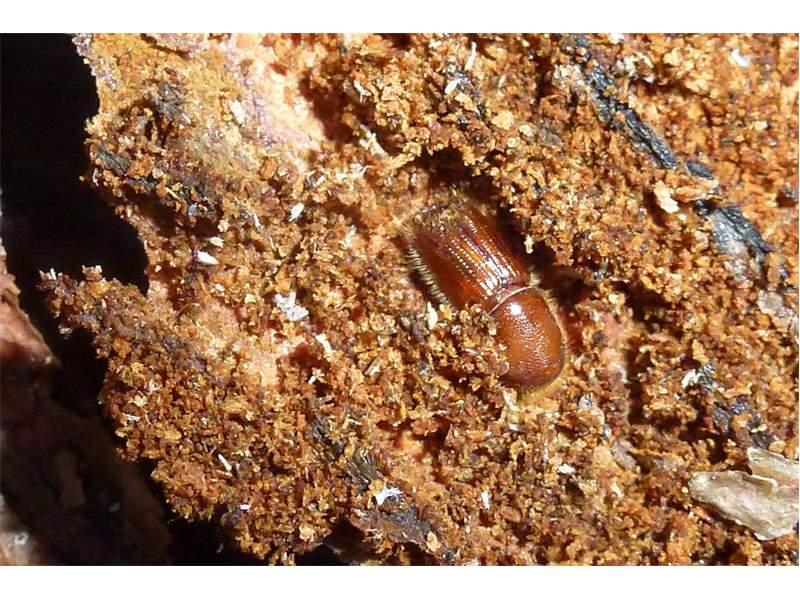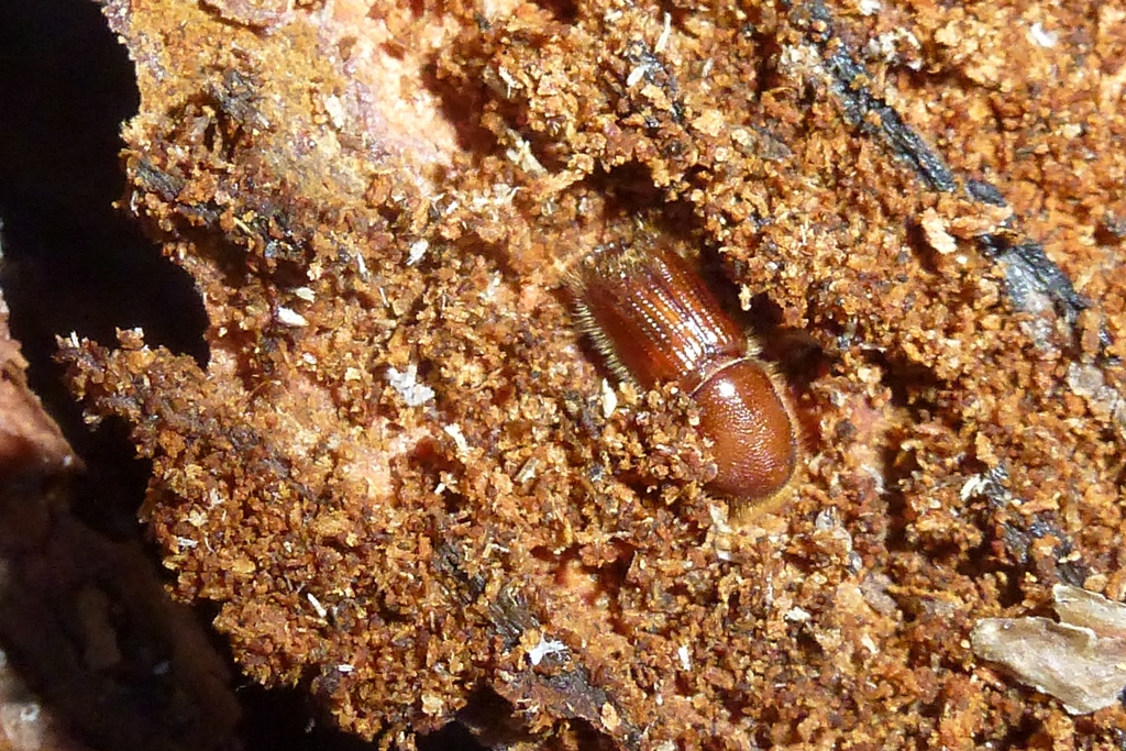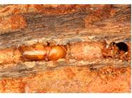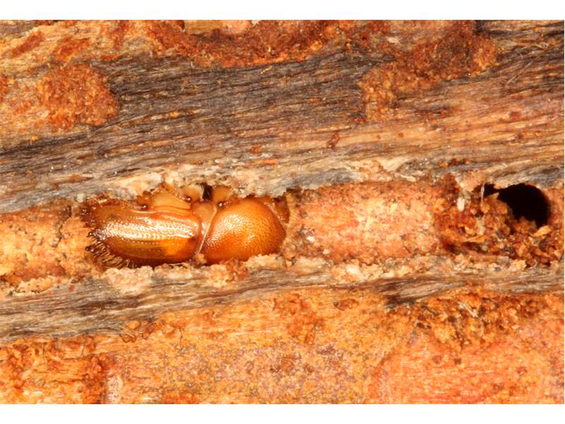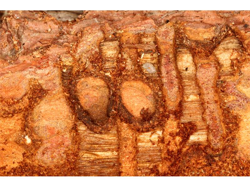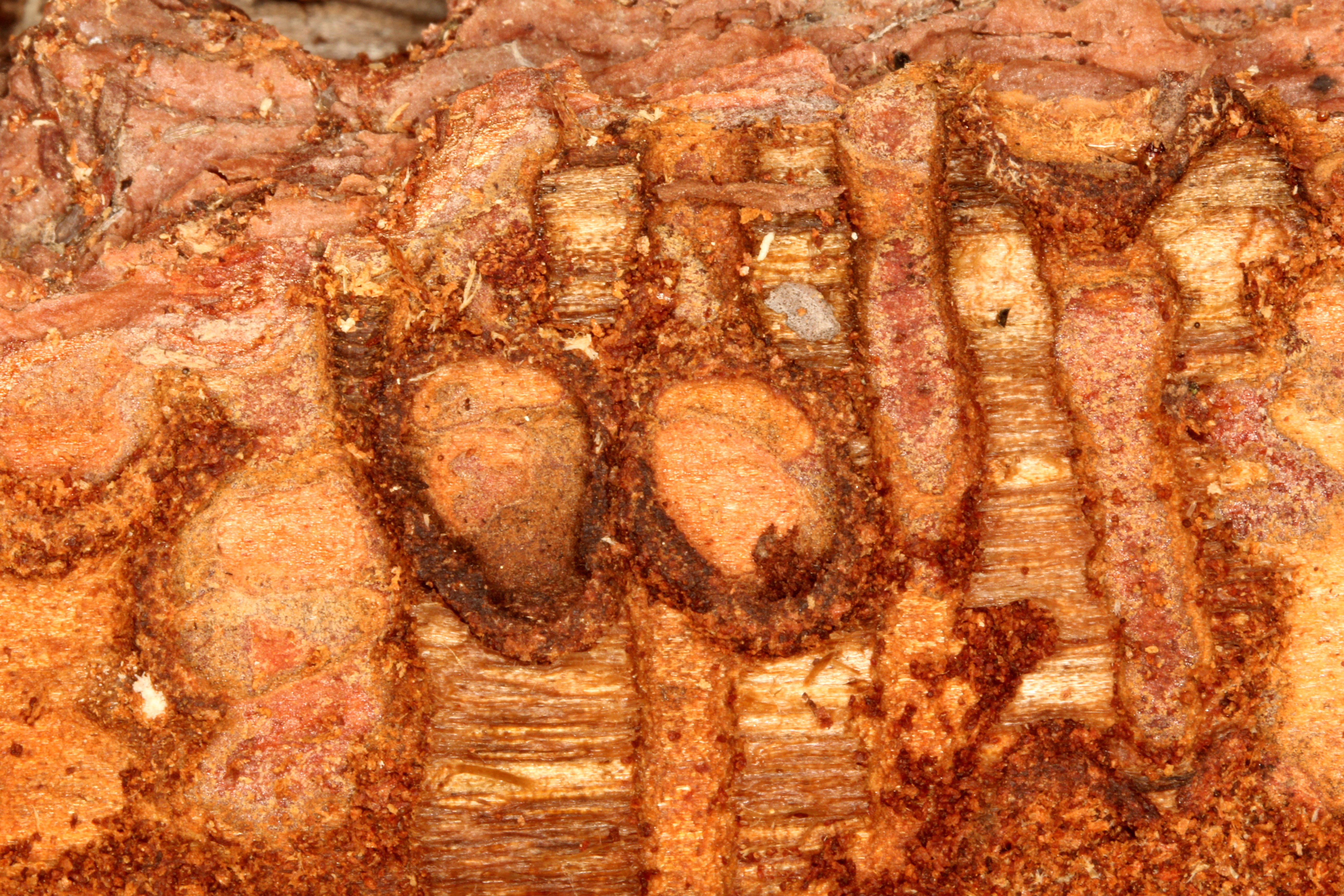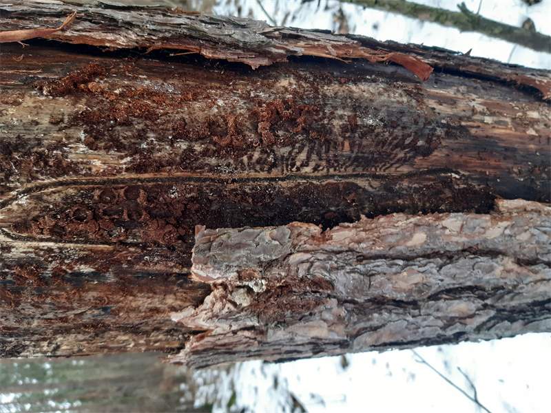 Imagines unter Borke von gestapelten Kiefernstämmen, Exuvien tw. noch in Puppenwiegen
