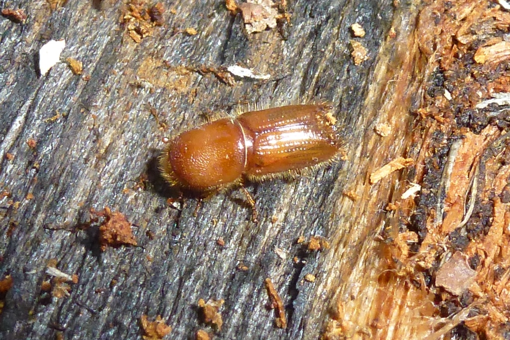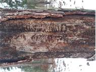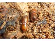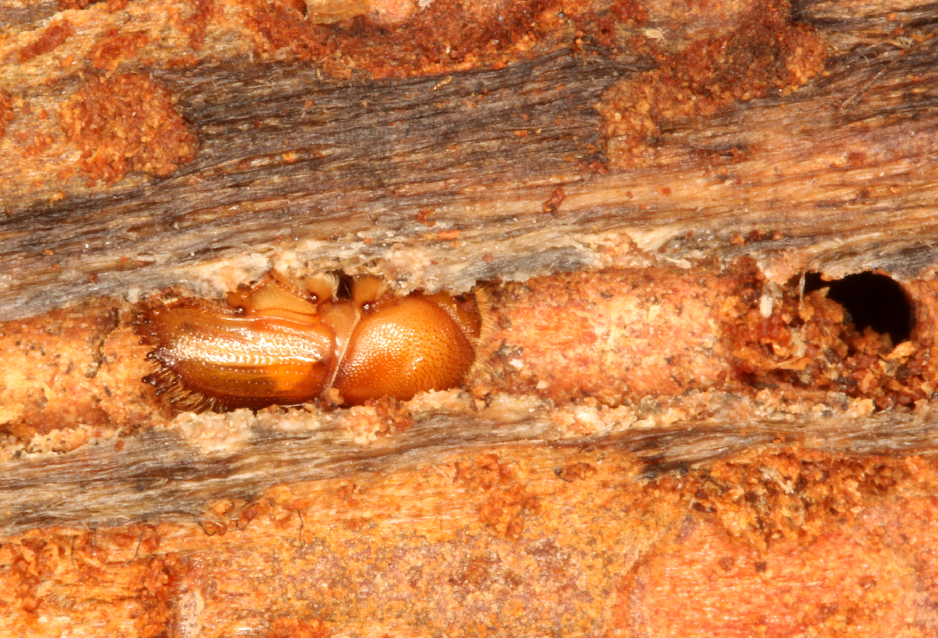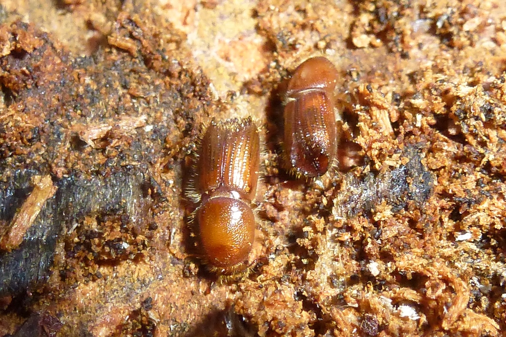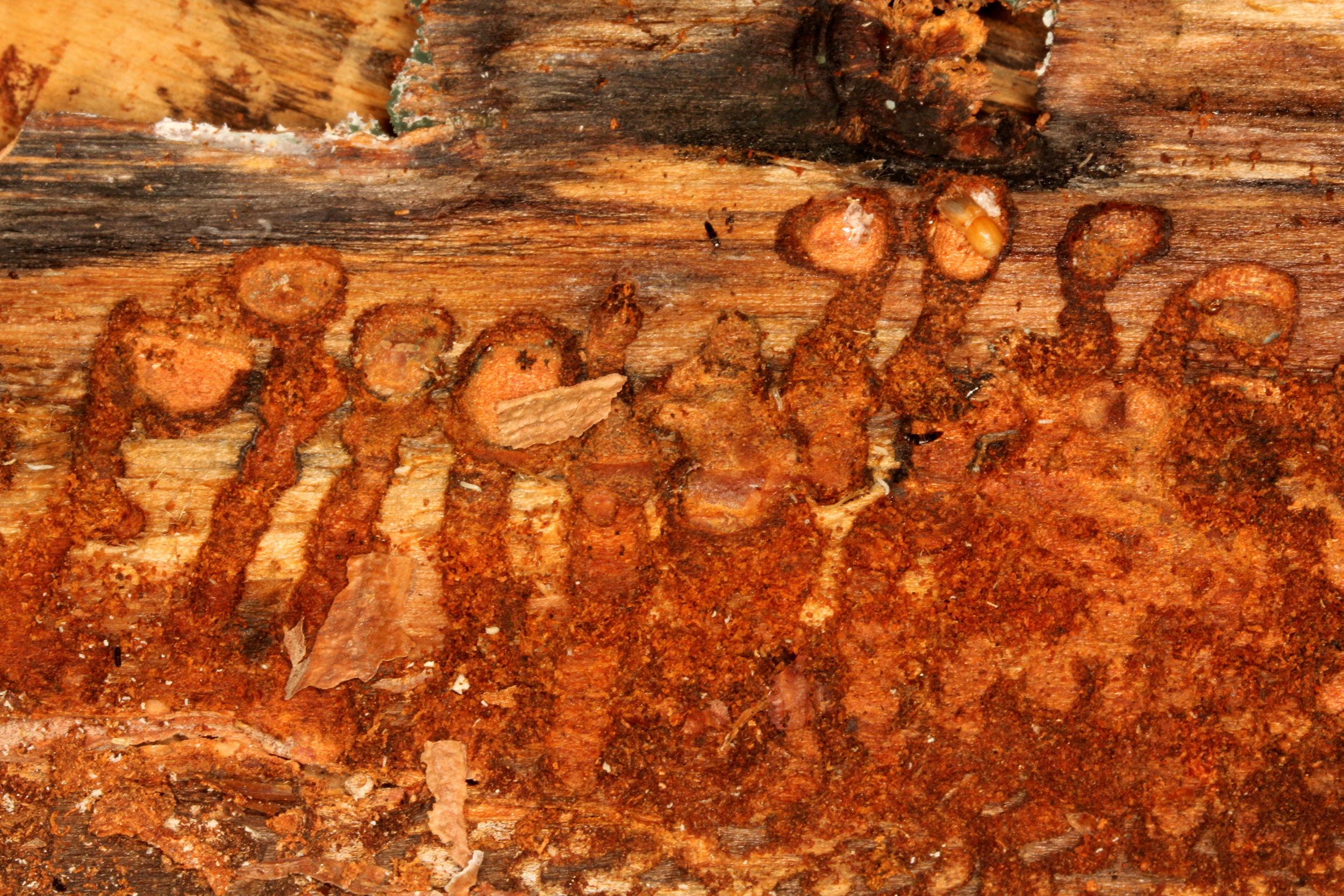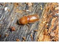 Imagines unter Borke von gestapelten Kiefernstämmen, Exuvien tw. noch in Puppenwiegen