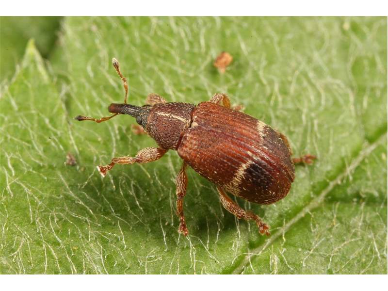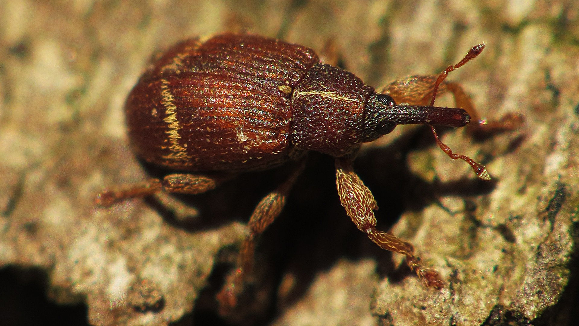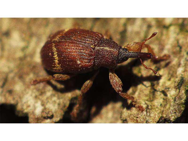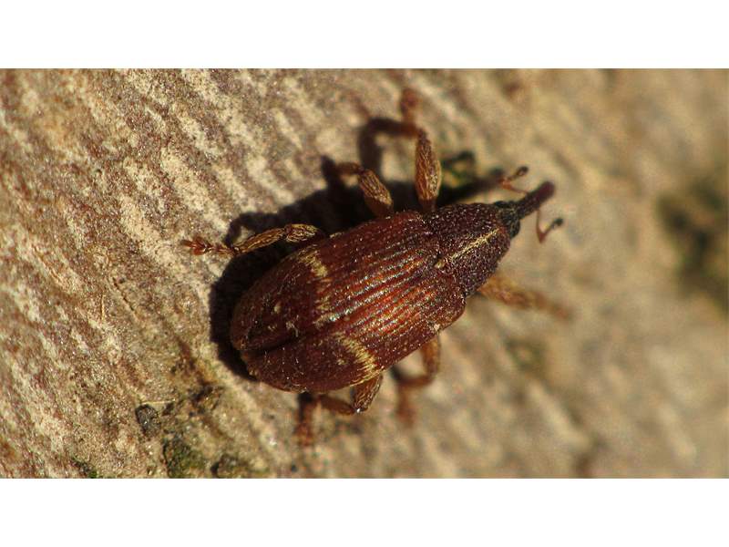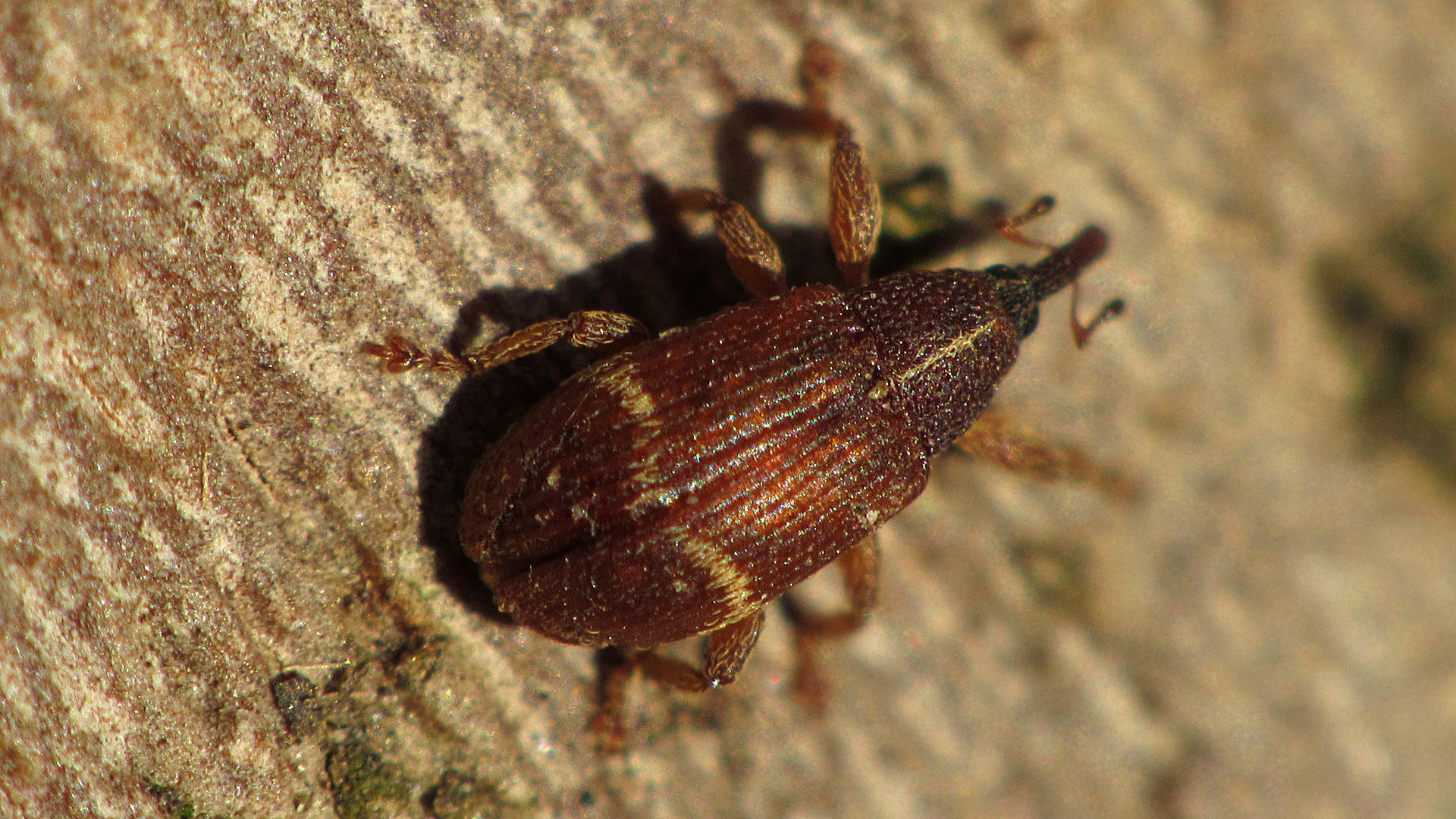 Gebänderter Ahorn-Fruchtstecher (Bradybatus fallax) auf Ahornblättrige Platane (Platanus × hispanica) im Hahnenholz, Leipzig, November 2013