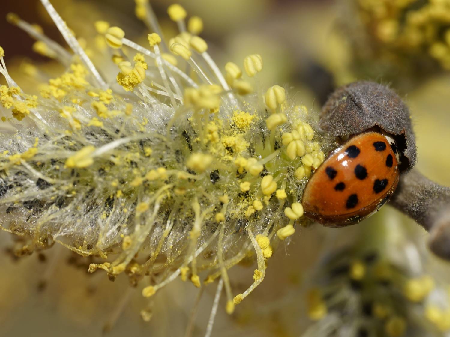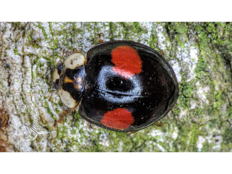 Asiatischer Marienkäfer (Harmonia axyridis) in schwarzer Grundfärbung, Gemarkung Hohenprießnitz, auf einer Weide (Salix) in der Muldeaue, März 2014