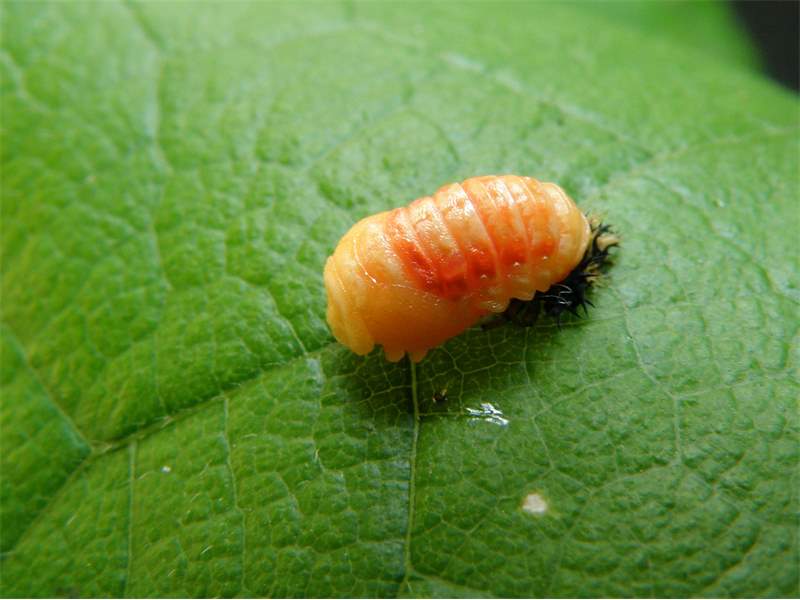 Puppe des asiatischen Marienkäfers, noch nicht vollständig ausgefärbt. Pretzschendorf, Juni 2012