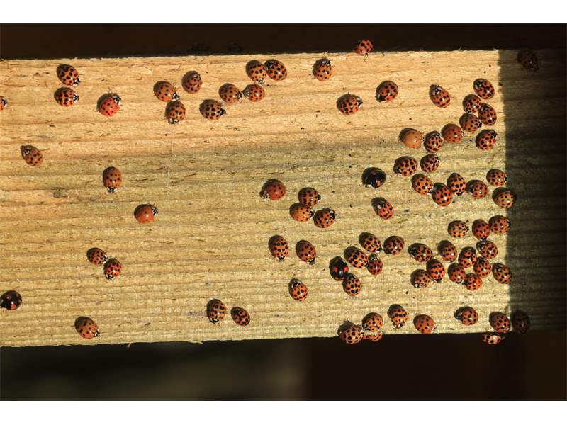 Variation des Asiatischen Marienkäfers an der sonnenbeschienenen Südostseite einer Hauswand. Radeberg im Oktober 2012