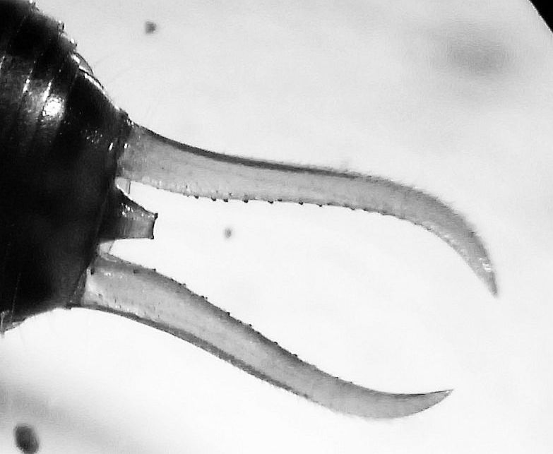 Beim Weibchen ist die Zange an der Basis breit abgeflacht, dann zylindrisch und spitz auslaufend, Innenrand mit scharfer Kante, die auch dunkler gefärbt und mit leichten Zähnchen versehen sein kann; Pygidium anders gestaltet als beim Männchen.
