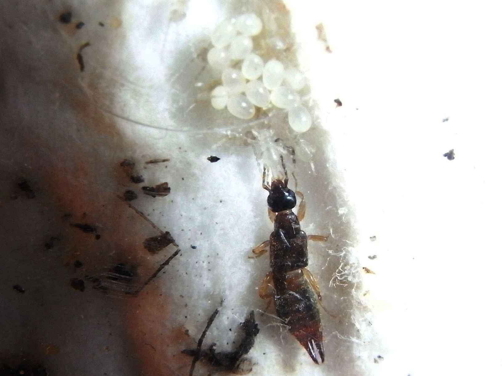 Weibchen des Kleinen Ohrwurms am Eigelege.