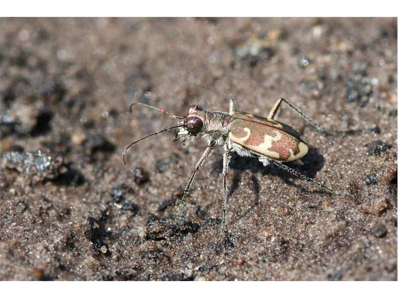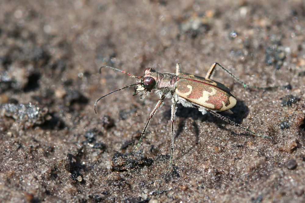 Ähnliche Arten: Bei Cicindela hybrida und Cicindela sylvicola sind alle weißen Makel voneinander getrennt.
