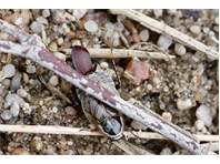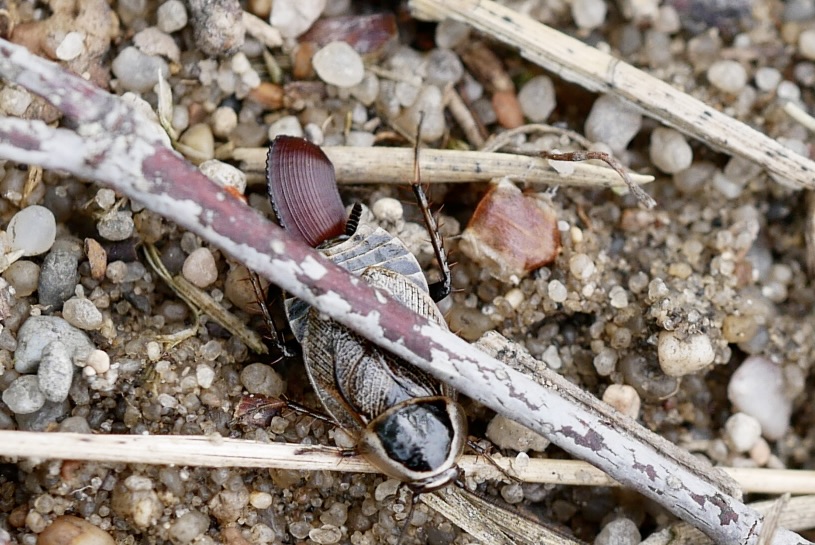 Thorax: Halsschild (Pronotum) dunkelbraun bis schwarz, die Seitenränder transparent, der Hinterrand kontrastreich hell gerandet. Männchen mit vollentwickelten Flügeln; Flügel der Weibchen verkürzt, so dass die schwarzen Abdominalsegmente sichtbar sind.