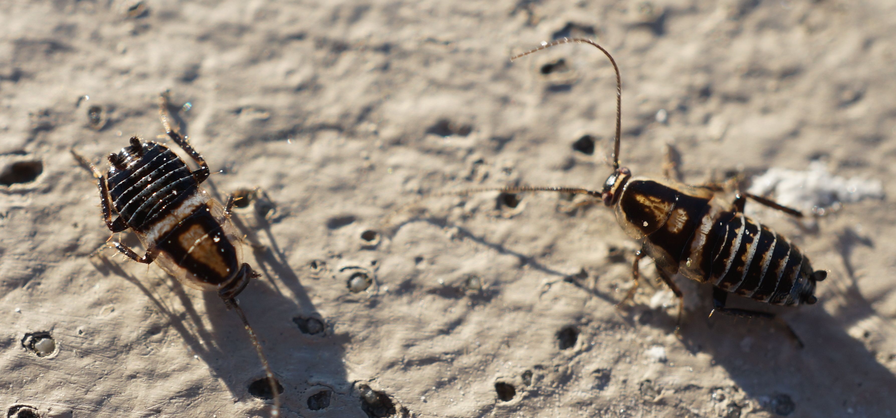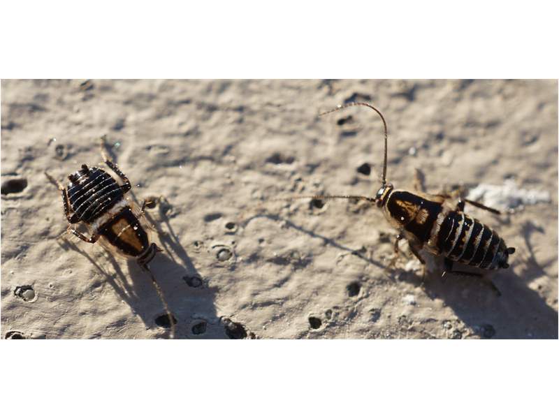 Küsten-Waldschaben am 25.06.2014 an der Strandpromenade von Warnemünde (Mecklenburg). Links weibliche, rechts männliche Larve (L5)