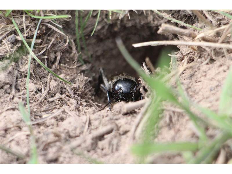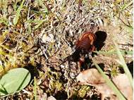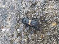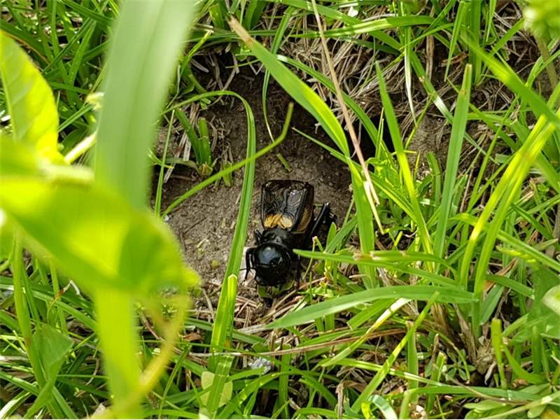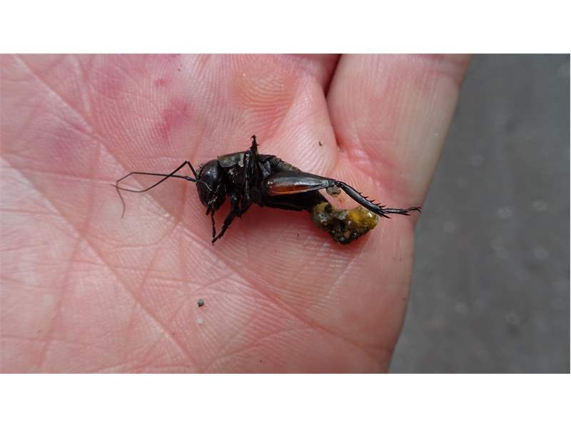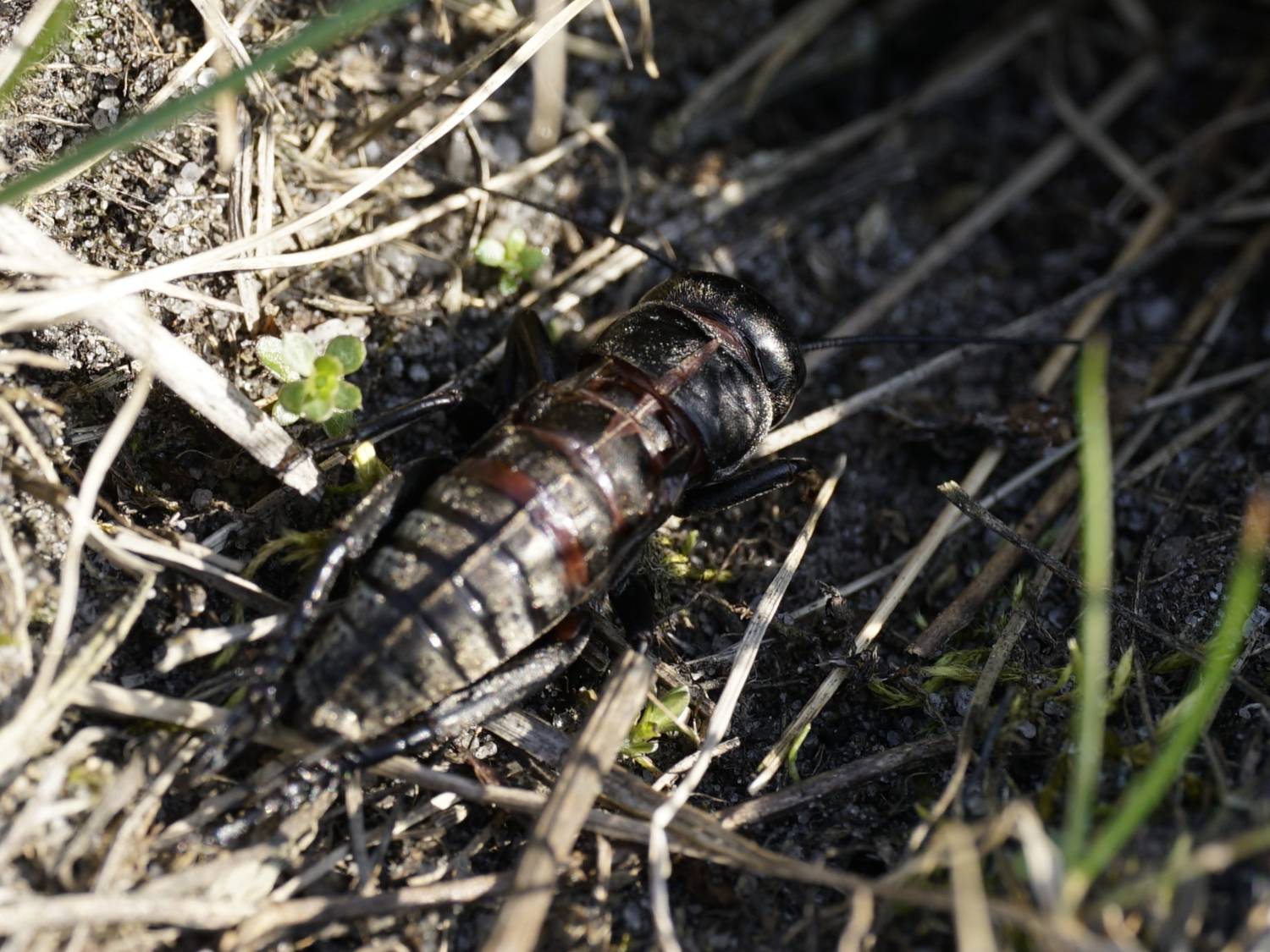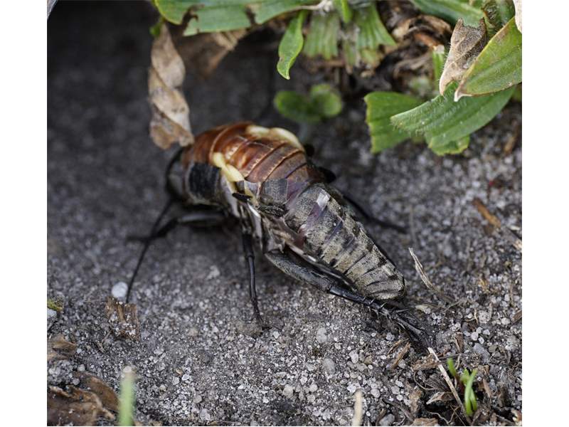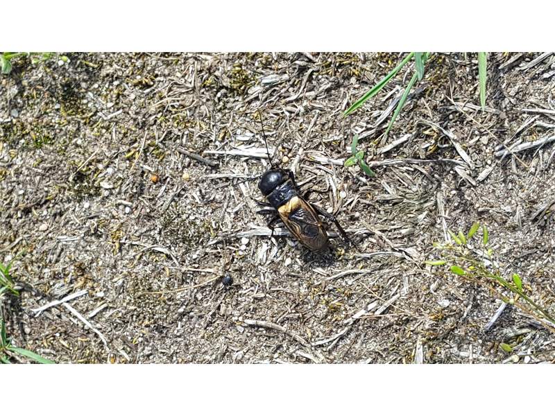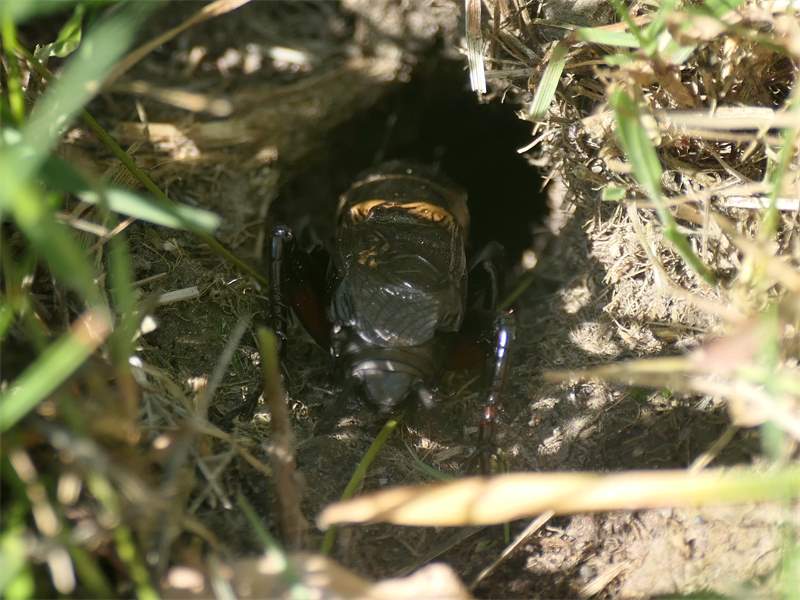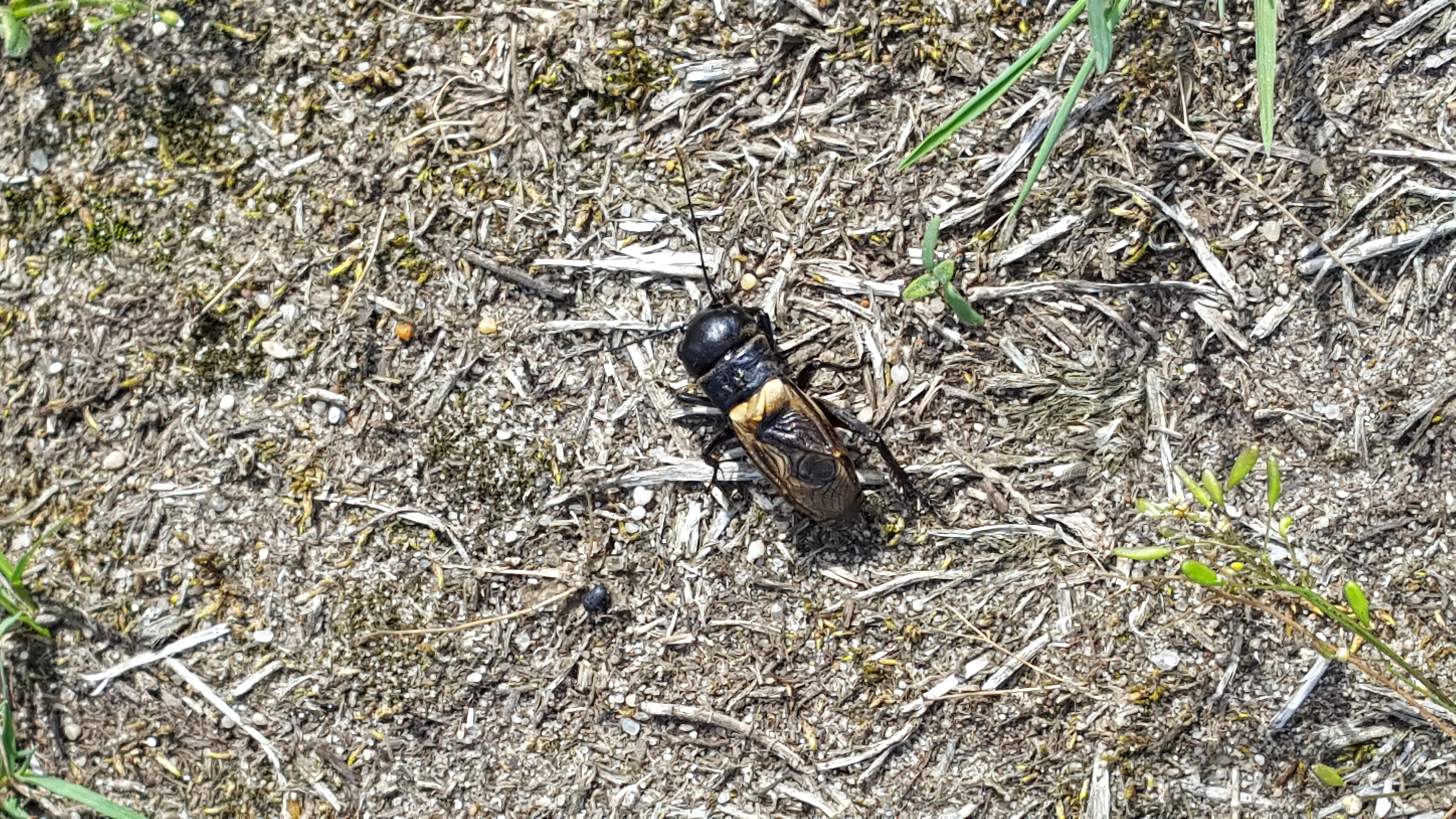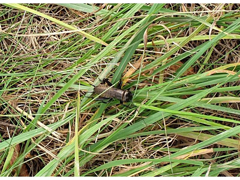 Grünanlage der Gemeinde nahe Feldrand, Ortsrand Ottendorf-Okrilla, 15.06.2020 13:15; überquert Fußweg, bleibt bei Annäherung sitzen; linkes Hinterbein fehlt, linke Antenne verkürzt (© Tim Hutschenreiter)( Bild vergrößern)