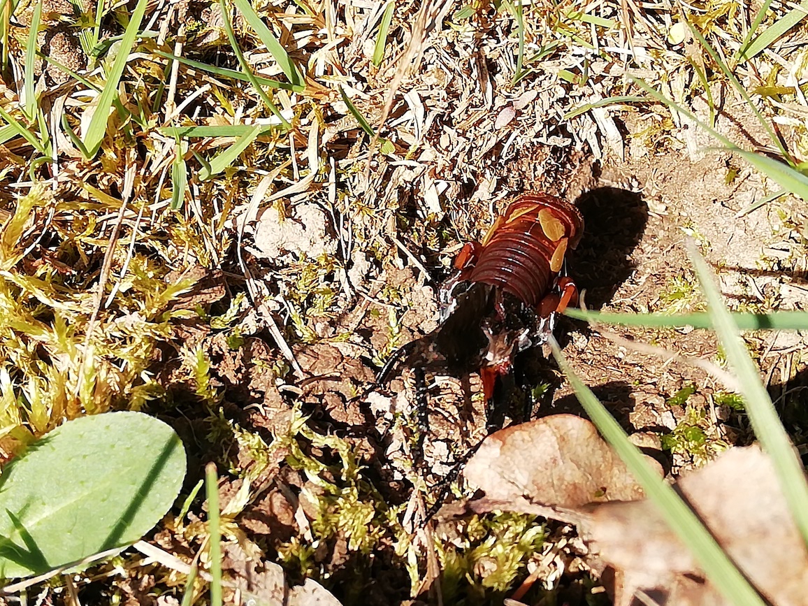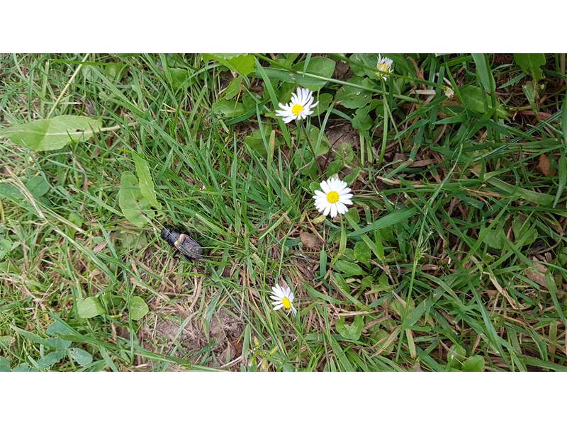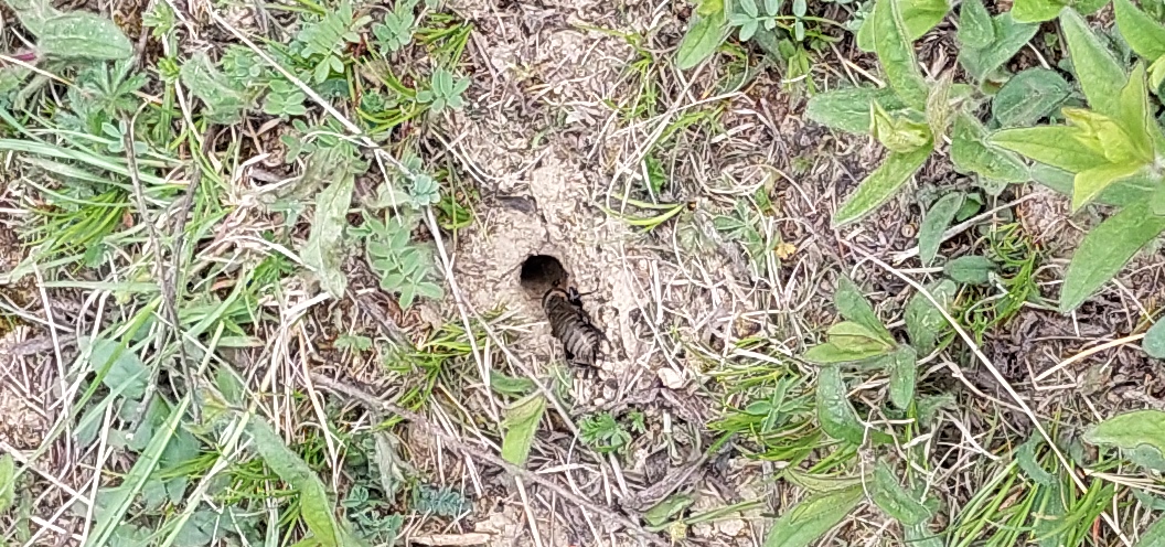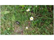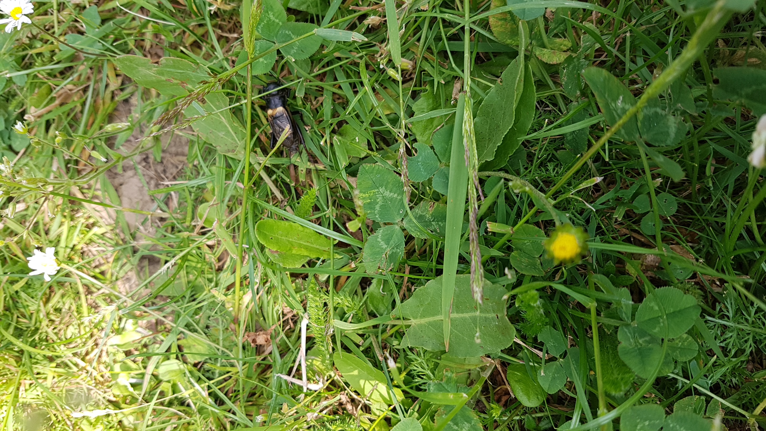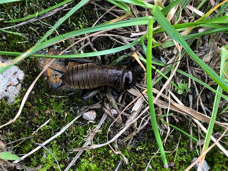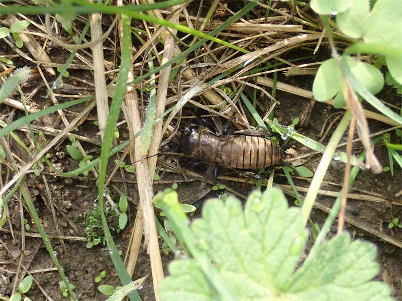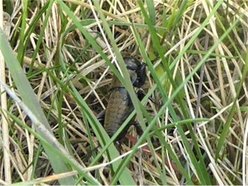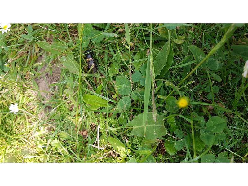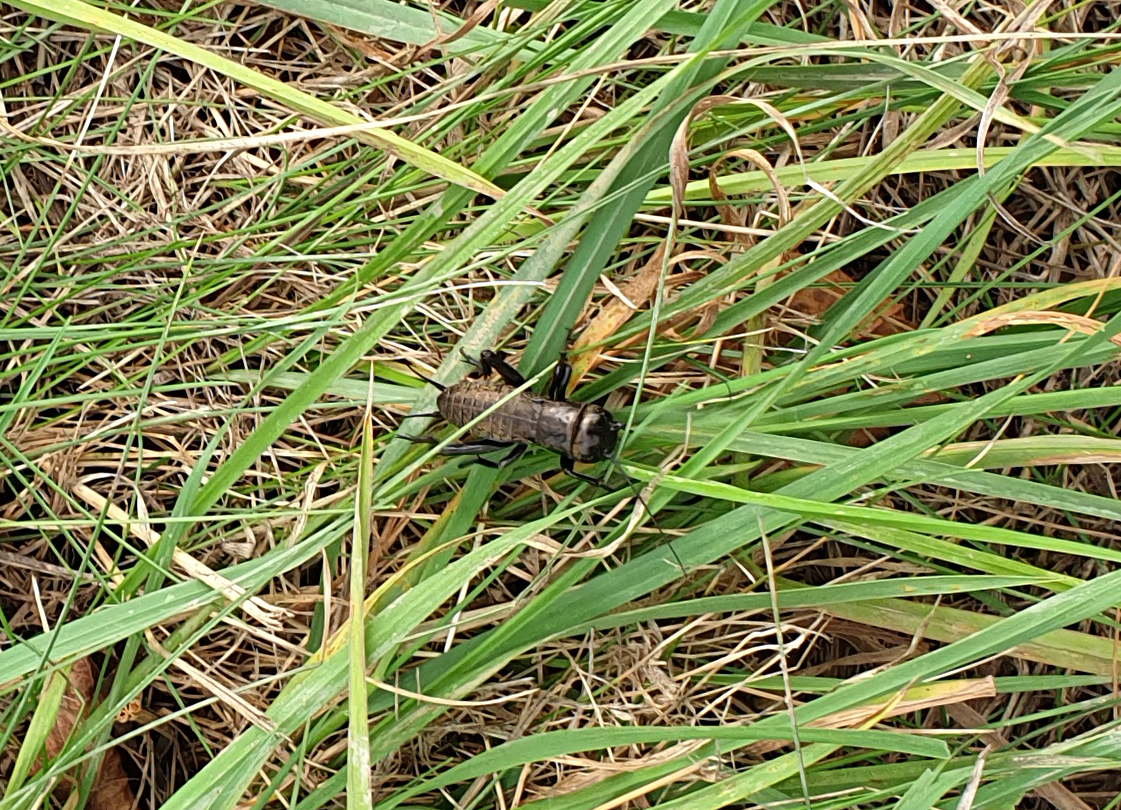 Grünanlage der Gemeinde nahe Feldrand, Ortsrand Ottendorf-Okrilla, 15.06.2020 13:15; überquert Fußweg, bleibt bei Annäherung sitzen; linkes Hinterbein fehlt, linke Antenne verkürzt