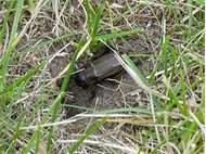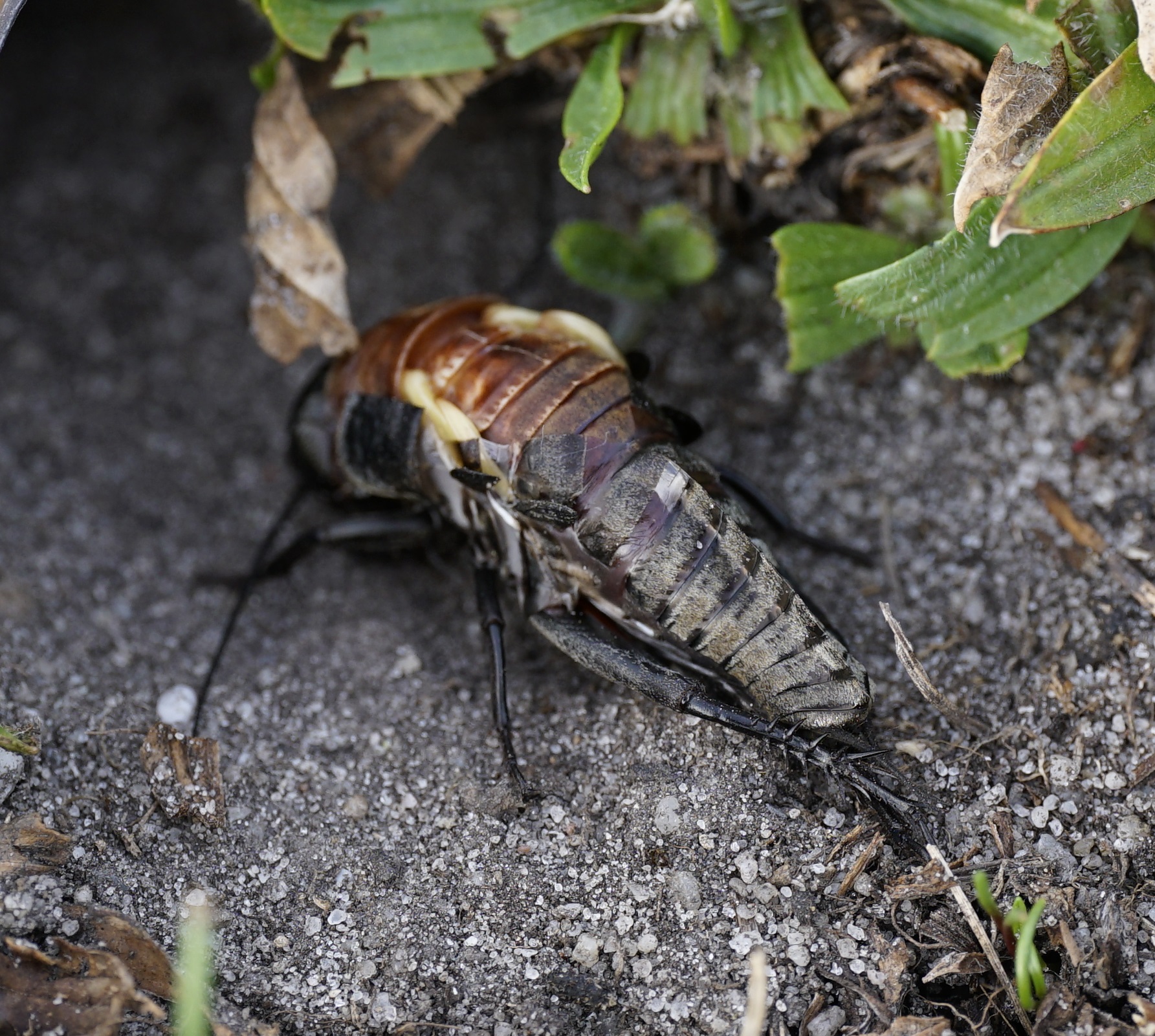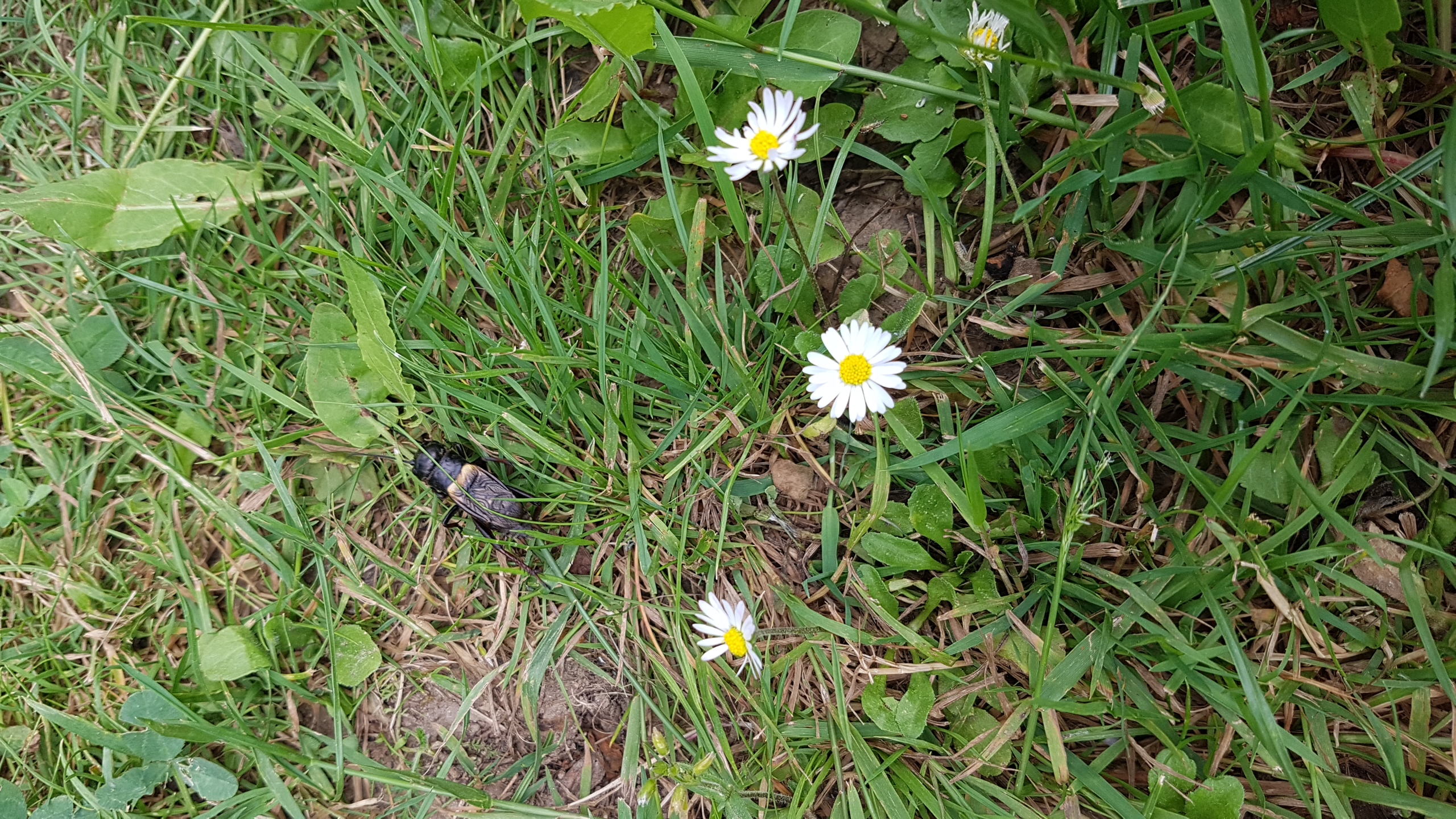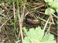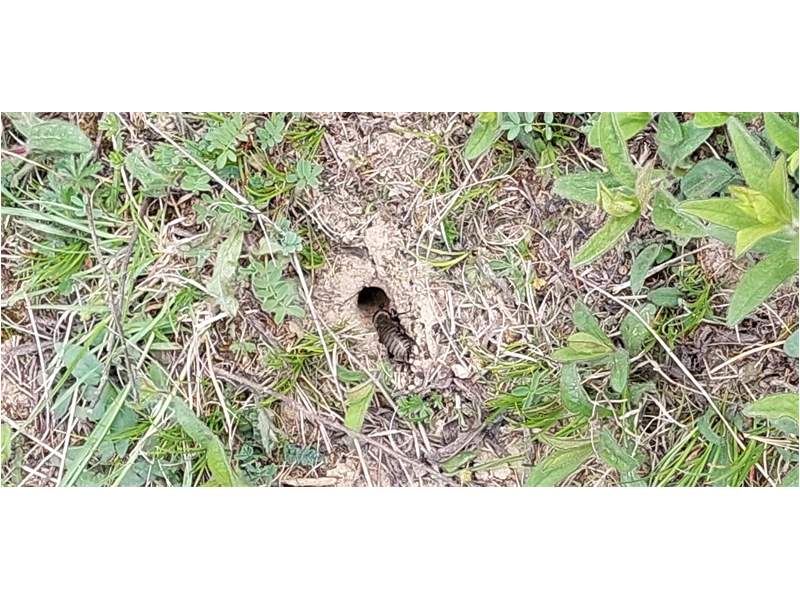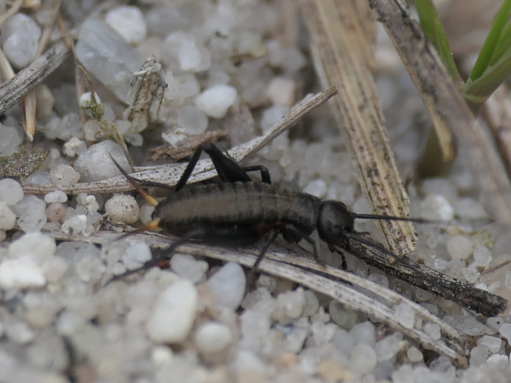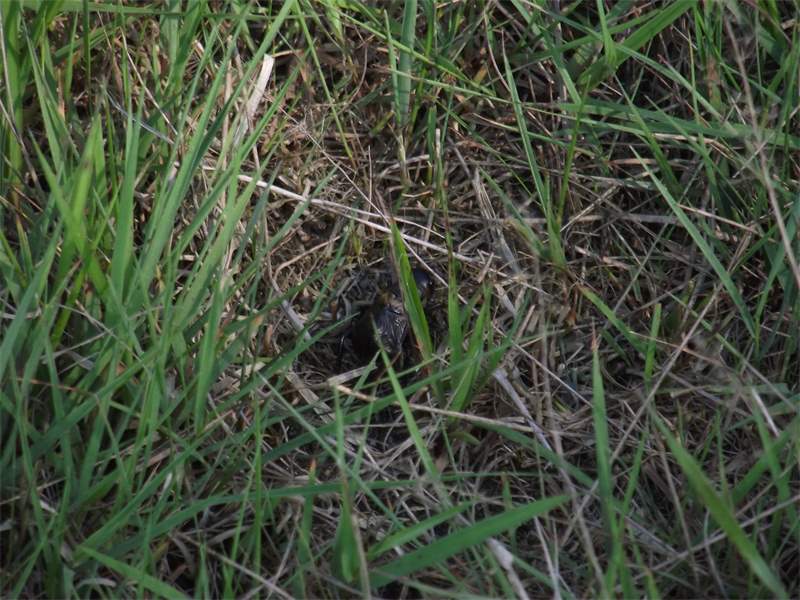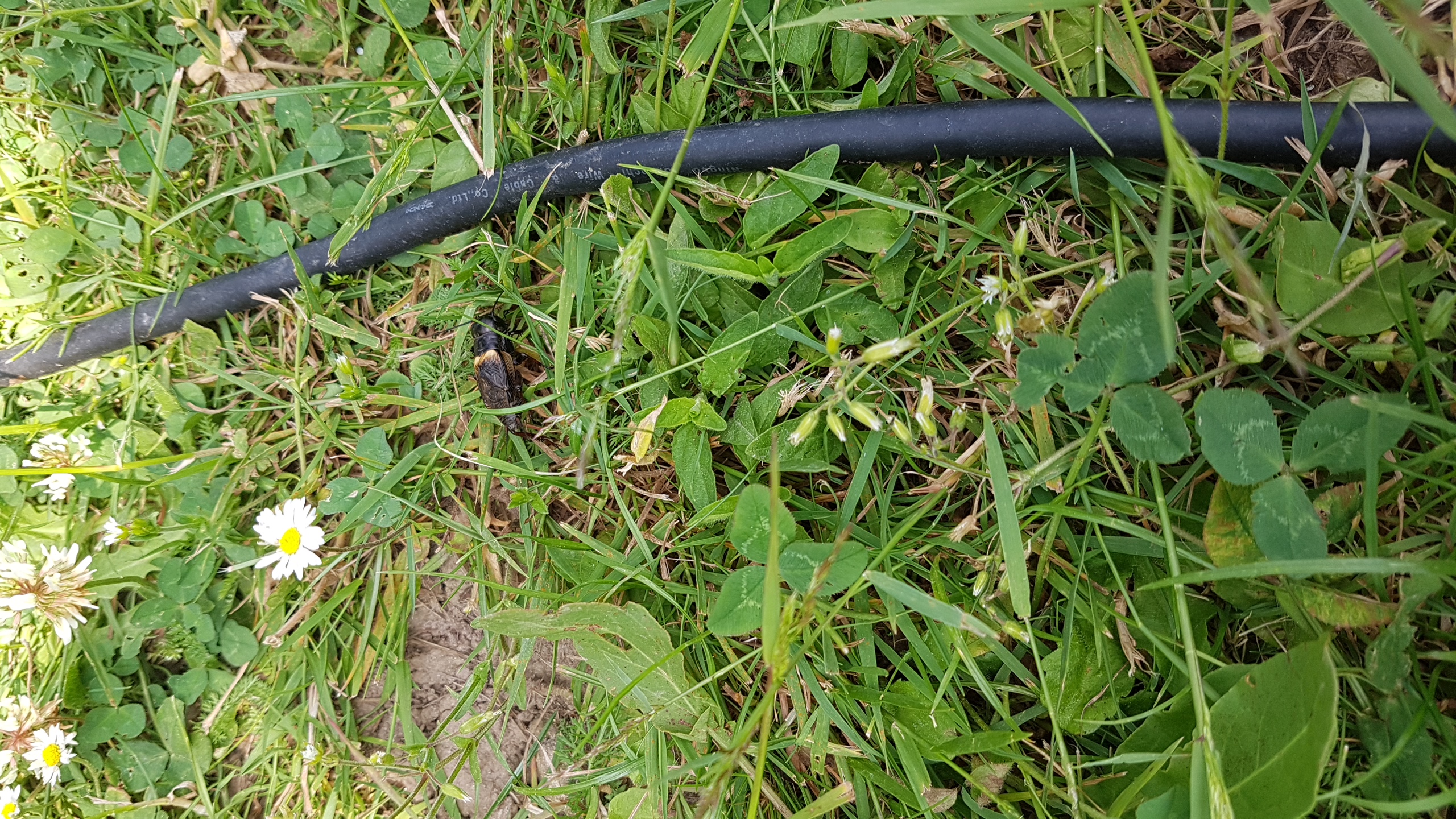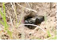 Grünanlage der Gemeinde nahe Feldrand, Ortsrand Ottendorf-Okrilla, 15.06.2020 13:15; überquert Fußweg, bleibt bei Annäherung sitzen; linkes Hinterbein fehlt, linke Antenne verkürzt