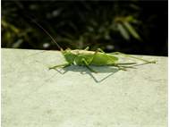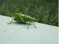 Weibliche Zwitscherschrecke am 10.08.2010 auf einem Geländer an der Prießnitz in Glashütte