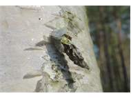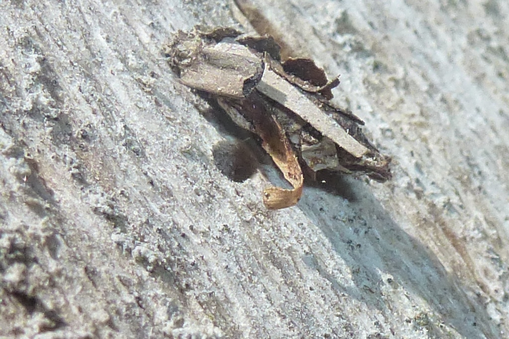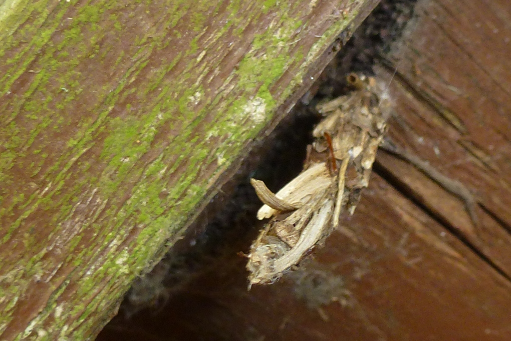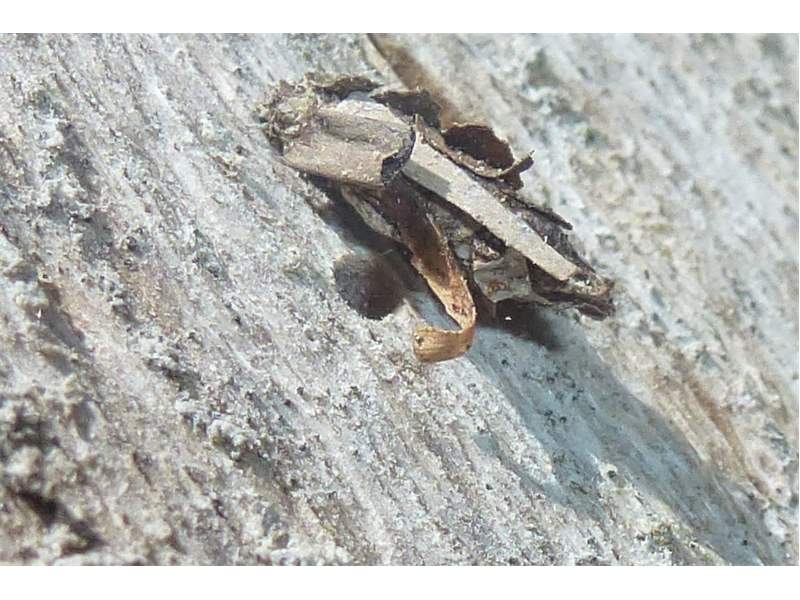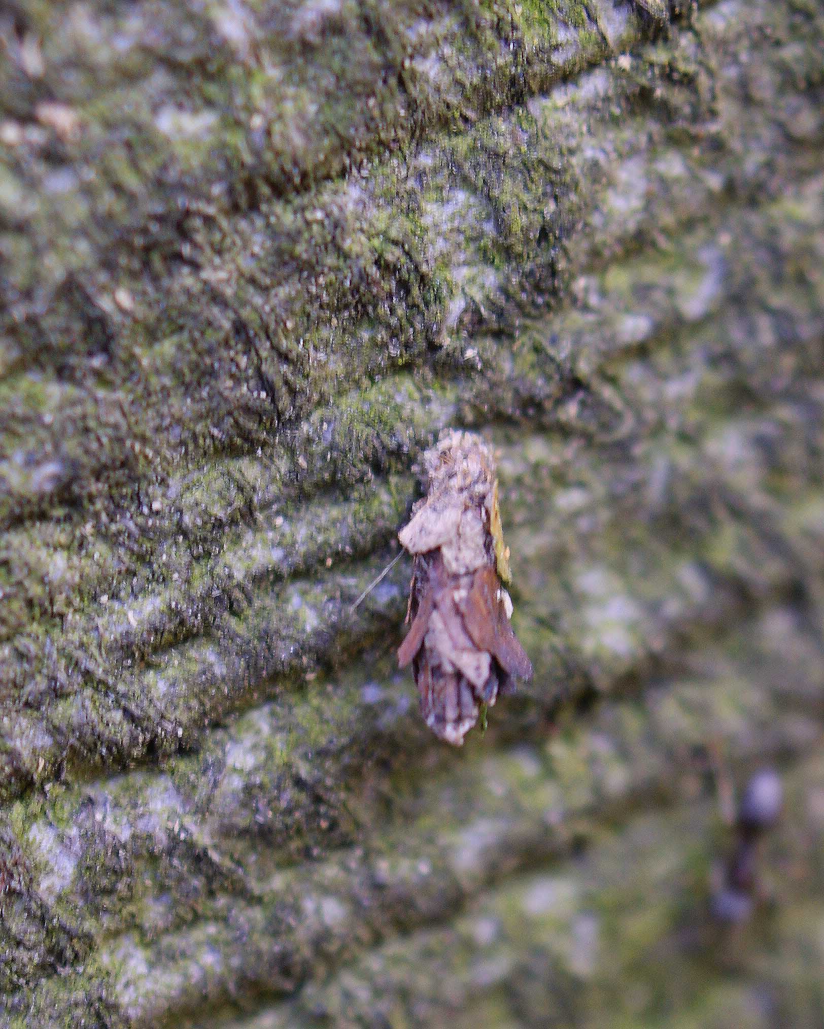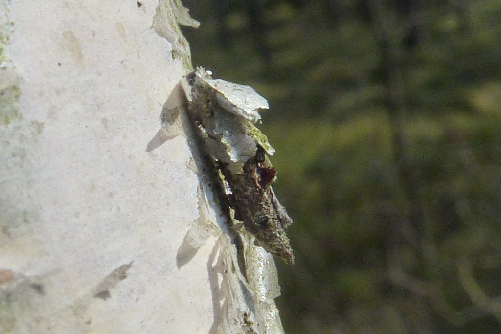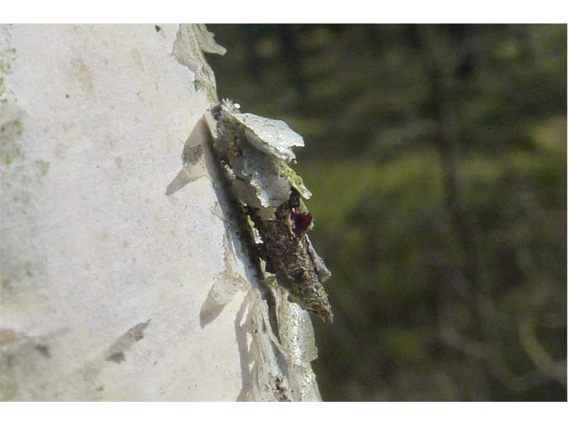 Larvensack von Proutia betulina an Rotbuchenstamm in der Laußnitzer Heide, April 2013