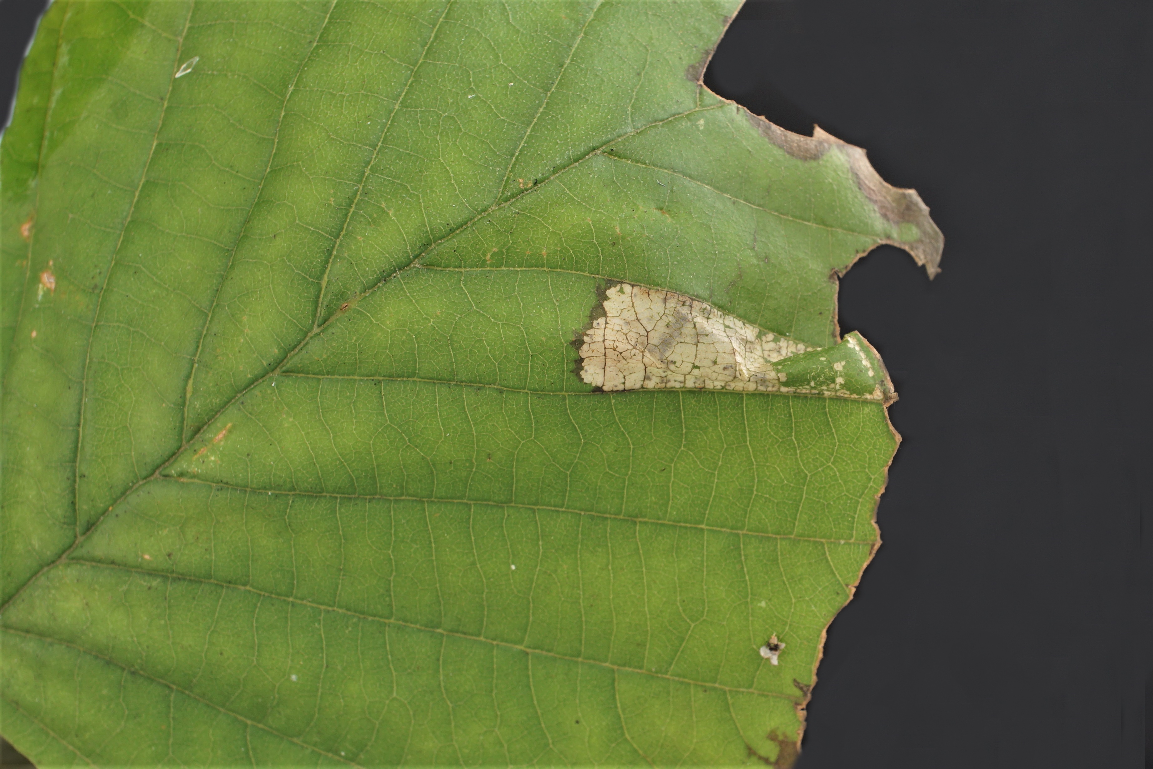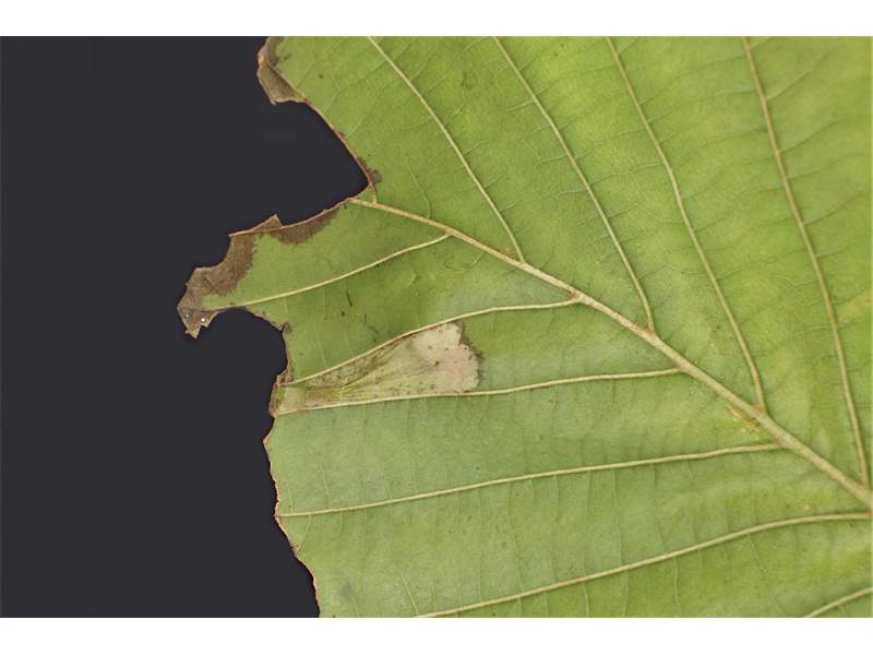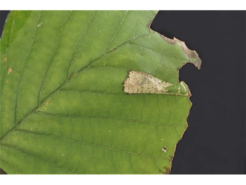 Mine: Faltenmine an der Blattunterseite von Schwarz-Erle (Alnus glutinosa), meist abseits der Mittelrippe zwischen zwei Seitenrippen.