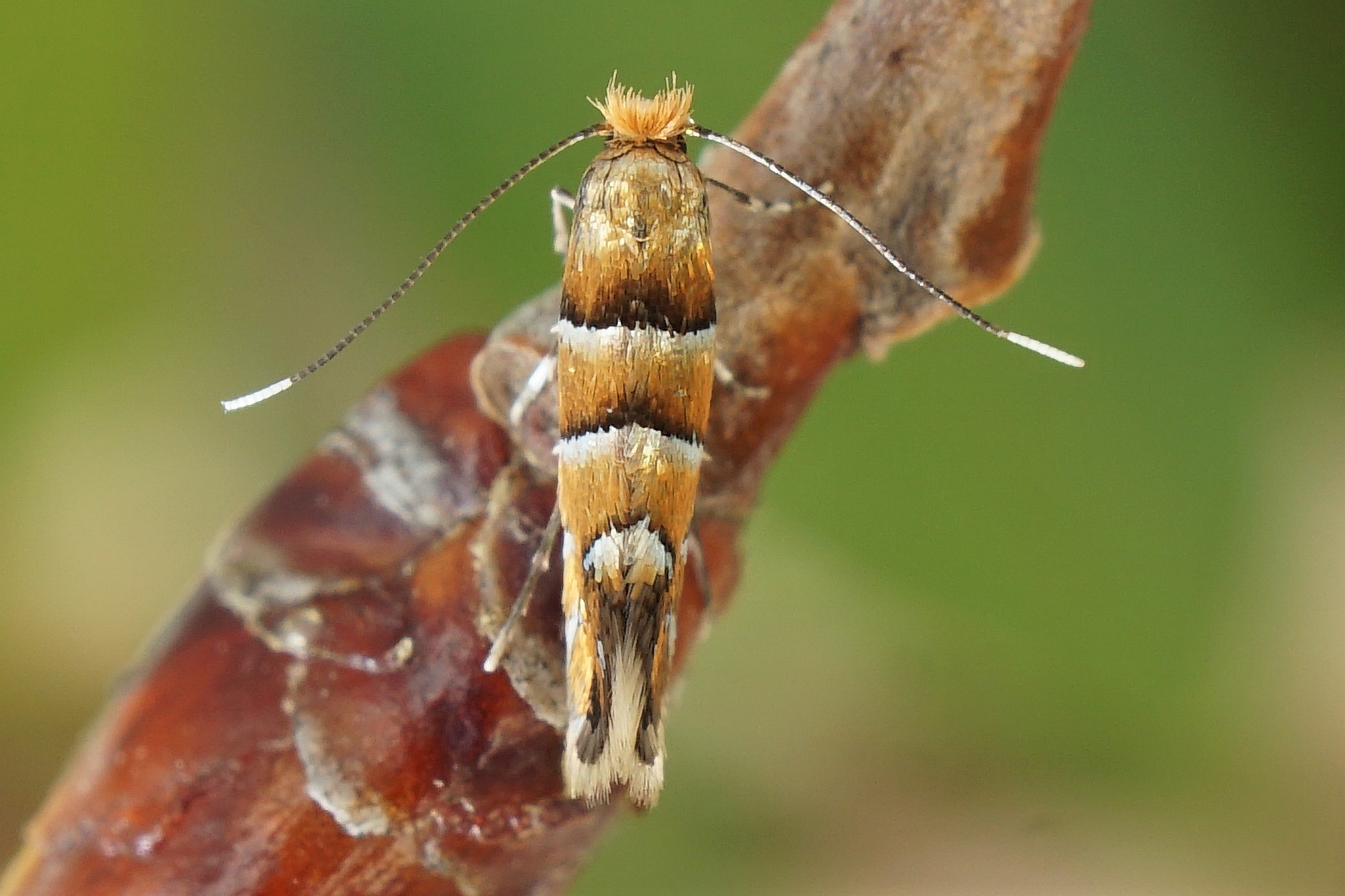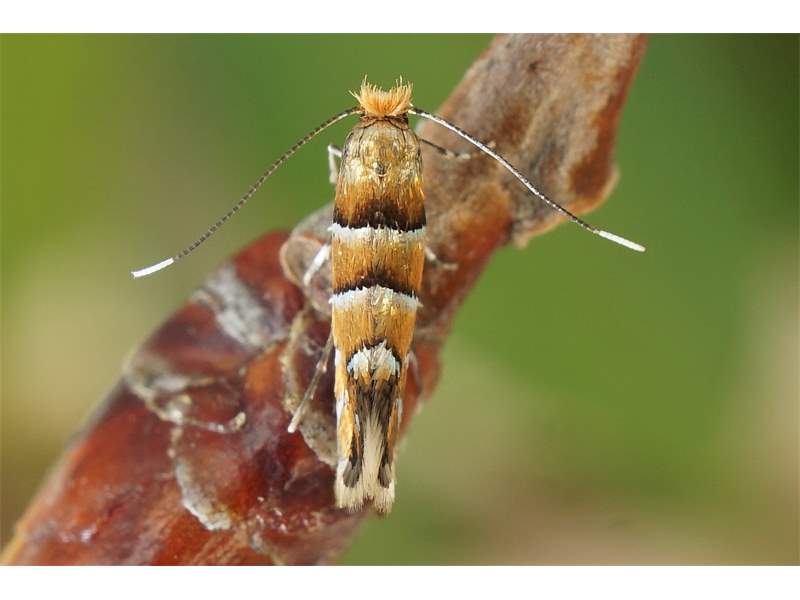 Kopf: Fühler schwarz mit weißen Endgliedern, Stirn weiß, Schopf ocker.