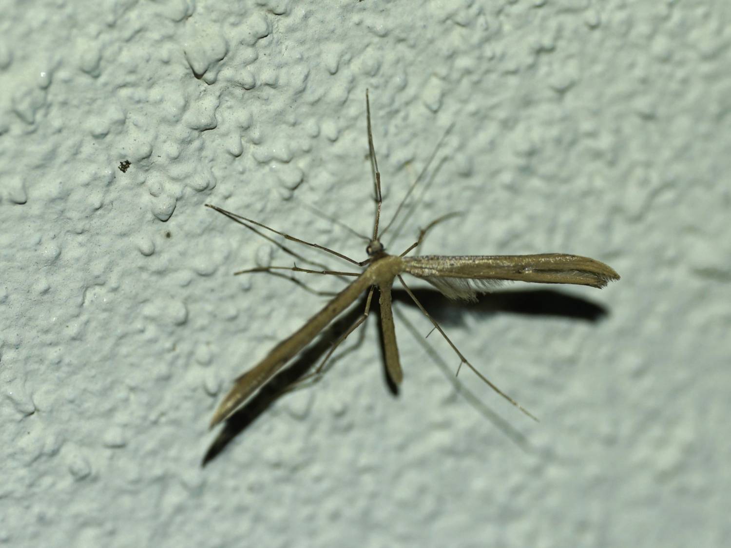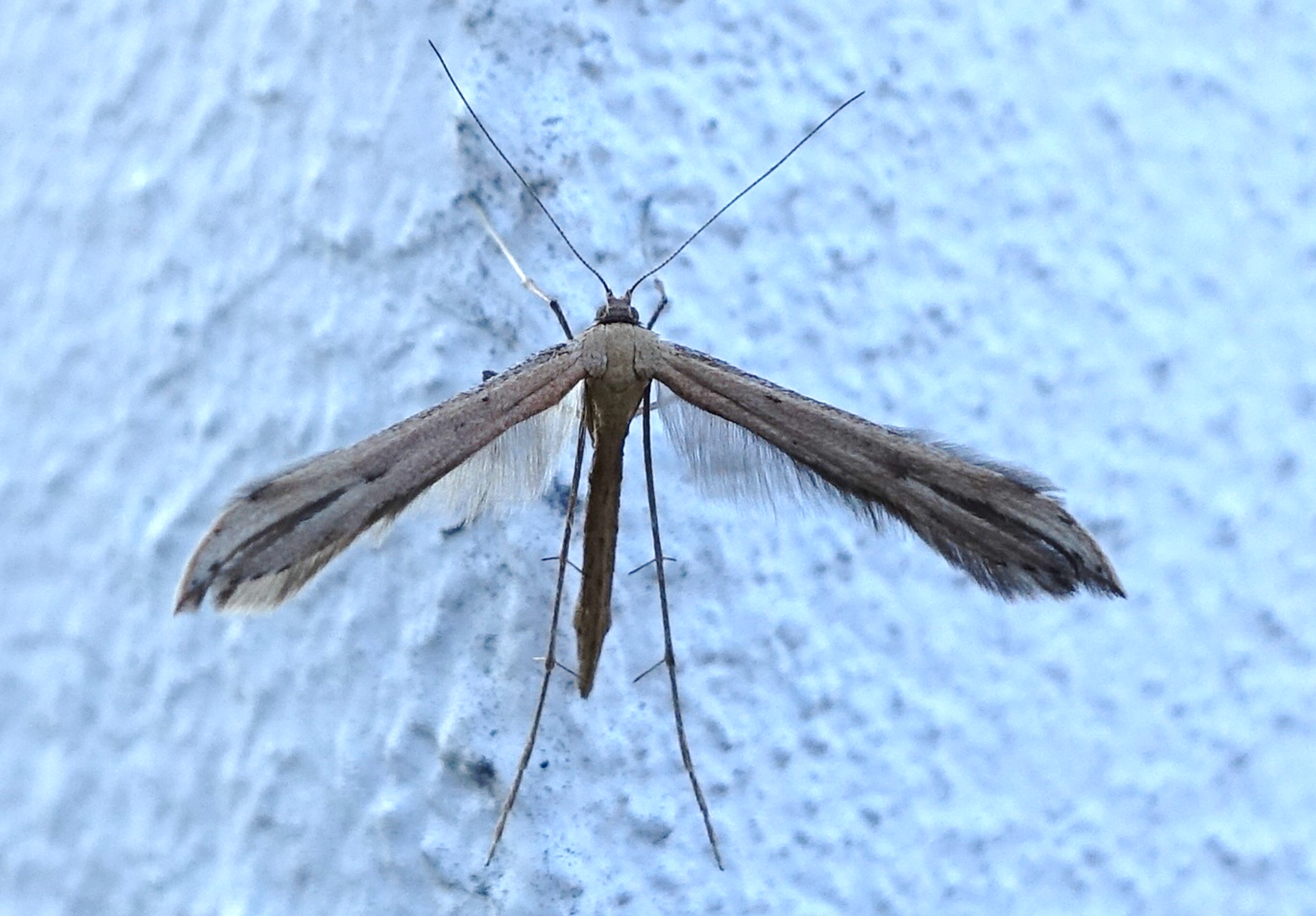 Emmelina monodactyla (Linnaeus, 1758) am 27.02.2019 in Hoyerswerda Dresdener Straße an einer Gartenmauer