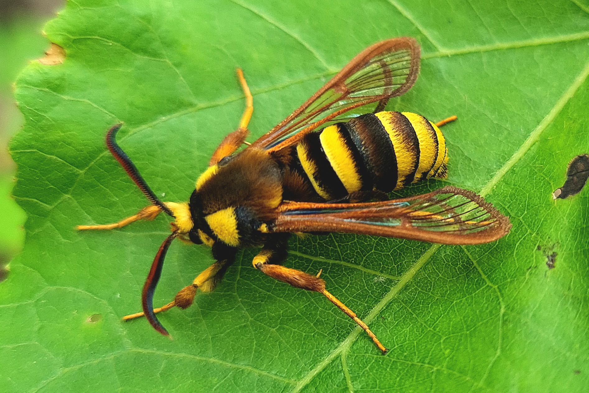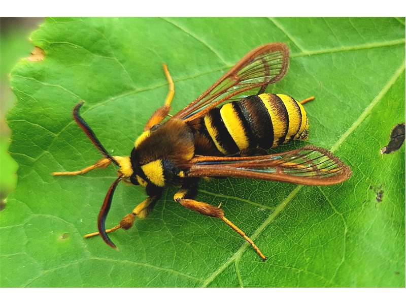 Hinterleib: abwechselnd schwarz und gelb beschuppt (wespenähnlich, Batessche Mimikry).