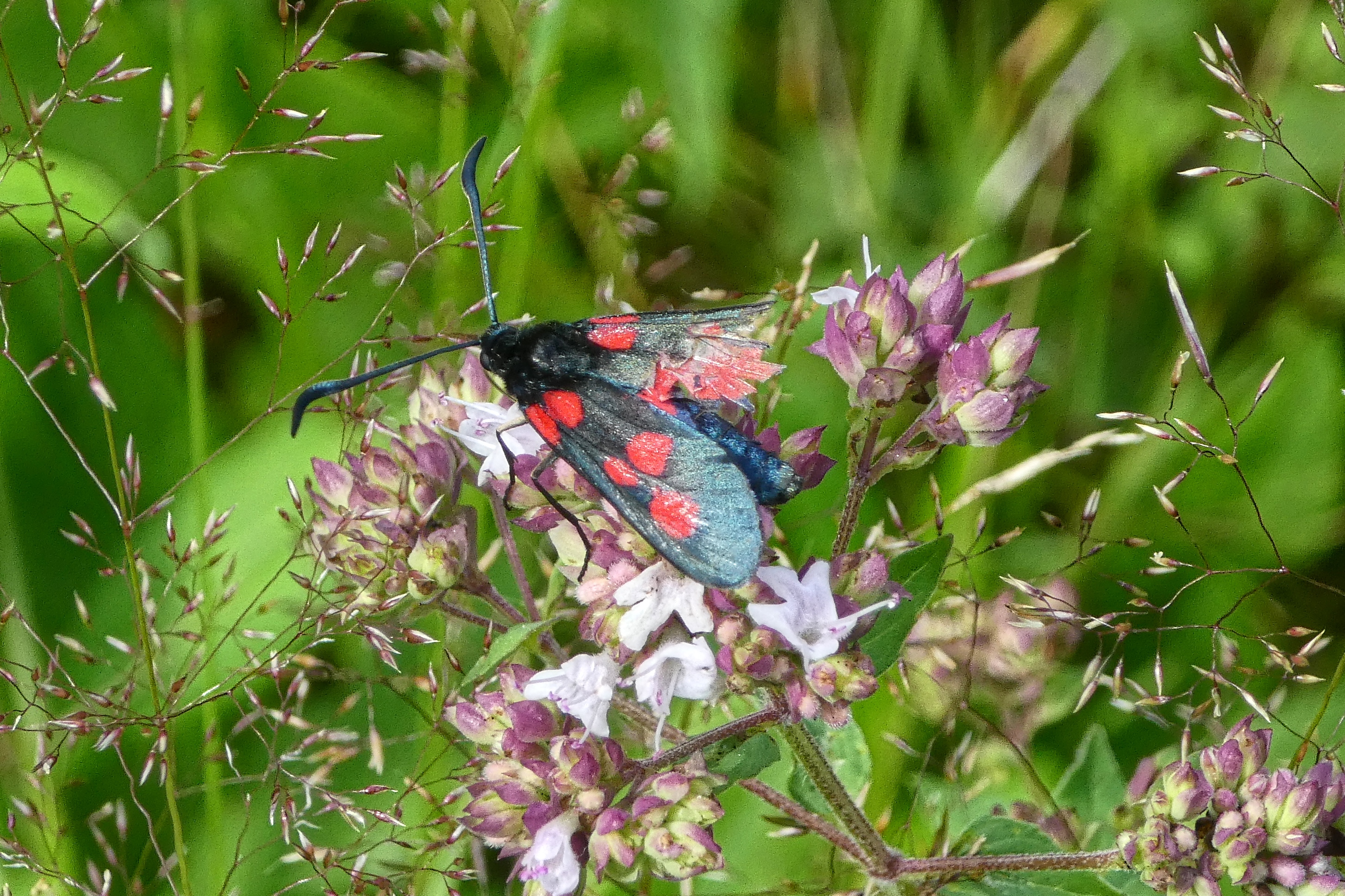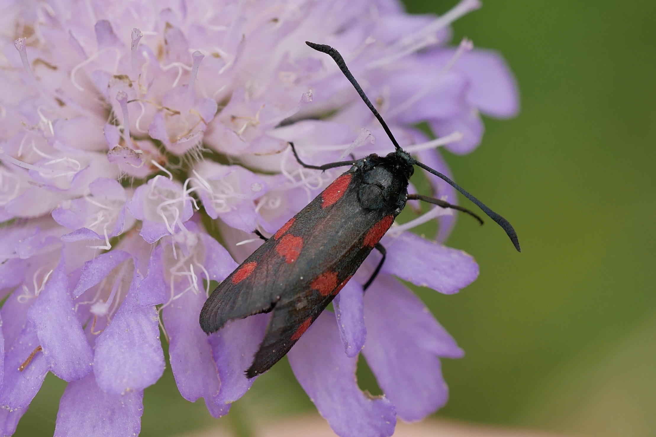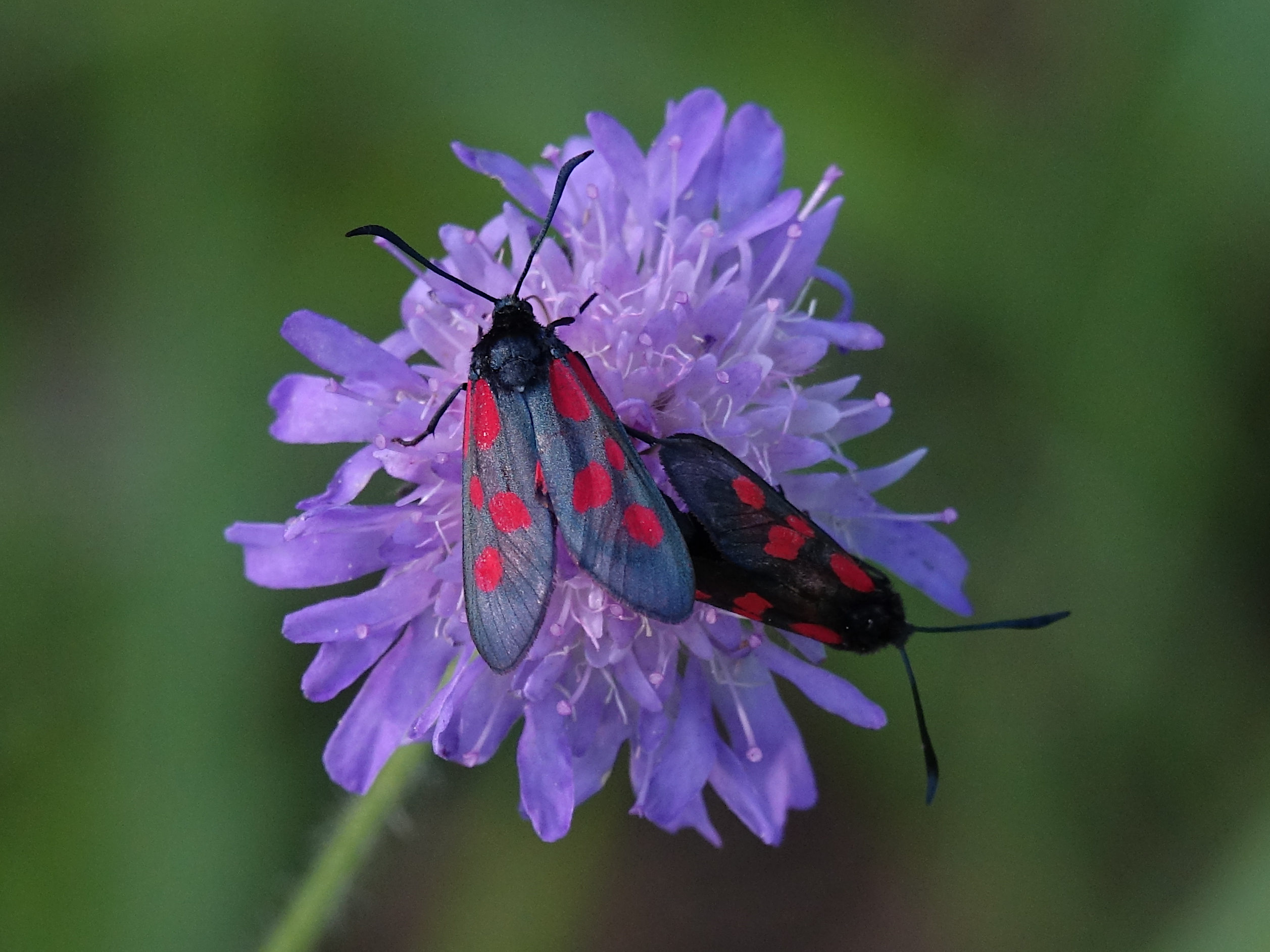 Kleines Fünffleckwidderchen (Zygaena viciae (Denis & Schiffermüller, 1775)),es wurden im Ödlandbereich mehrere Tiere beobachtet, Zwickau, Juni 2018