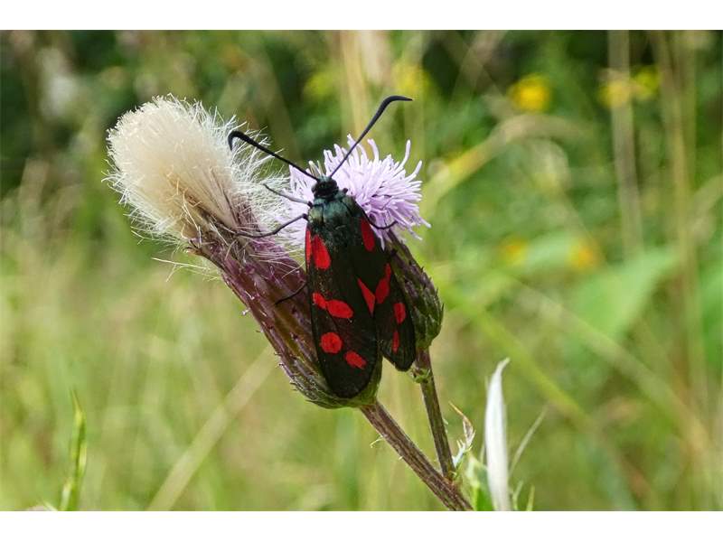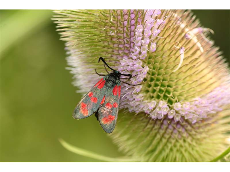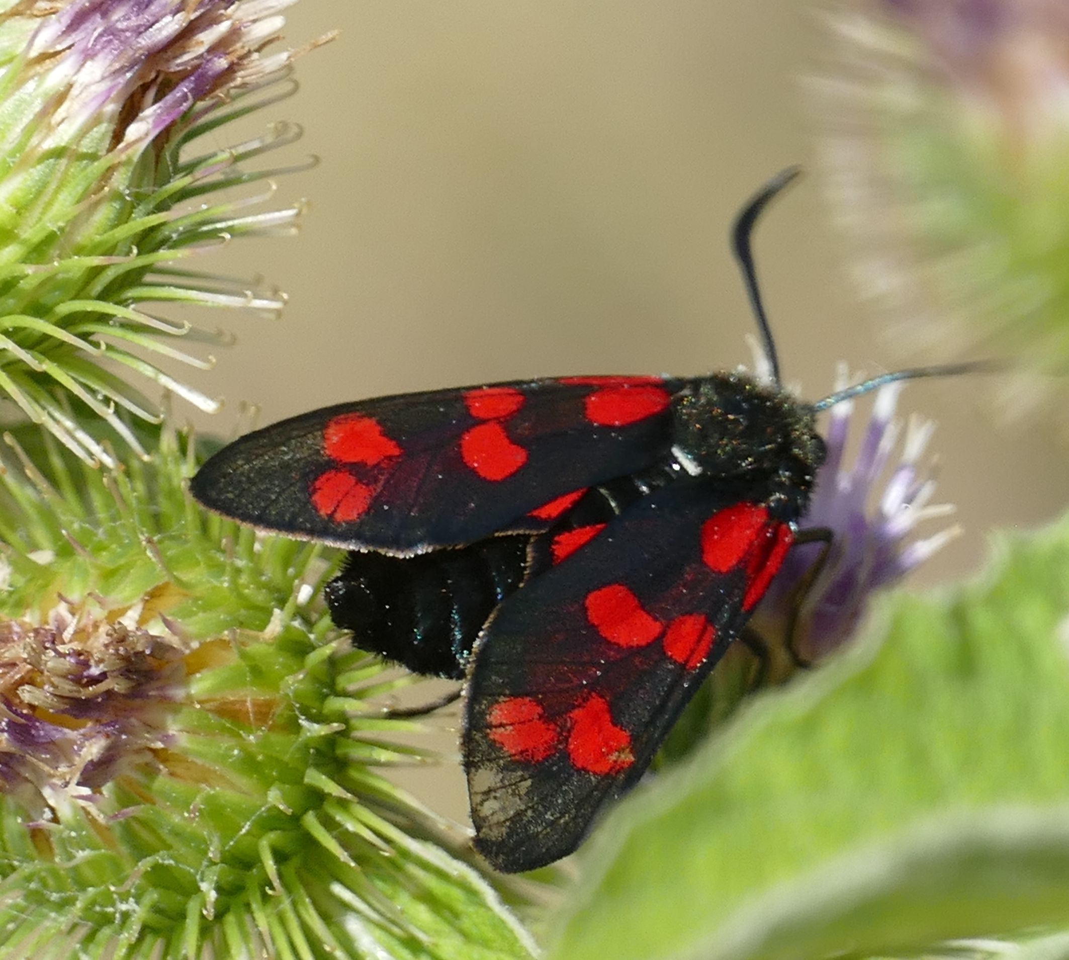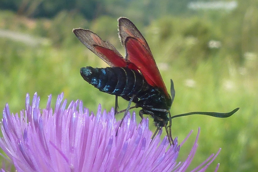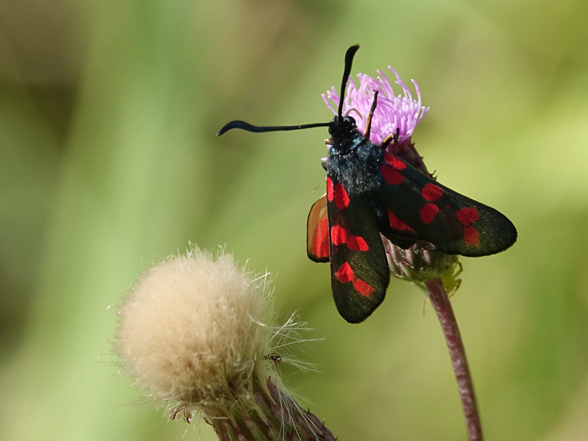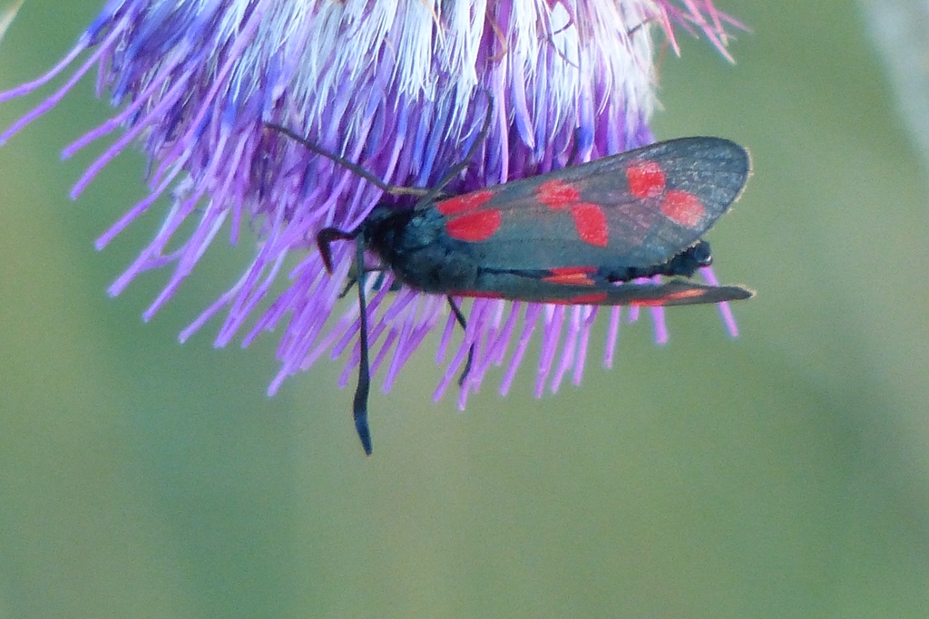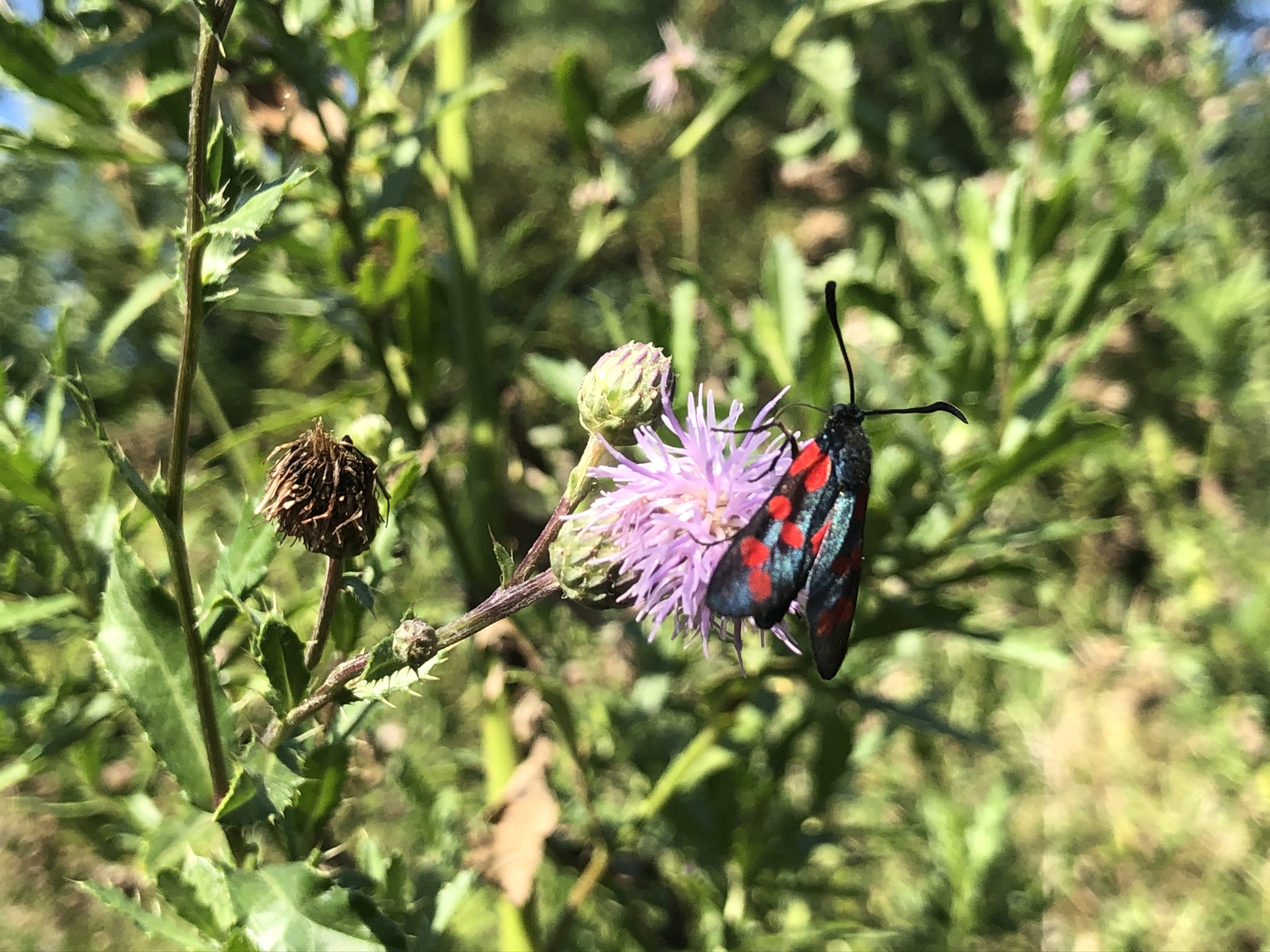 Sechsfleck-Widderchen (Zygaena filipendulae (Linnaeus, 1758)),Freital/Wurgwitz,Hammerteich,Wegrand auf Kratzdistel,Aug.2019