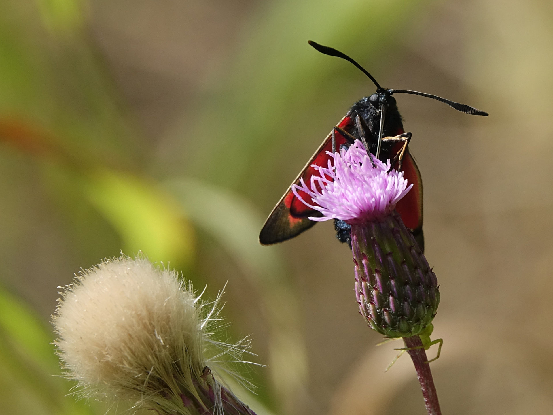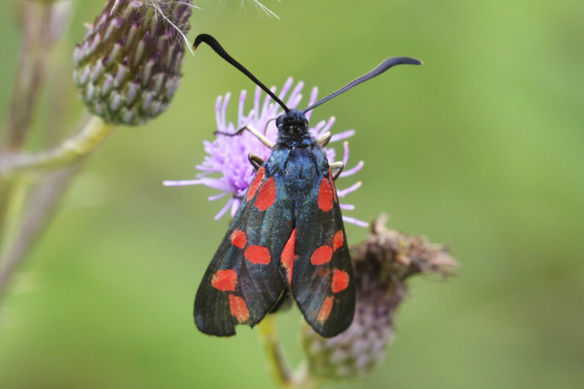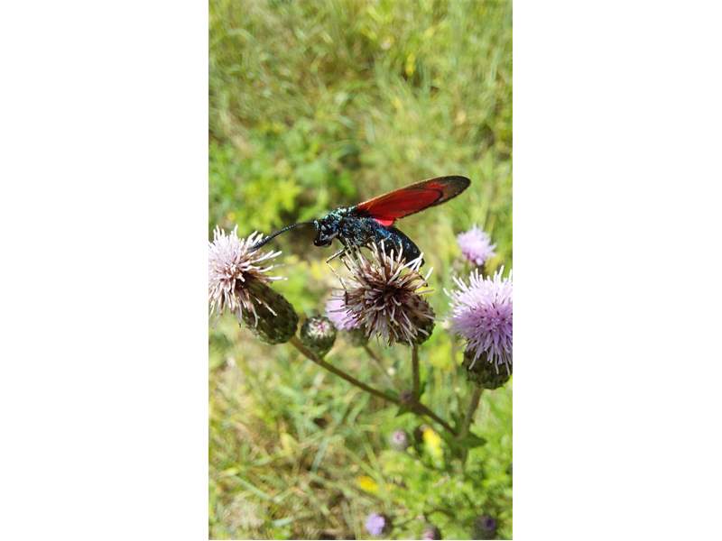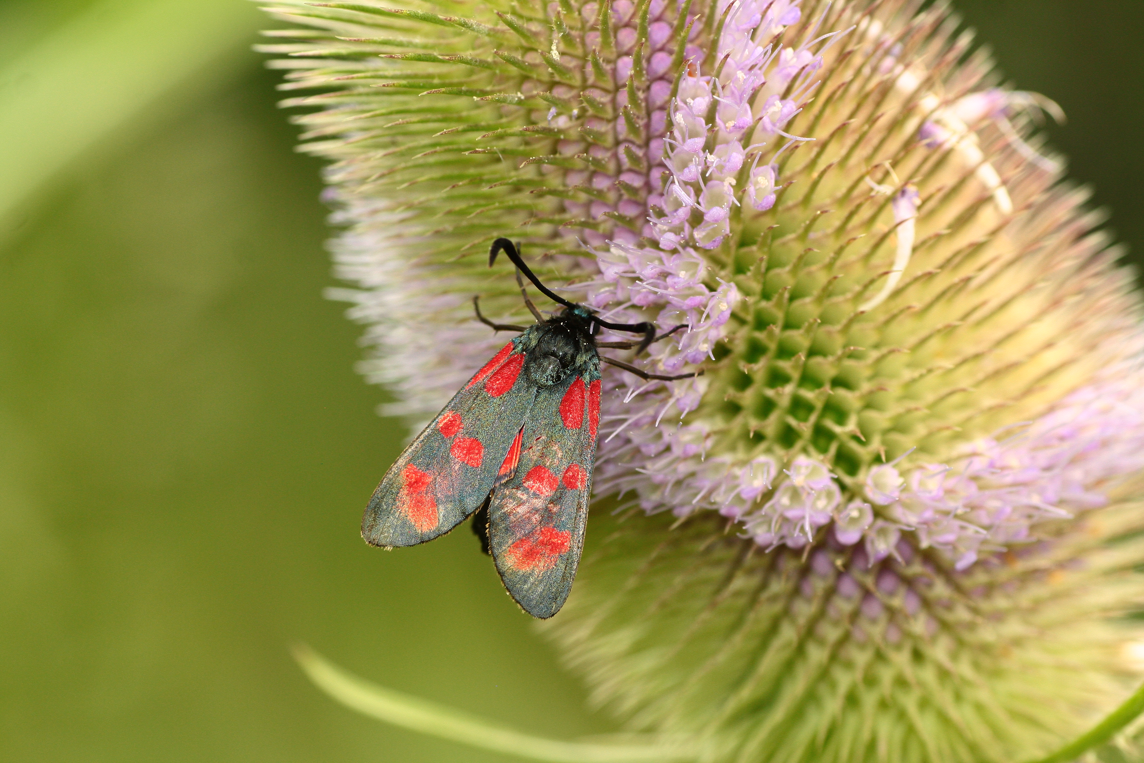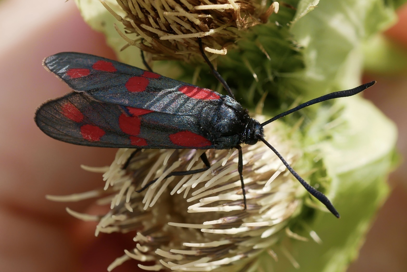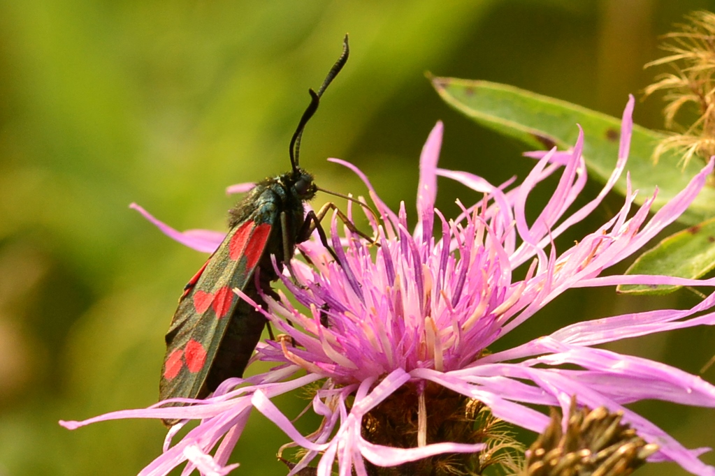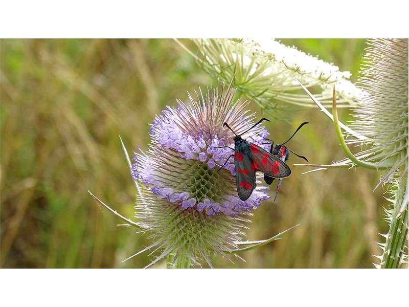 Sechsfleck-Widderchen (Zygaena filipendulae (Linnaeus, 1758)),Freital/Wurgwitz,Hammerteich,Wegrand auf Kratzdistel,Aug.2019