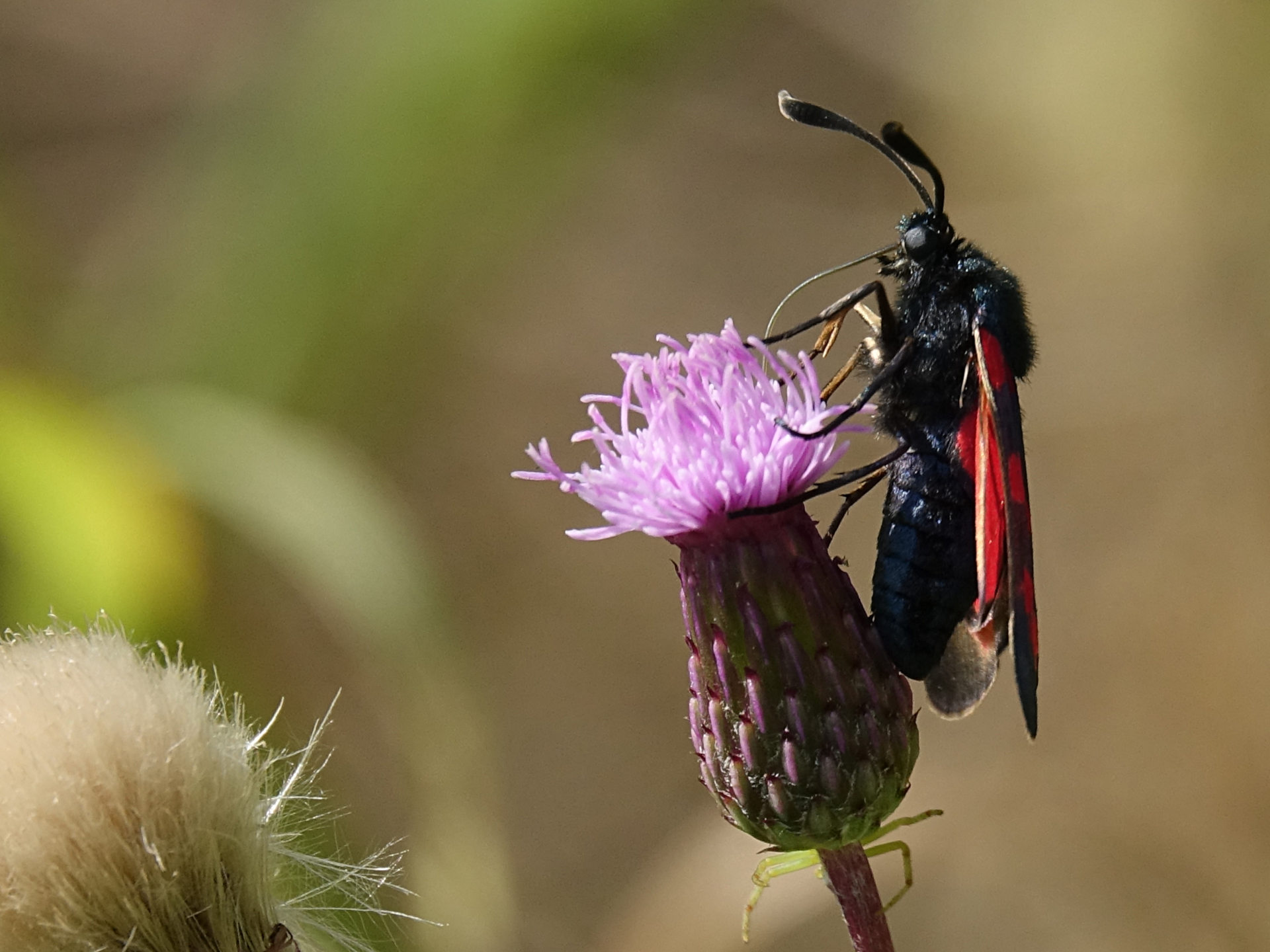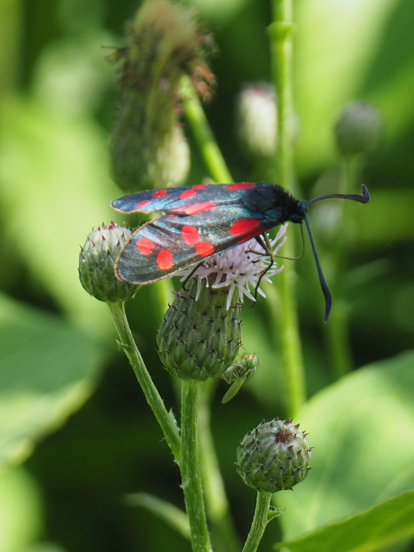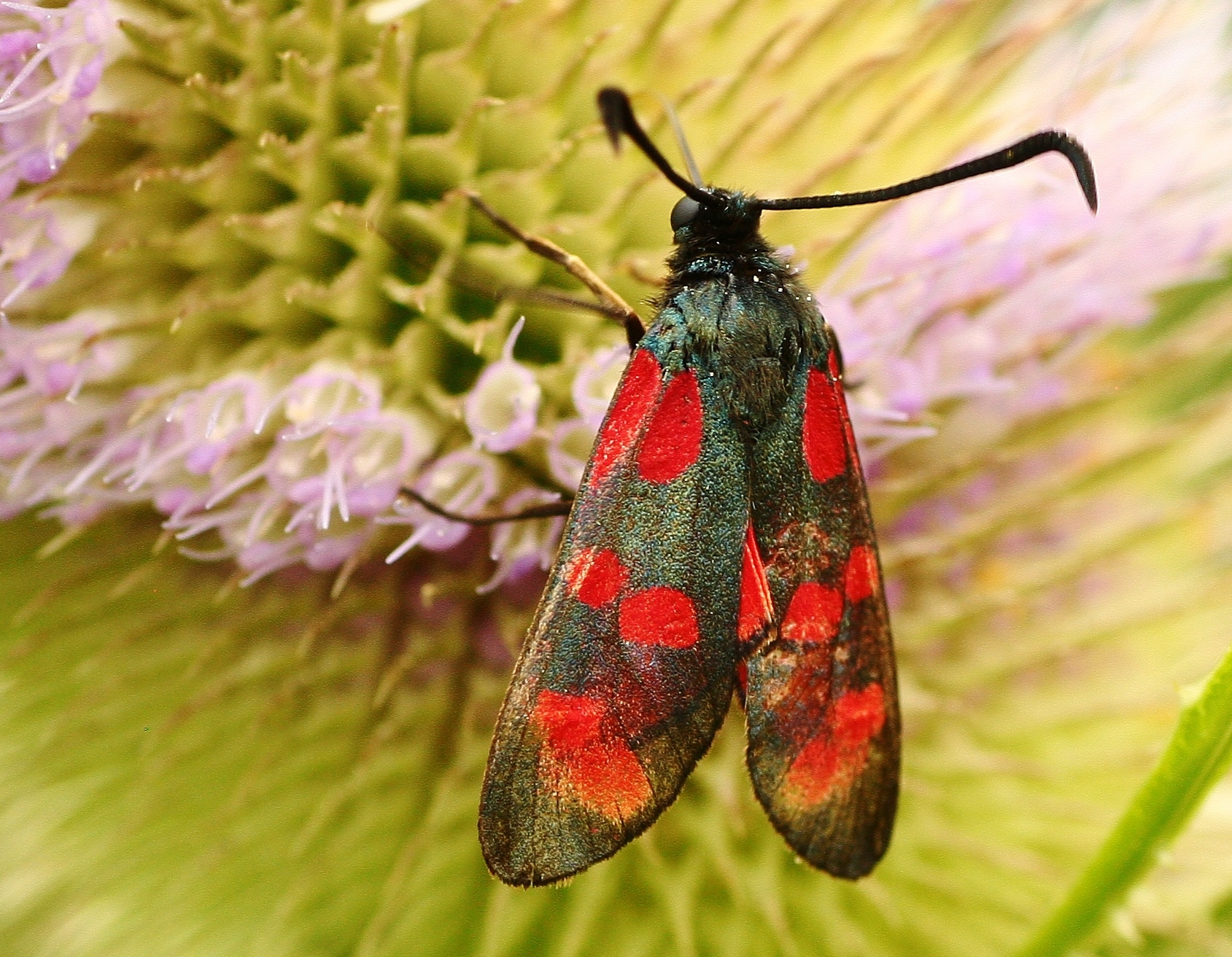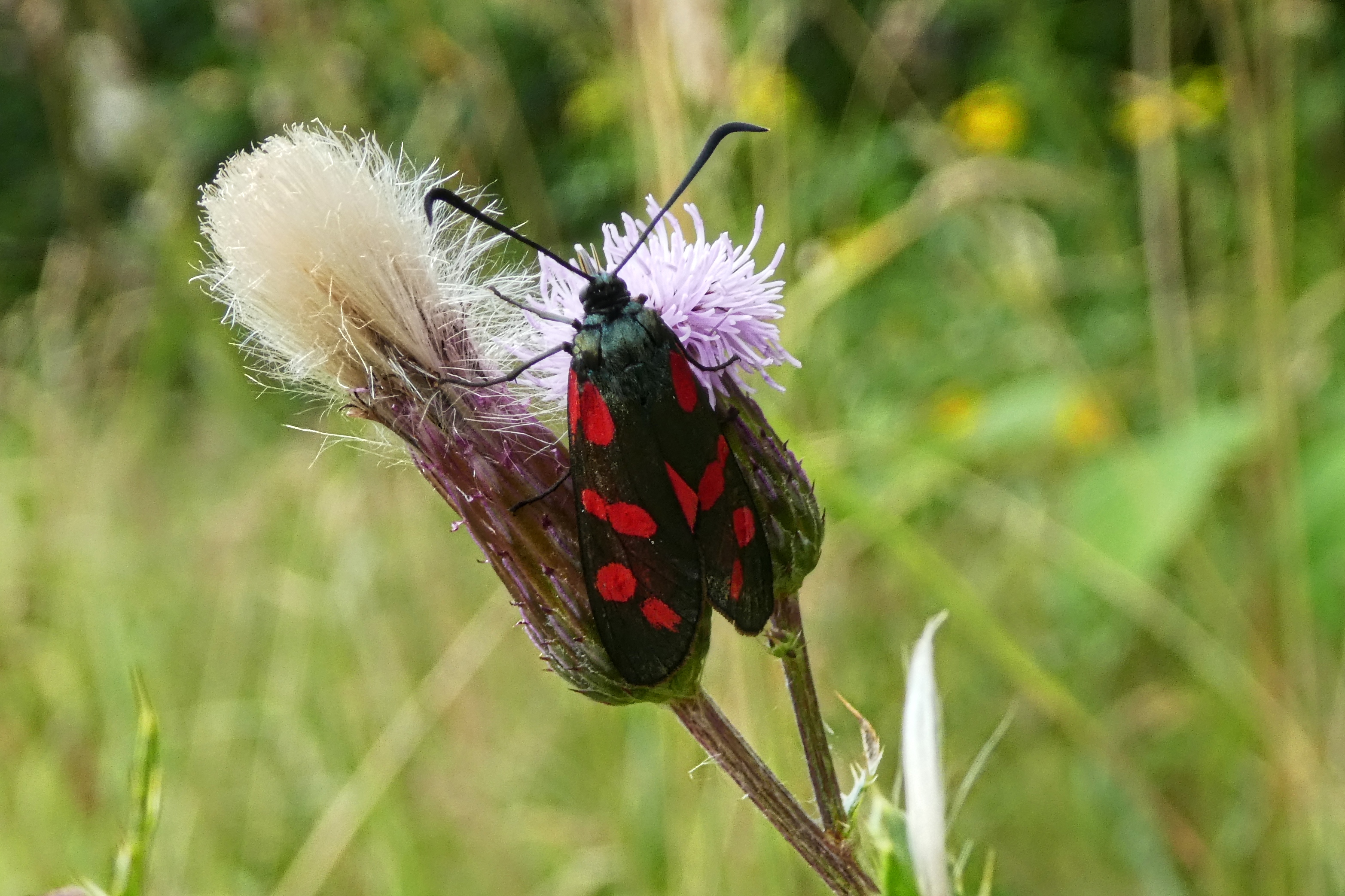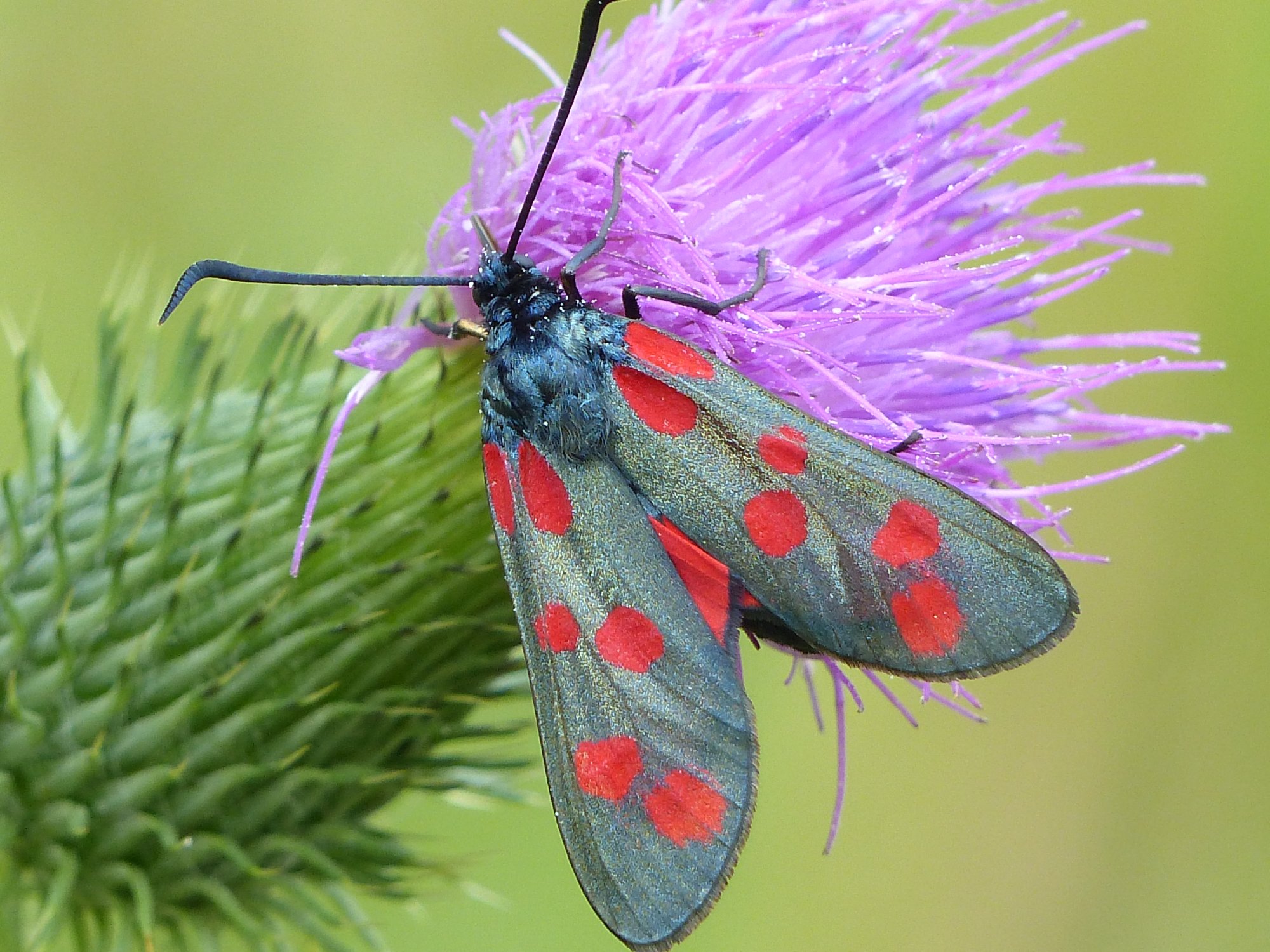 Sechsfleck-Widderchen (Zygaena filipendulae (Linnaeus, 1758)),Freital/Wurgwitz,Hammerteich,Wegrand auf Kratzdistel,Aug.2019