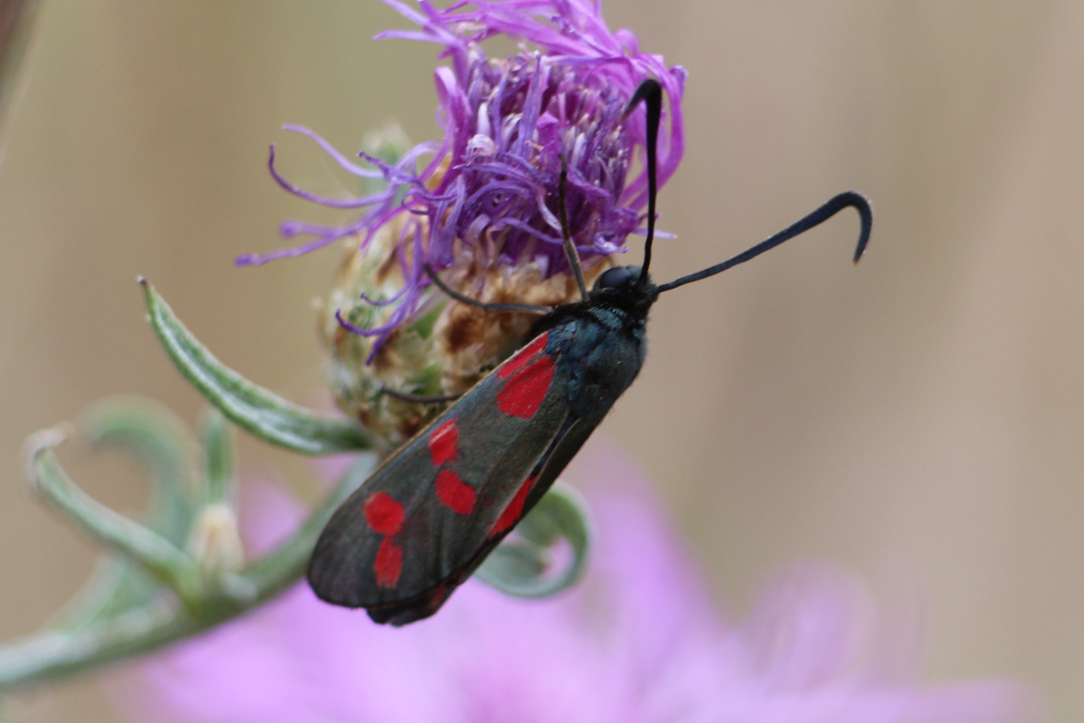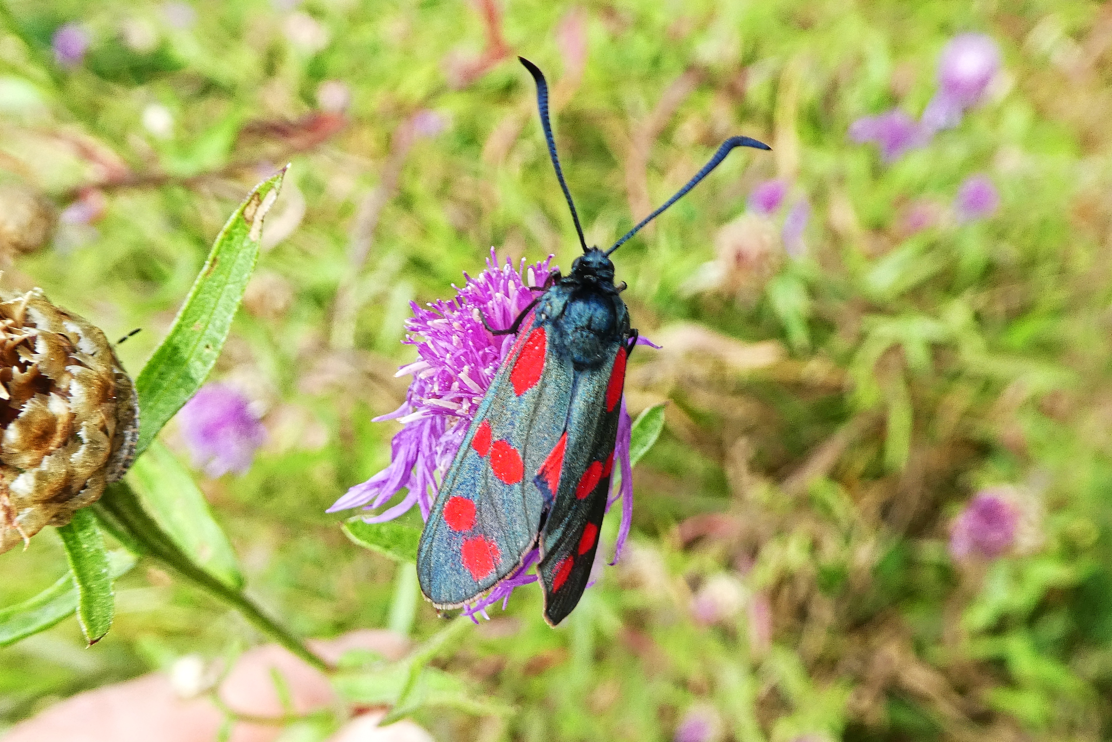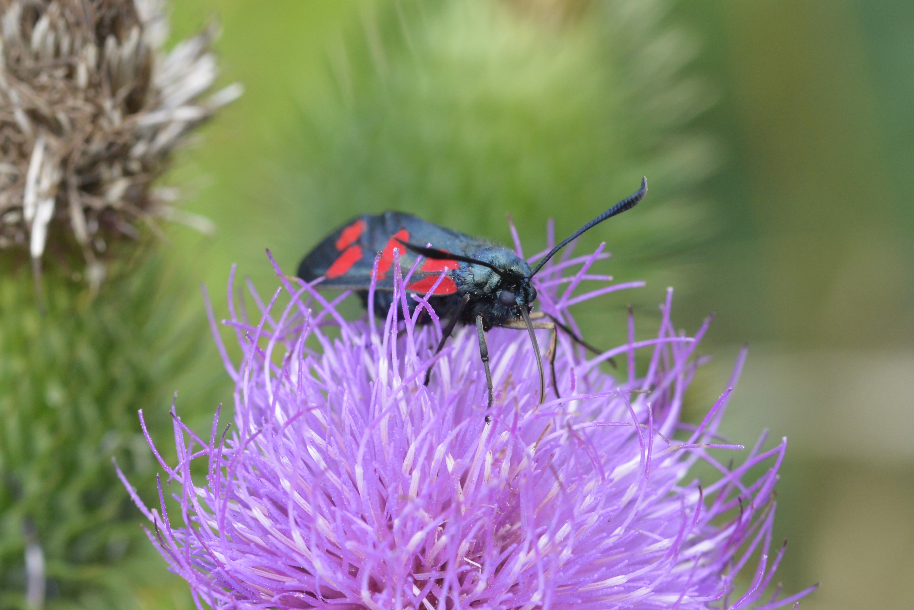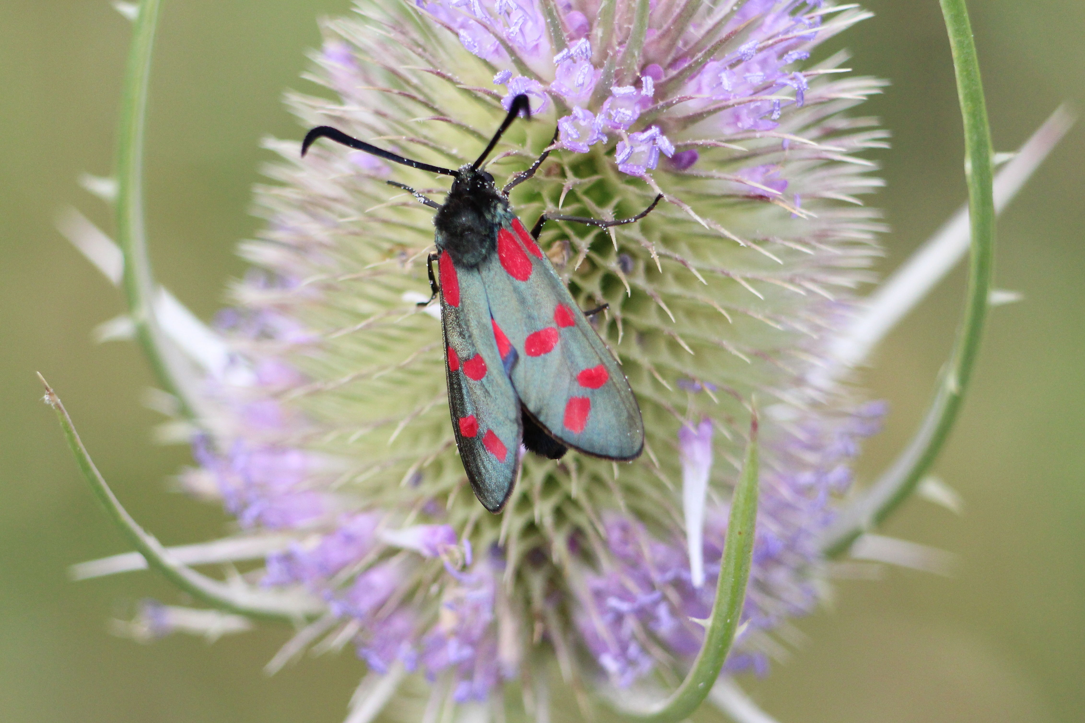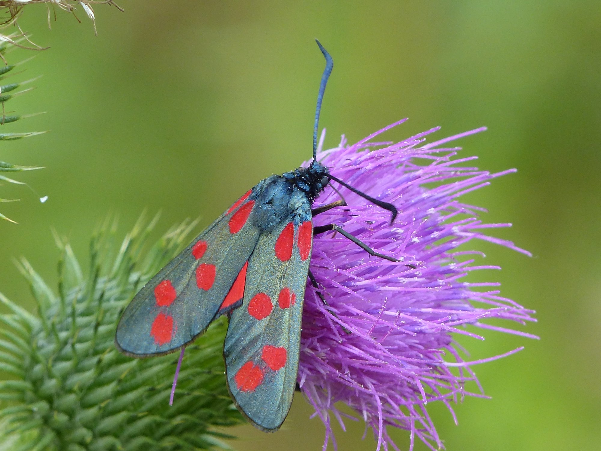 Sechsfleck-Widderchen (Zygaena filipendulae (Linnaeus, 1758)),Freital/Wurgwitz,Hammerteich,Wegrand auf Kratzdistel,Aug.2019