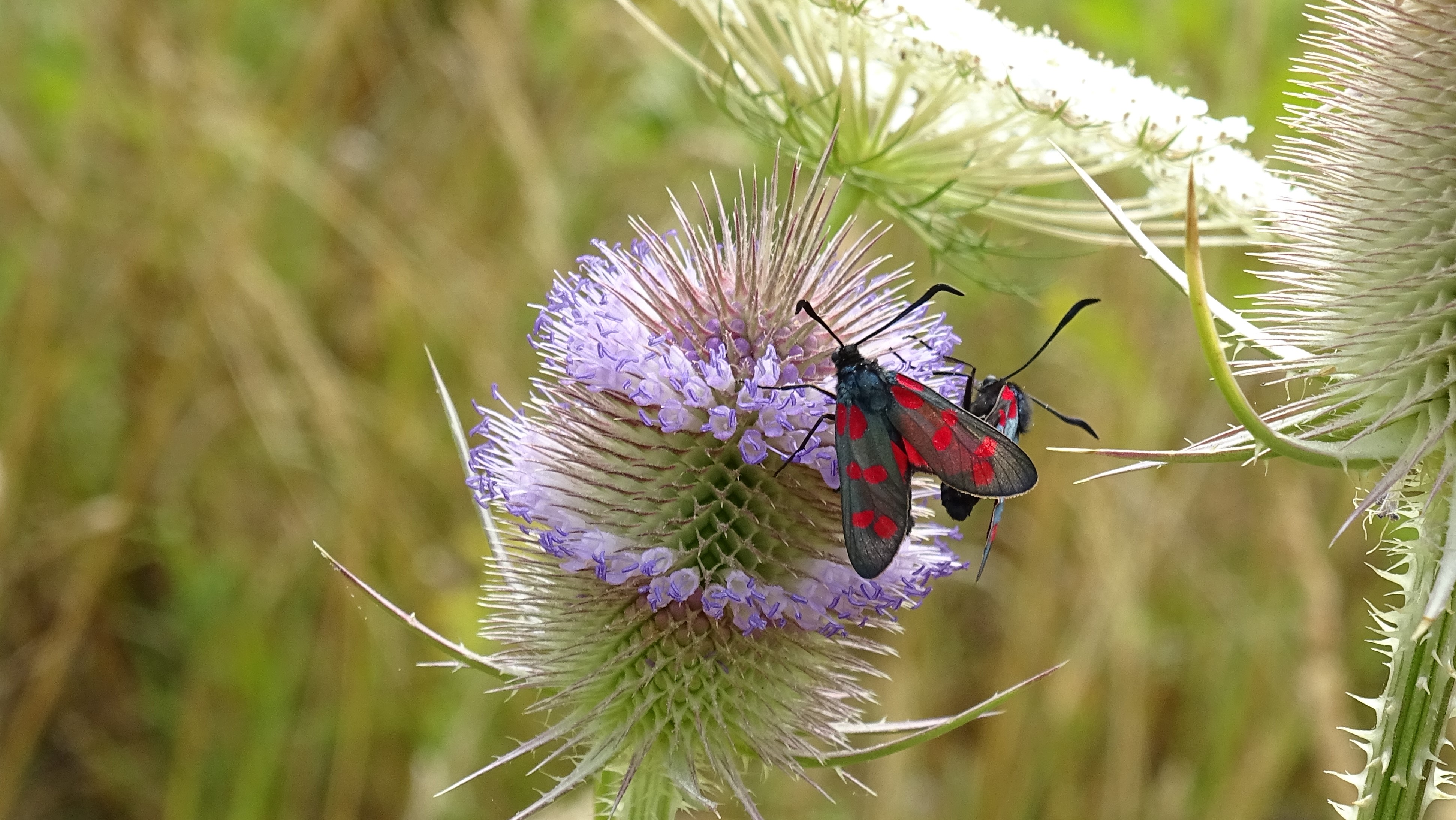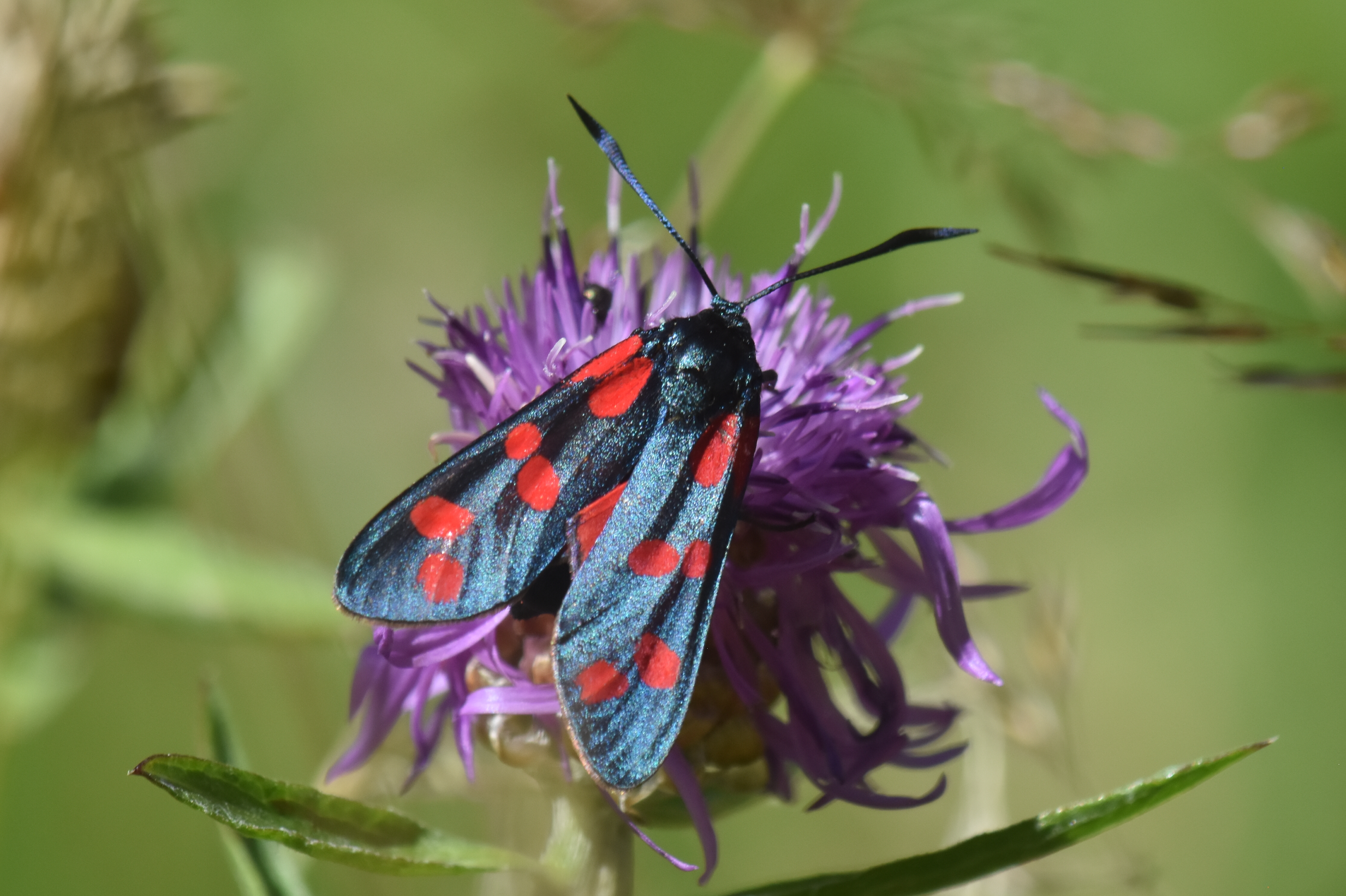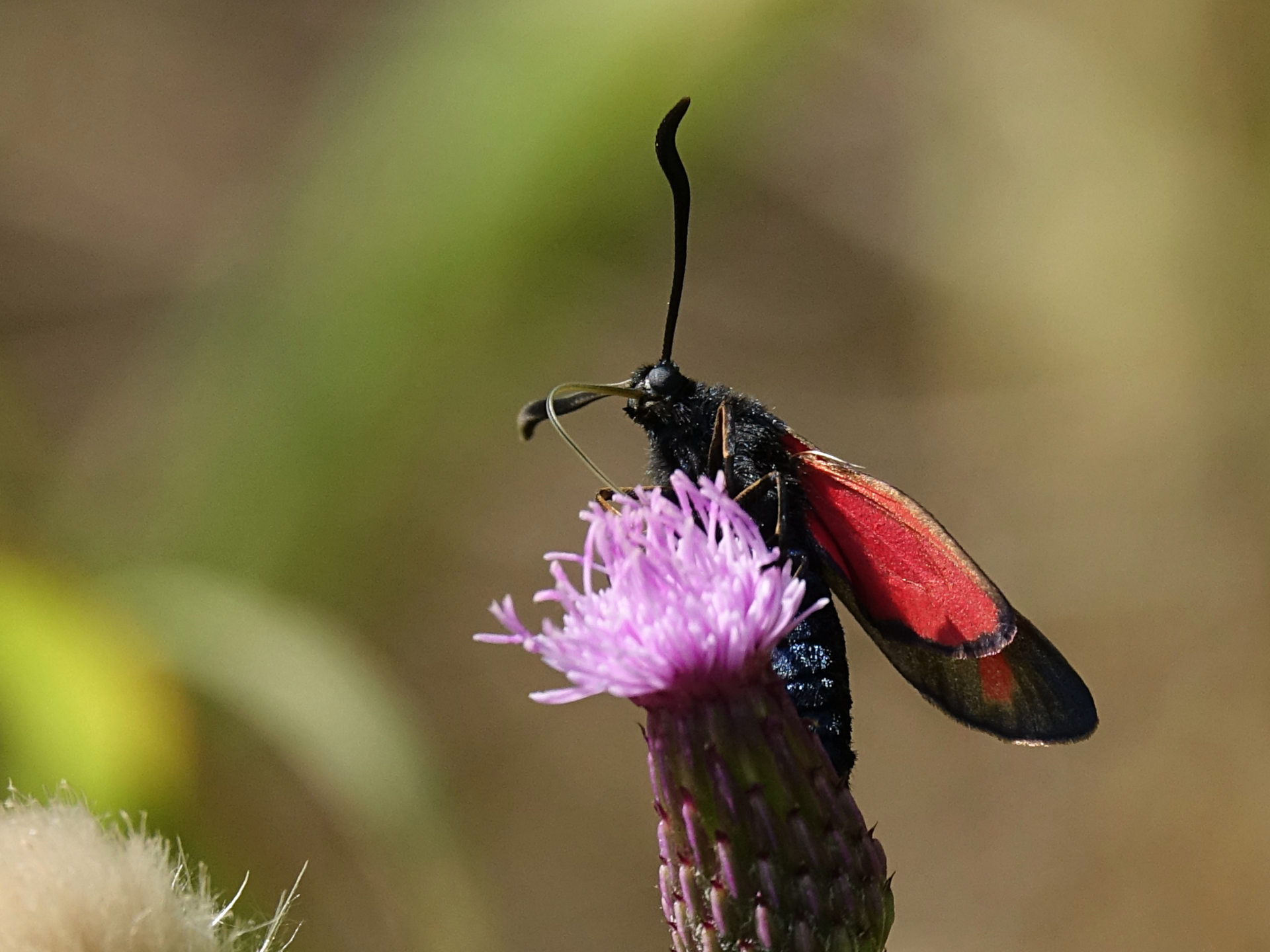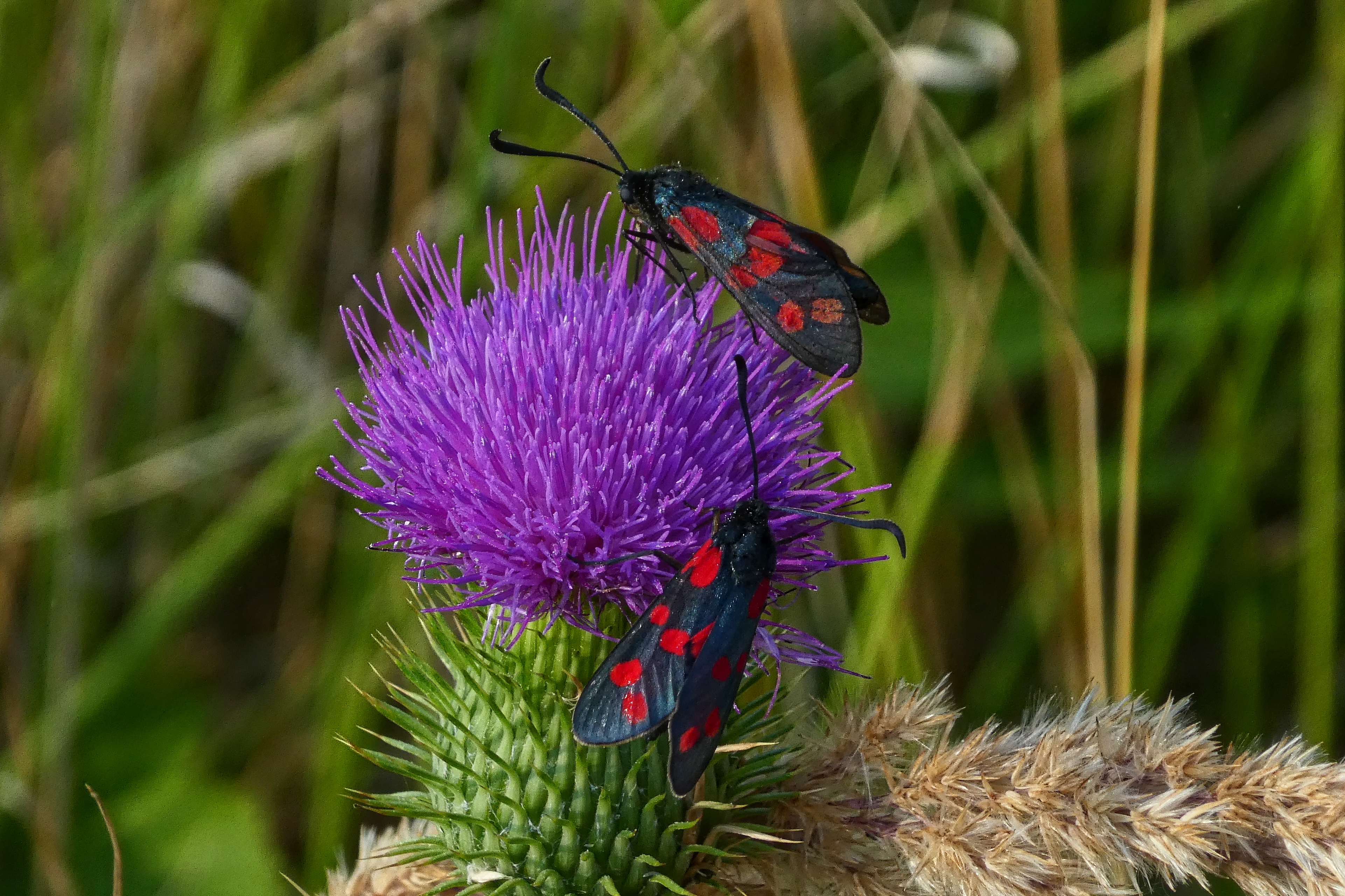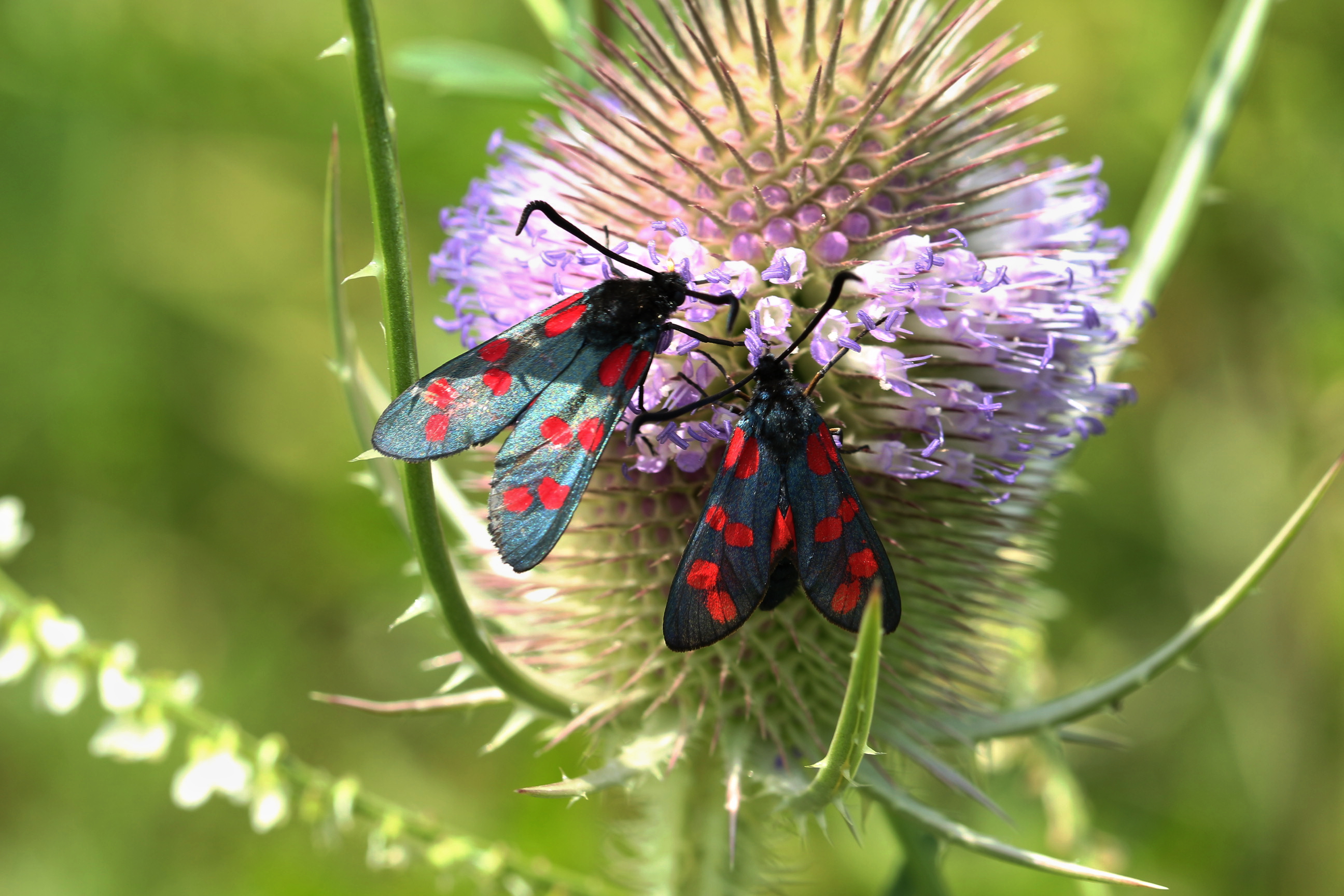 Sechsfleck-Widderchen (Zygaena filipendulae (Linnaeus, 1758)),Freital/Wurgwitz,Hammerteich,Wegrand auf Kratzdistel,Aug.2019
