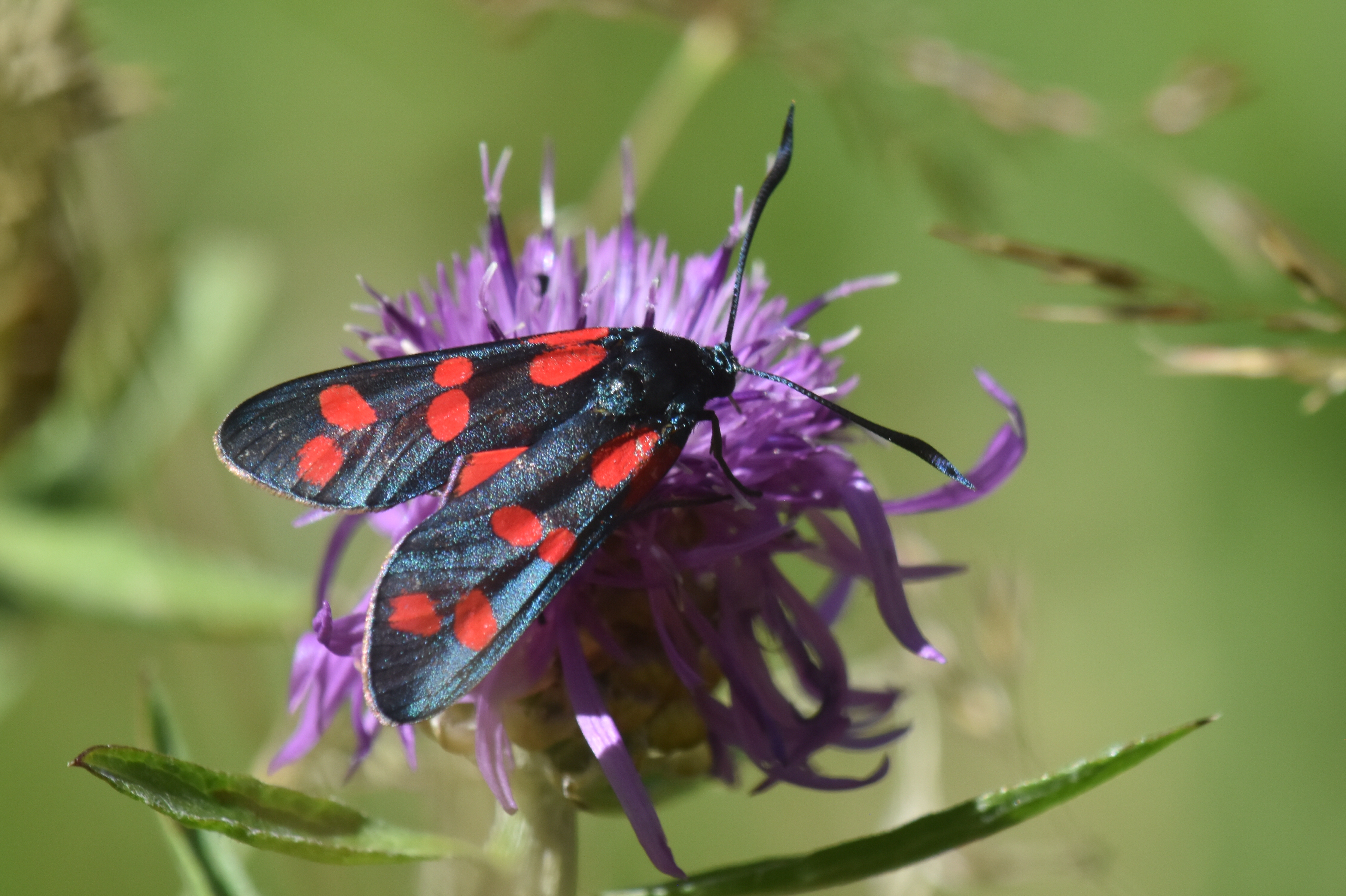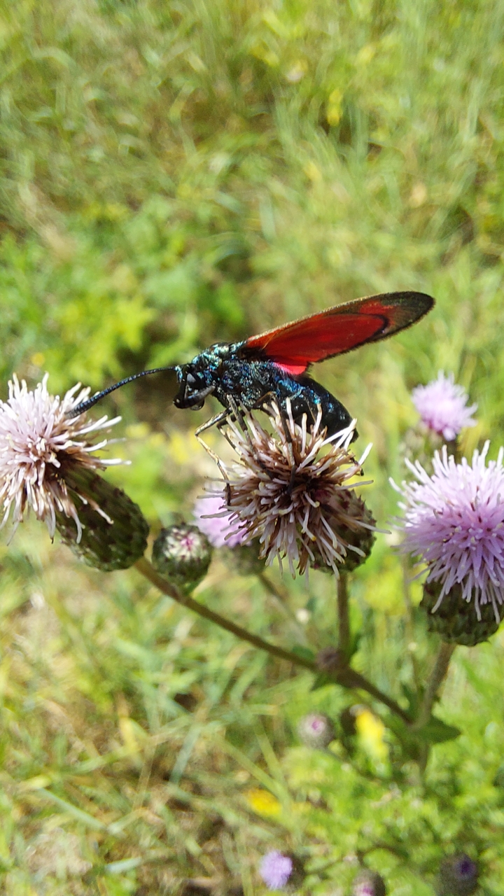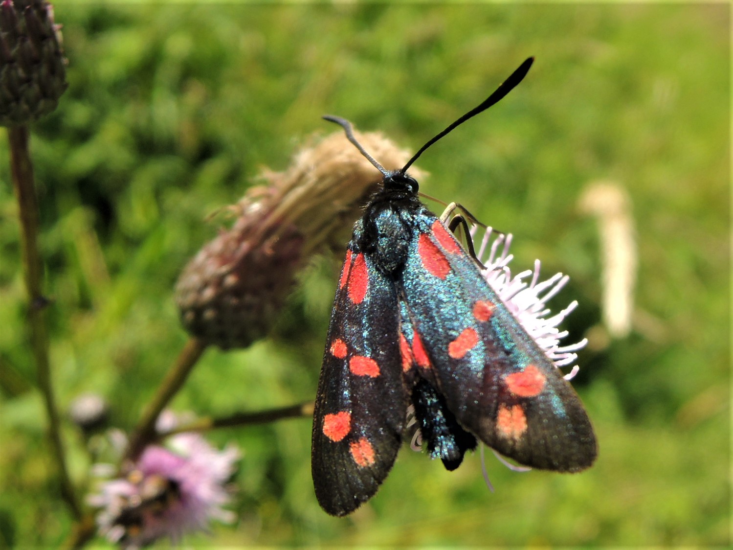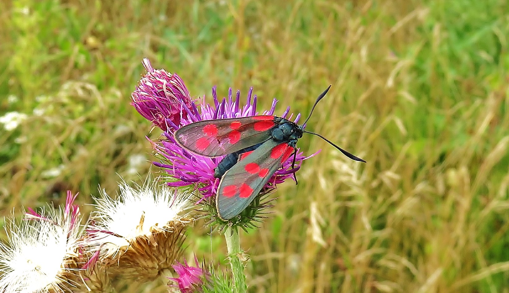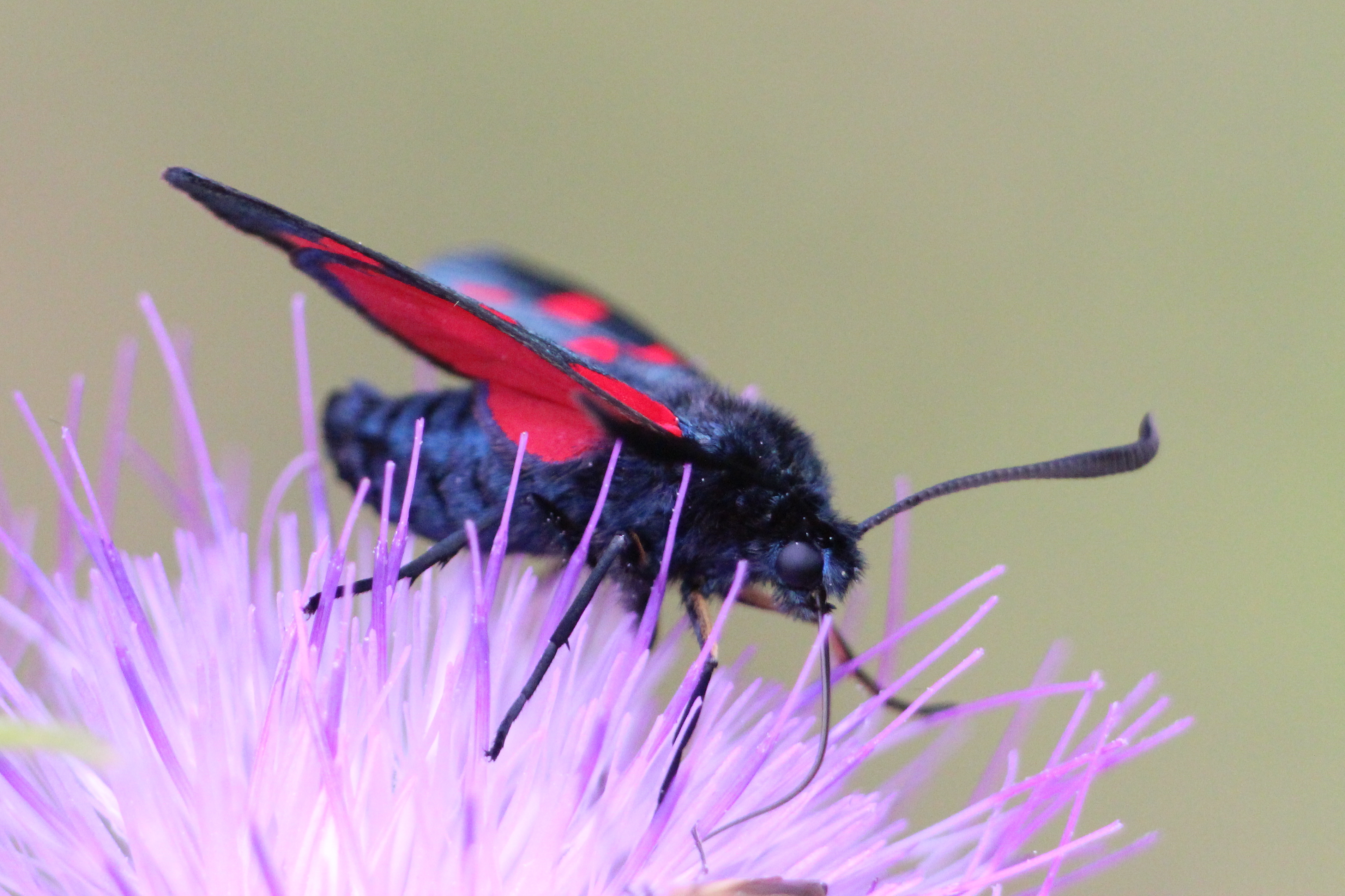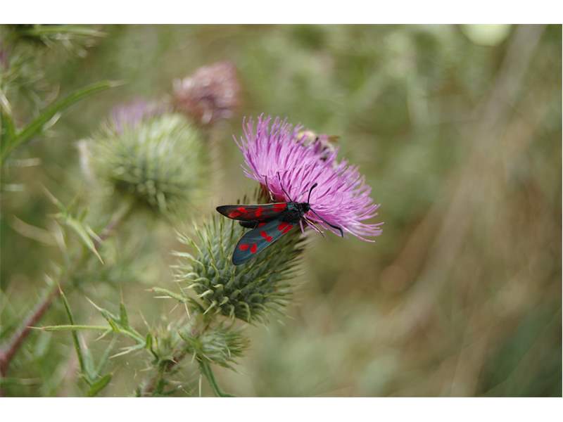 Sechsfleck-Widderchen (Zygaena filipendulae (Linnaeus, 1758)),Freital/Wurgwitz,Hammerteich,Wegrand auf Kratzdistel,Aug.2019