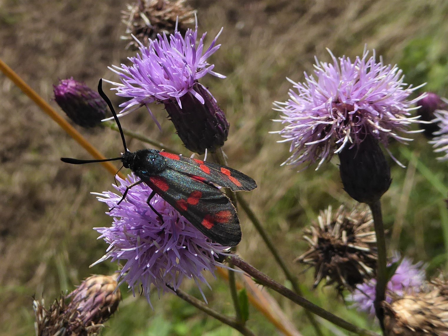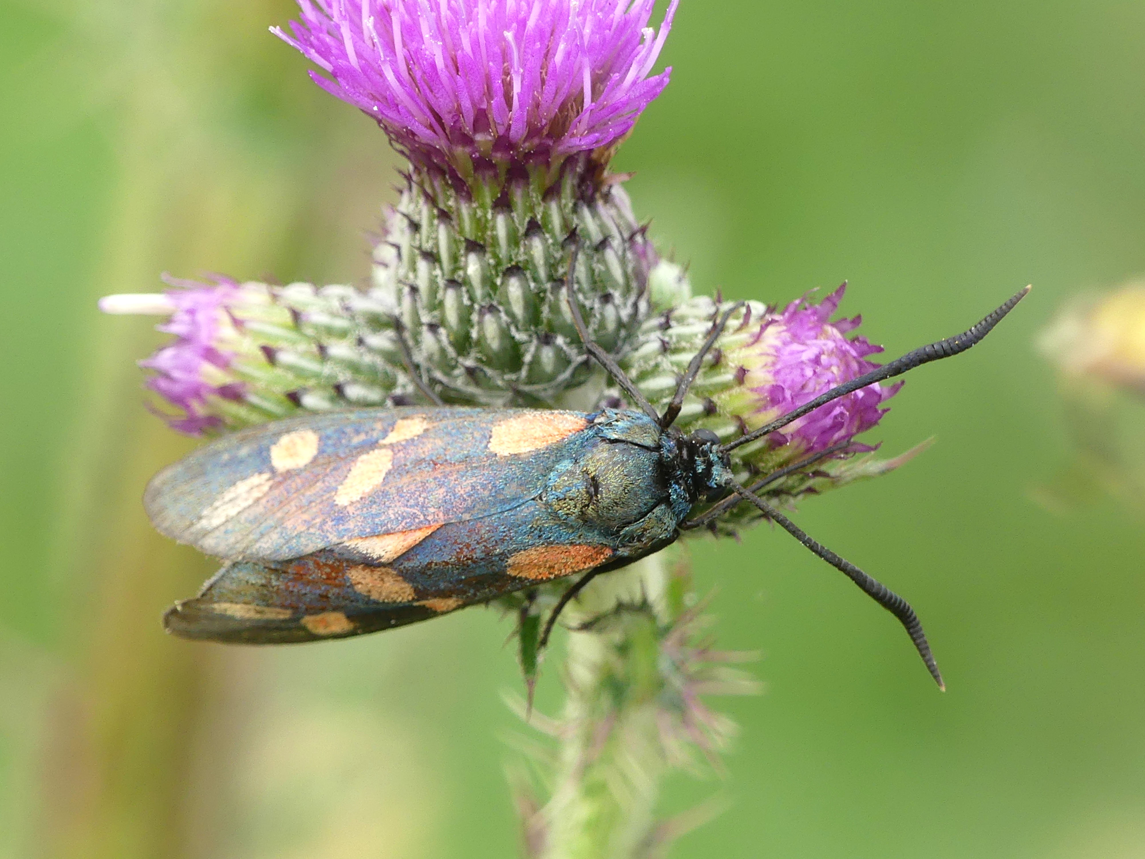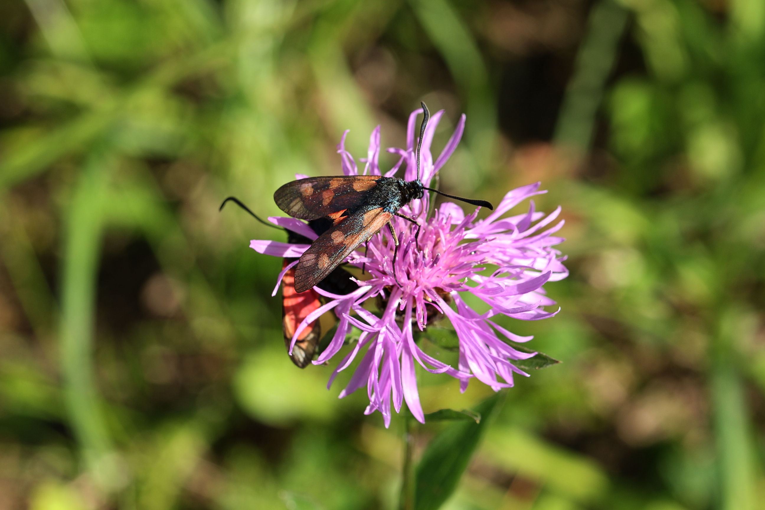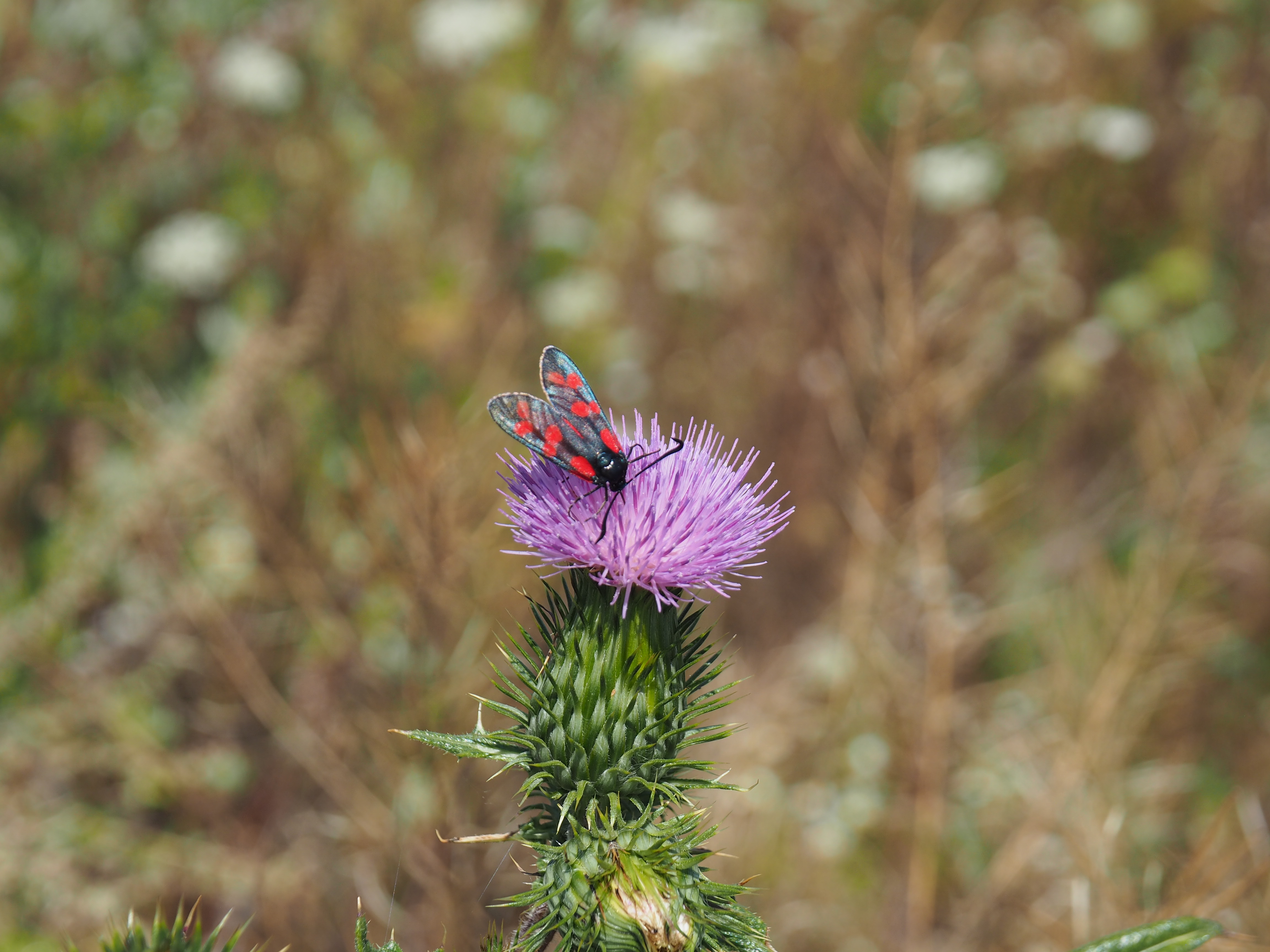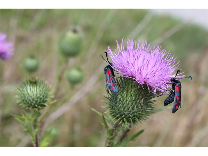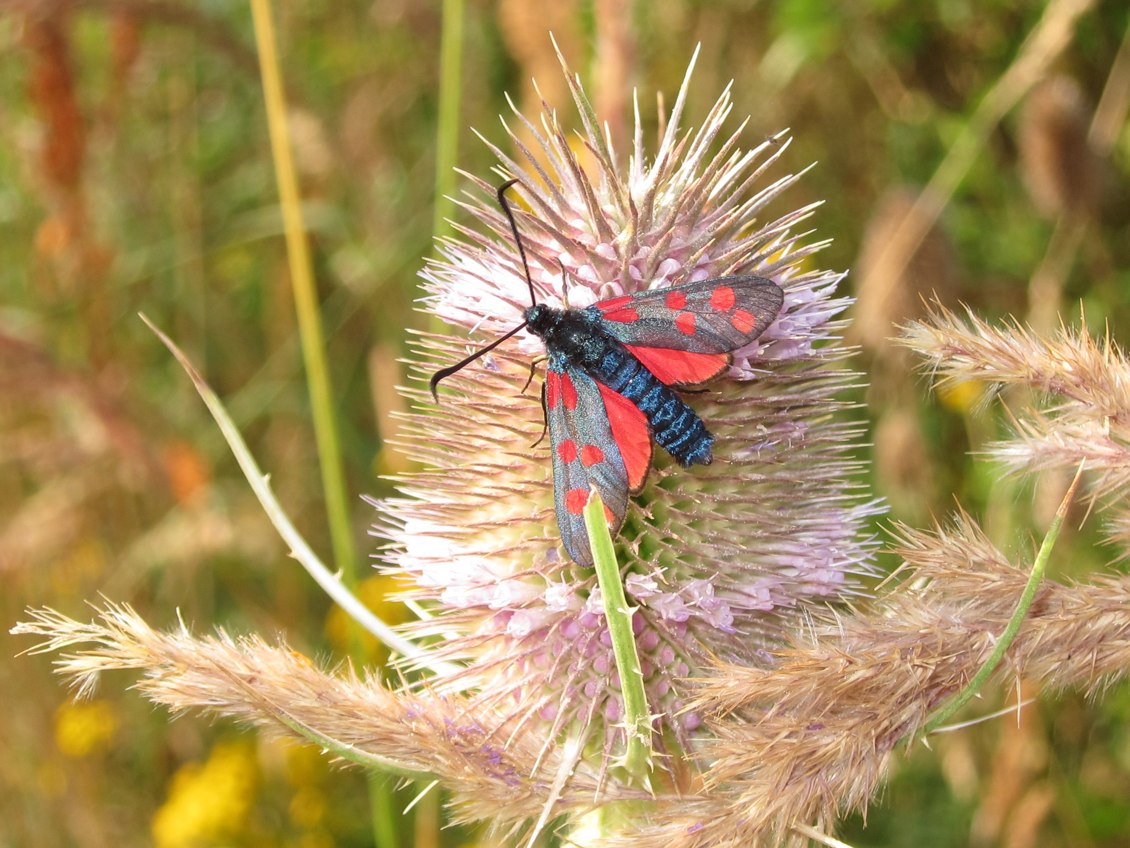 Sechsfleck-Widderchen (Zygaena filipendulae (Linnaeus, 1758)),Freital/Wurgwitz,Hammerteich,Wegrand auf Kratzdistel,Aug.2019