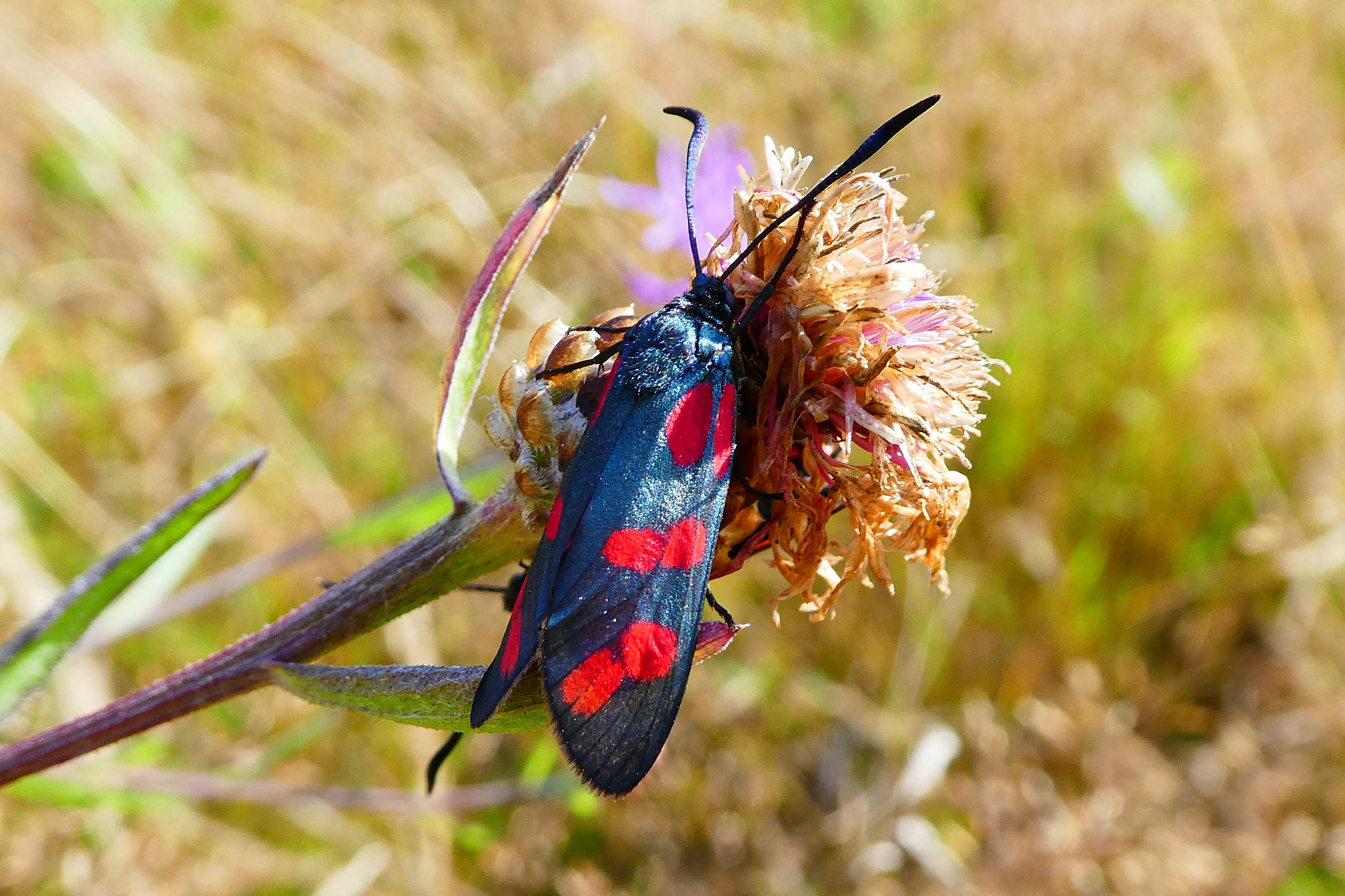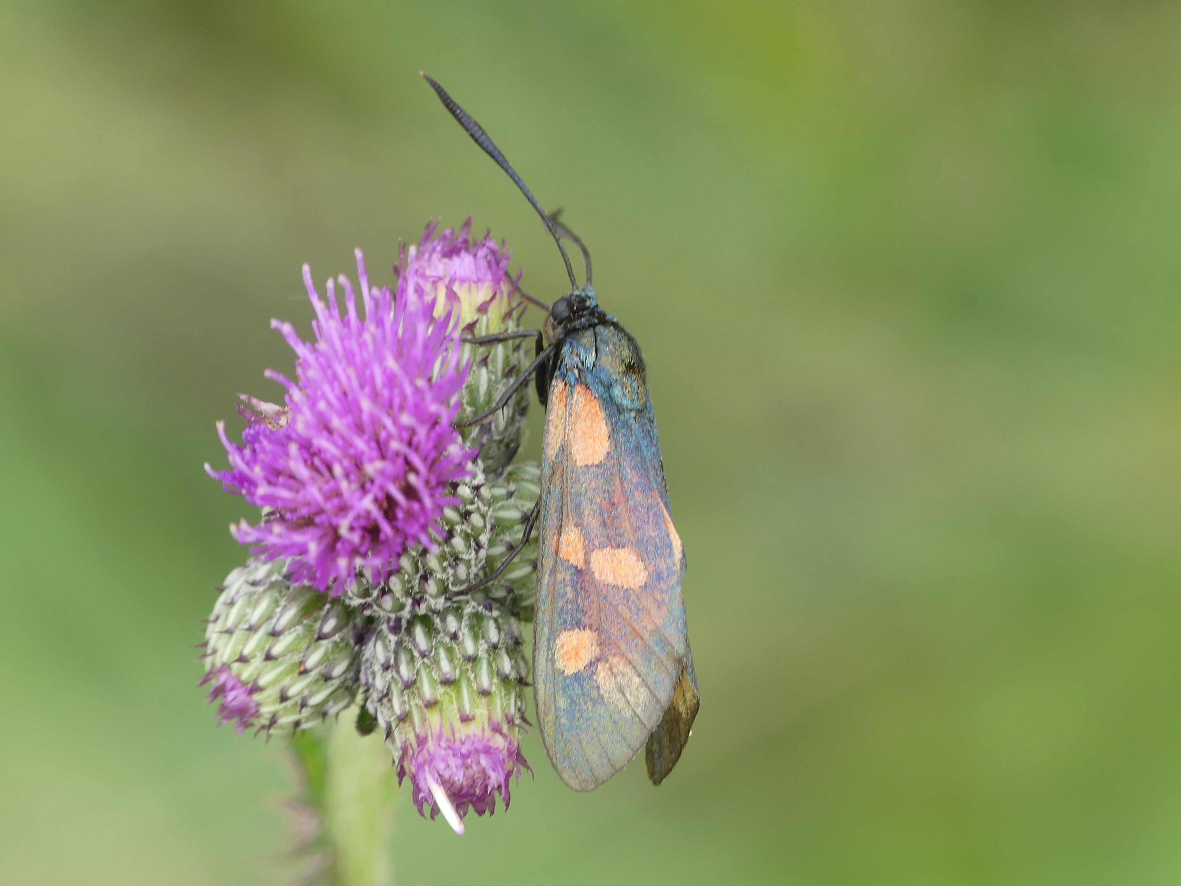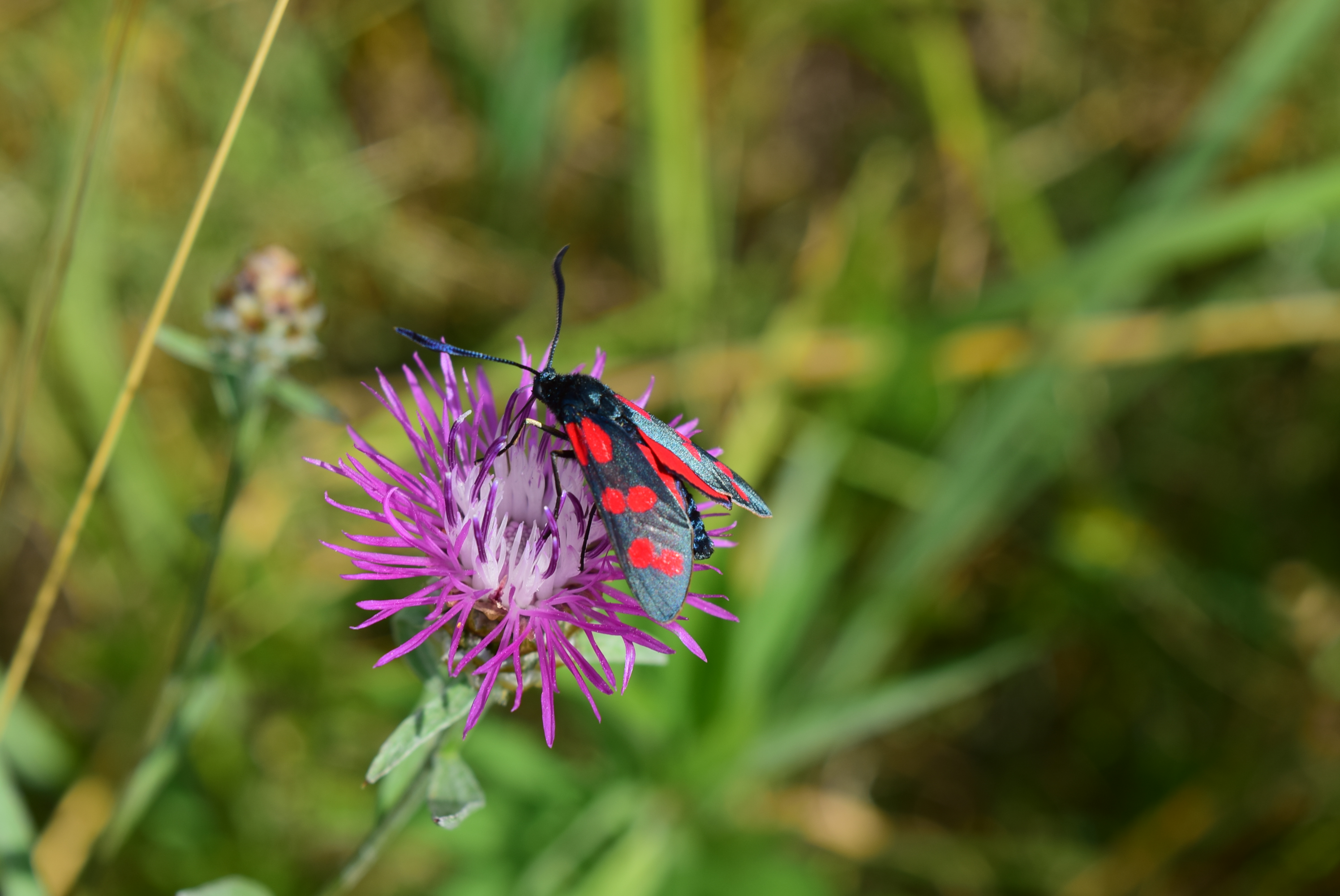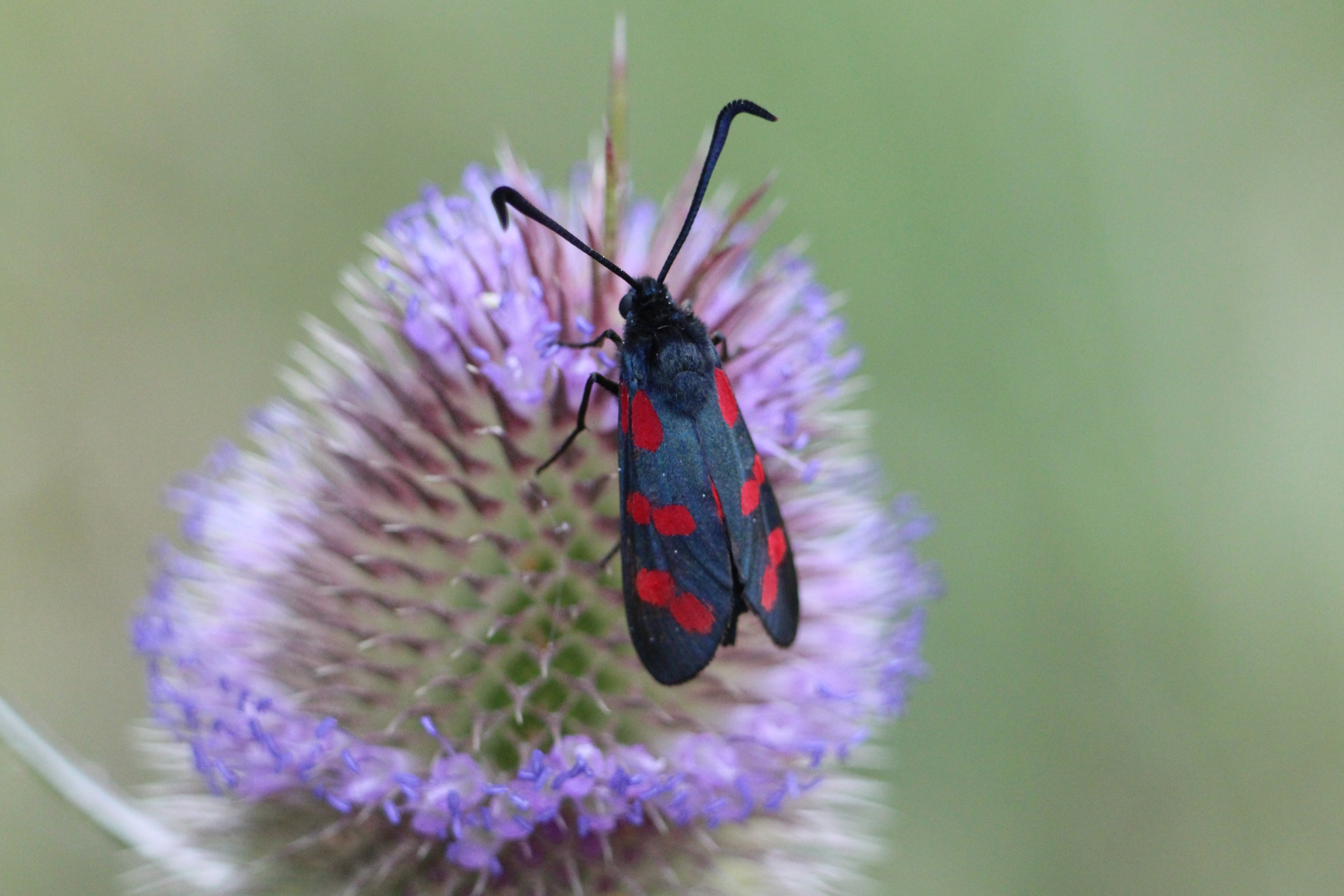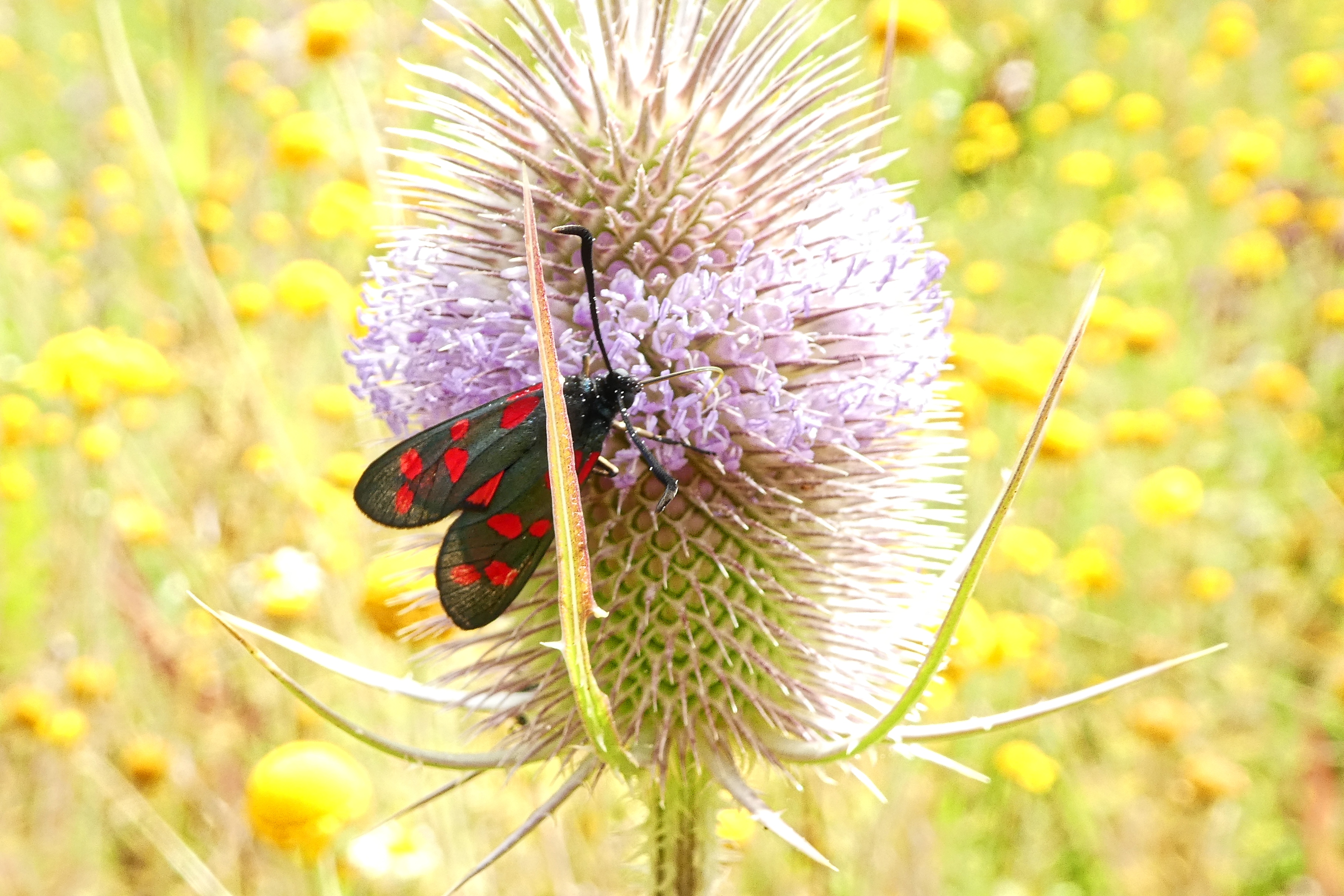 Sechsfleck-Widderchen (Zygaena filipendulae (Linnaeus, 1758)),Freital/Wurgwitz,Hammerteich,Wegrand auf Kratzdistel,Aug.2019