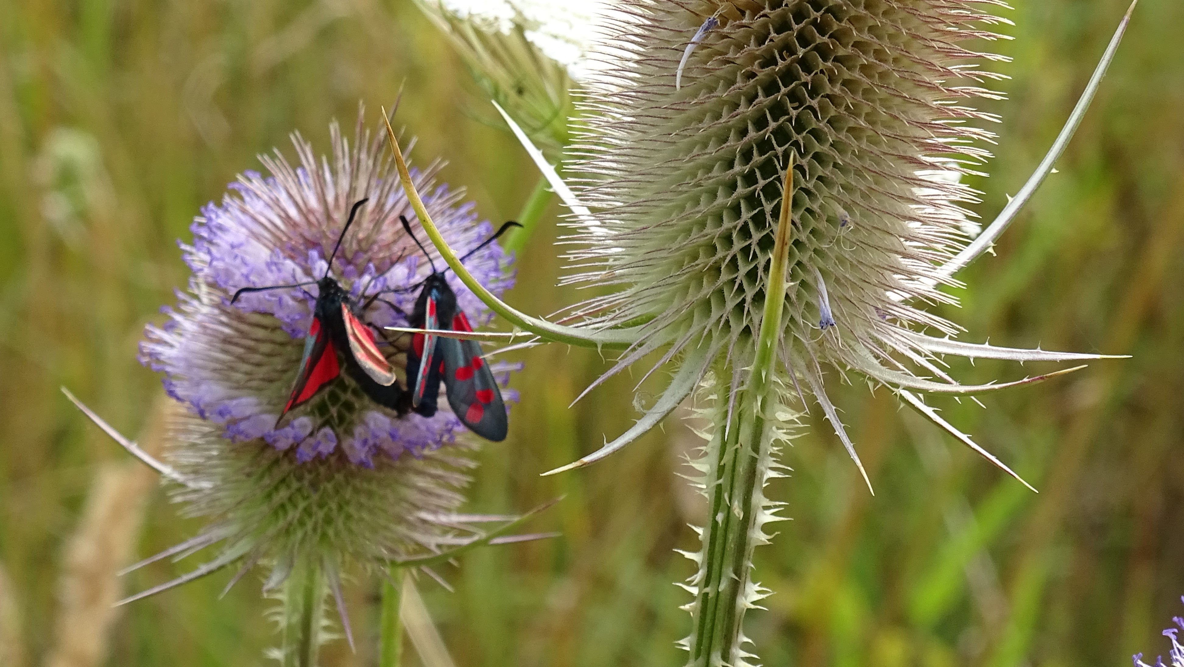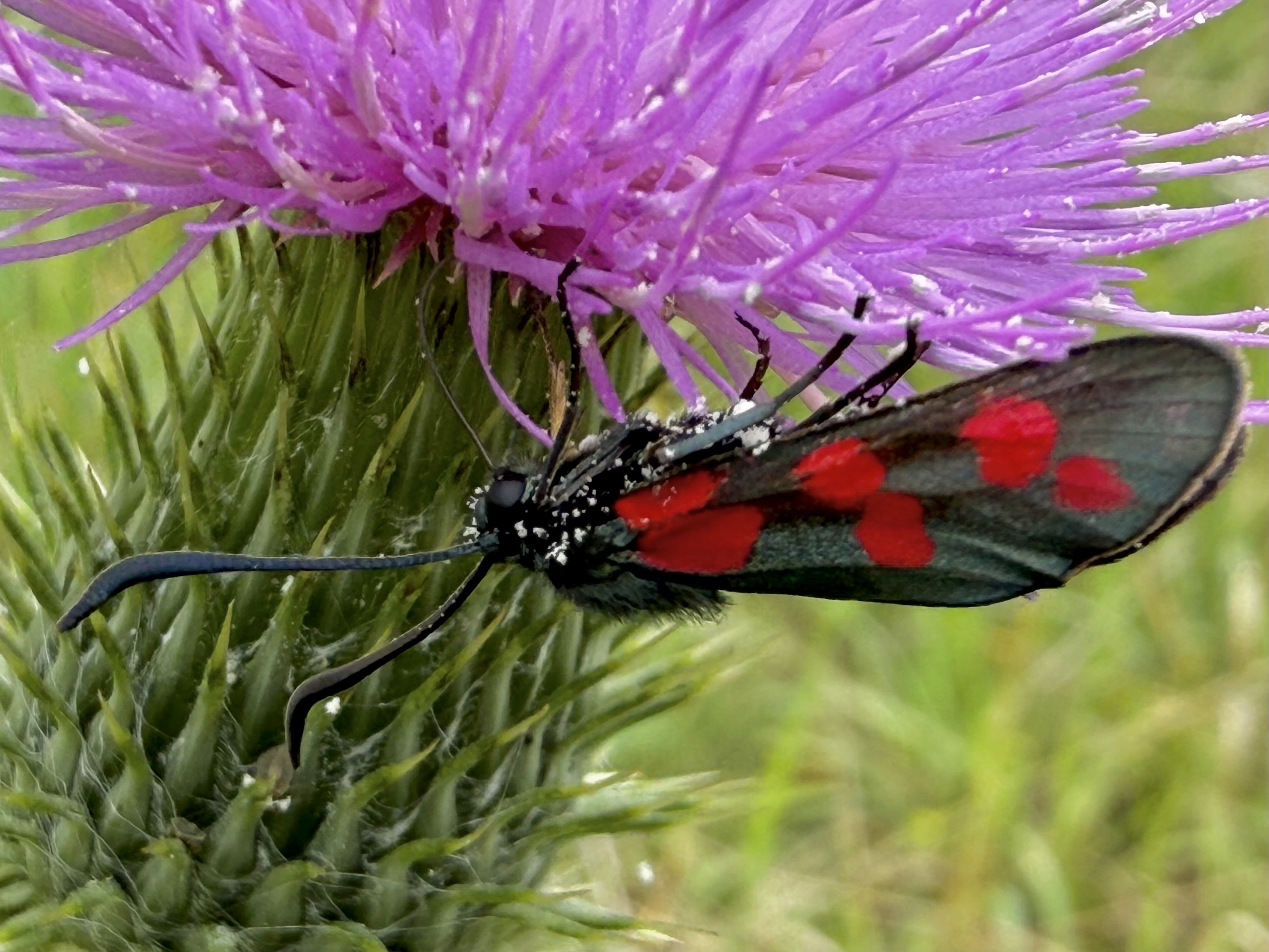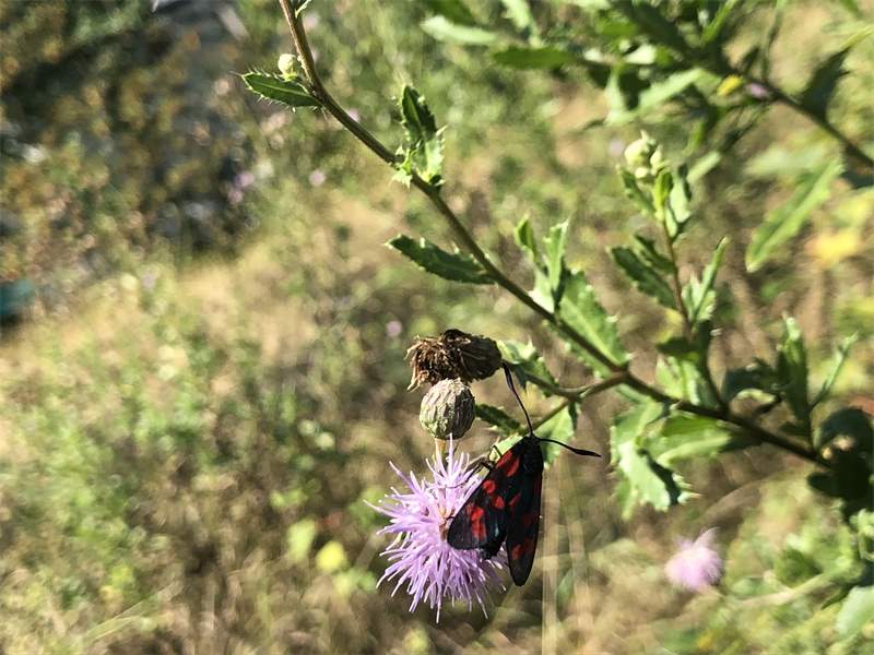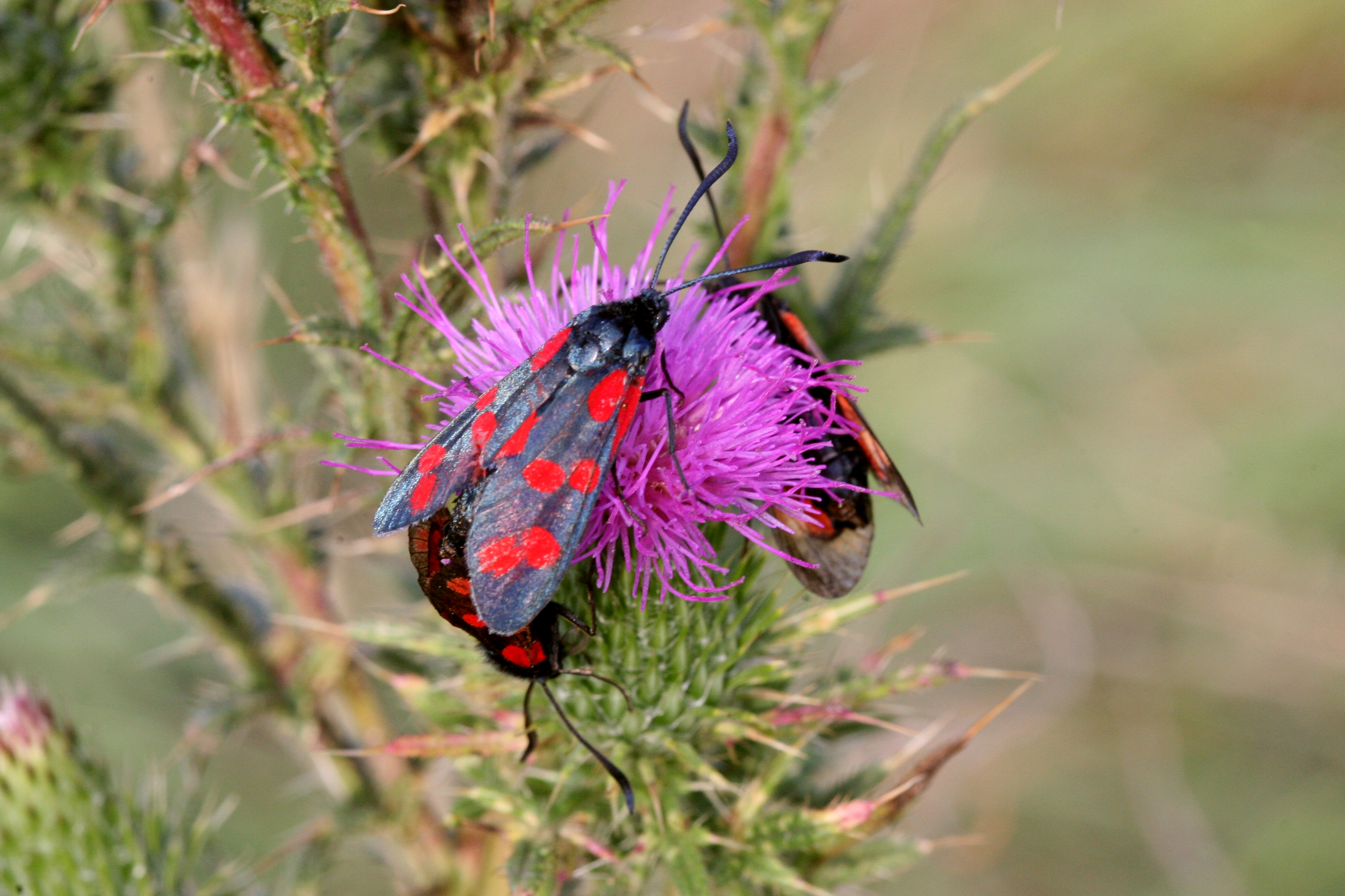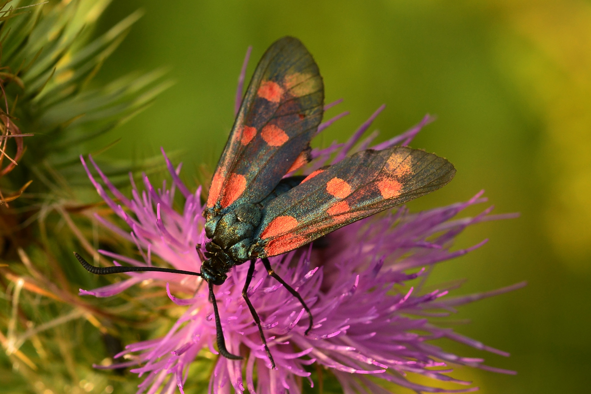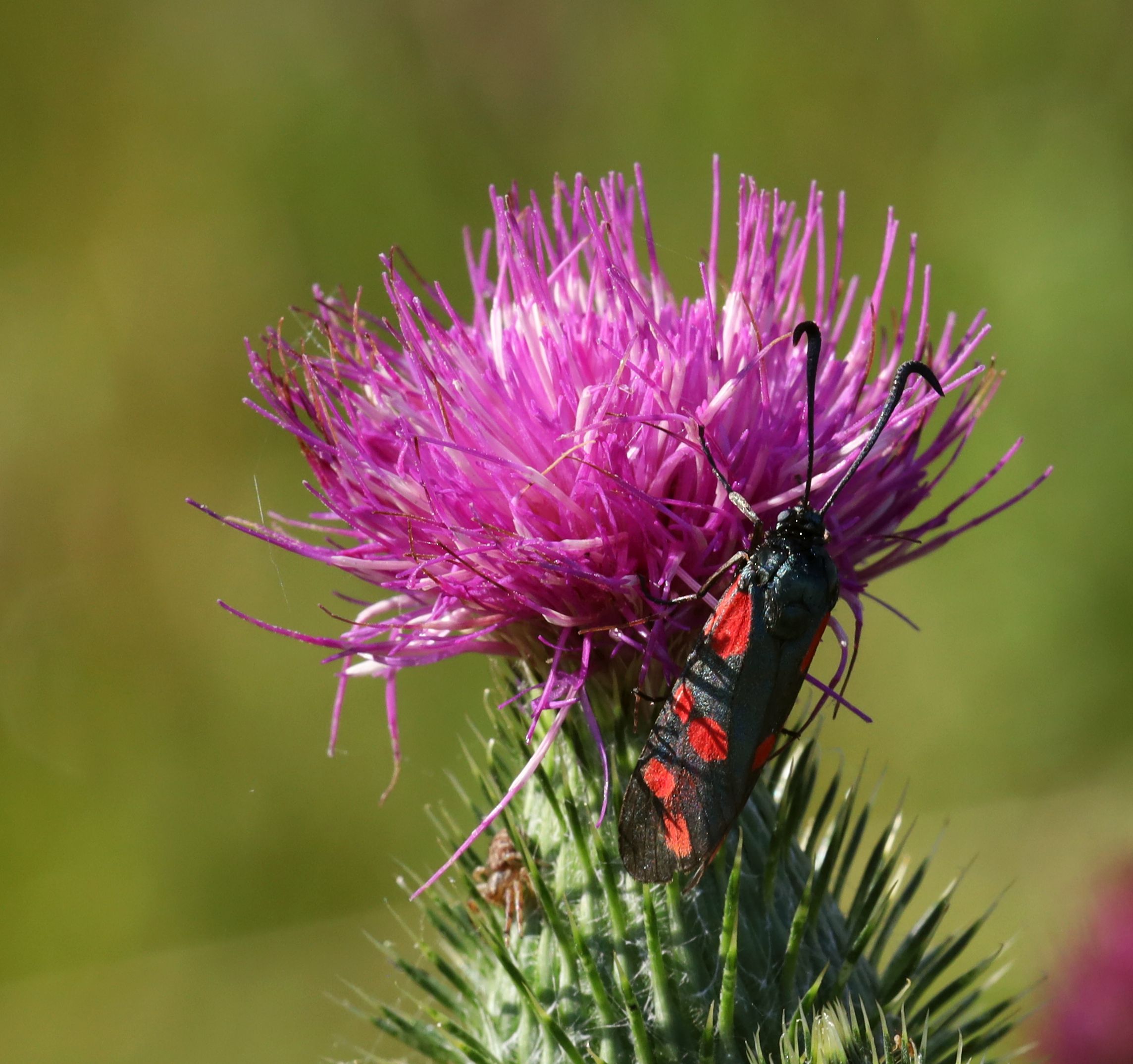 Sechsfleck-Widderchen (Zygaena filipendulae (Linnaeus, 1758)),Freital/Wurgwitz,Hammerteich,Wegrand auf Kratzdistel,Aug.2019