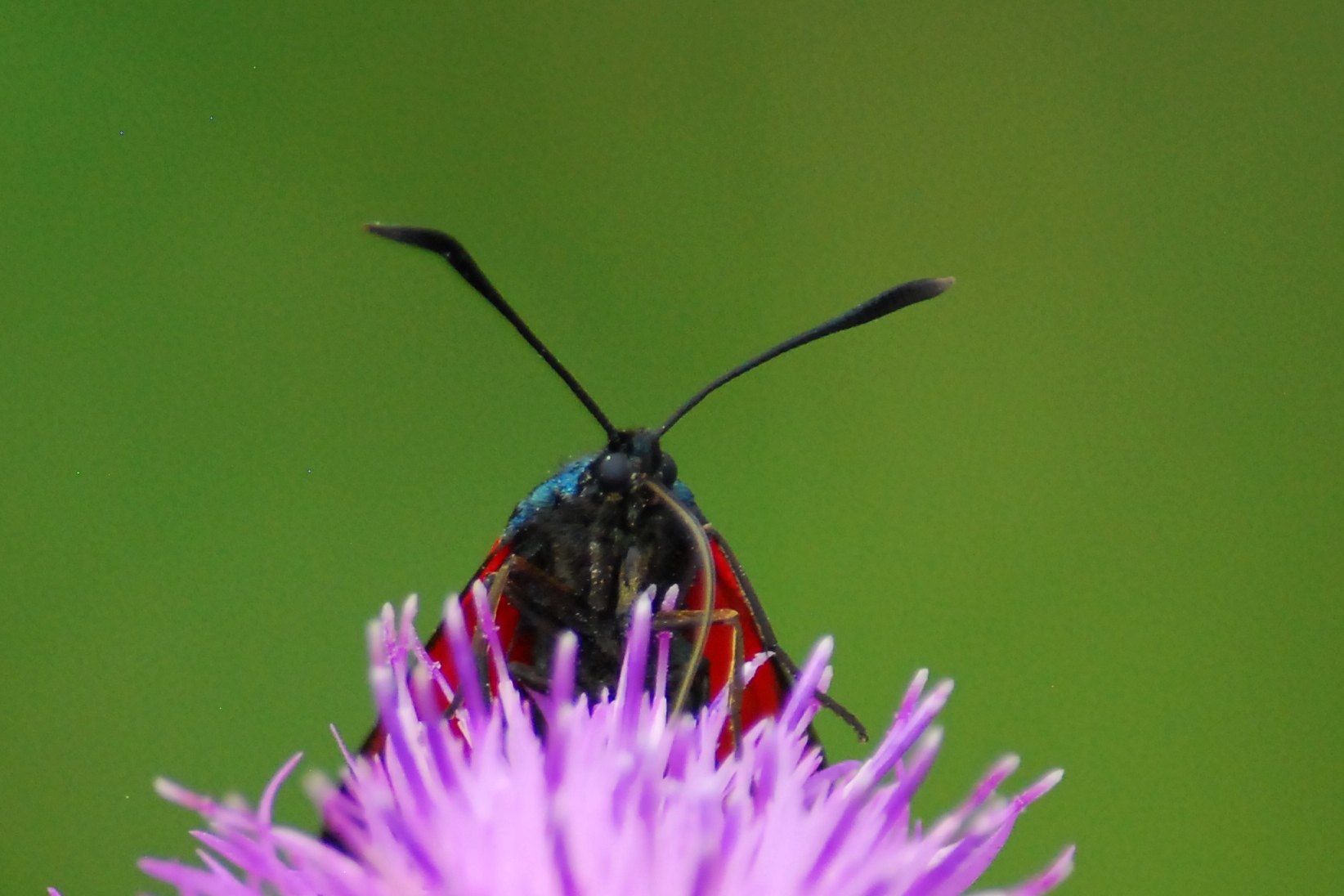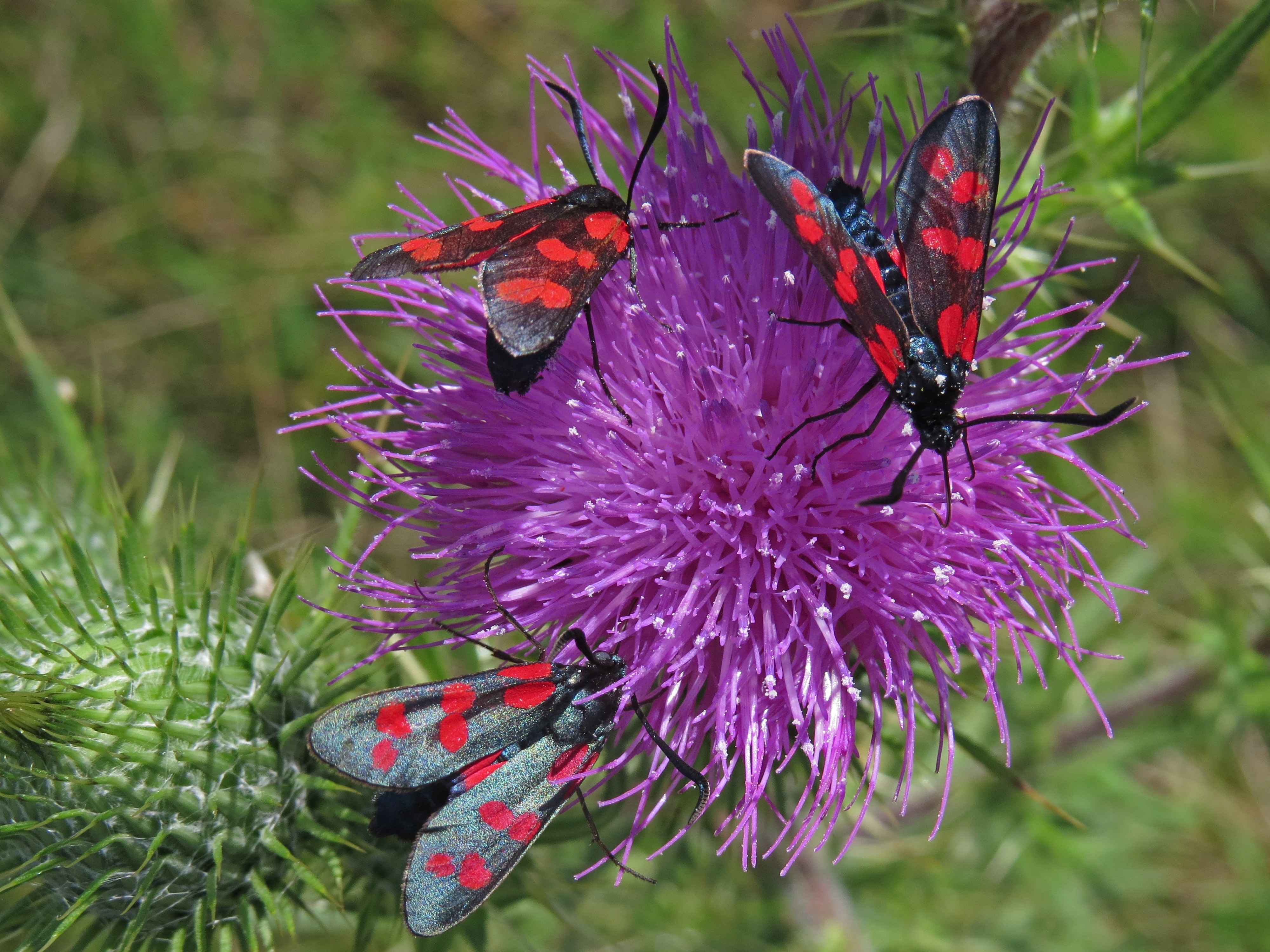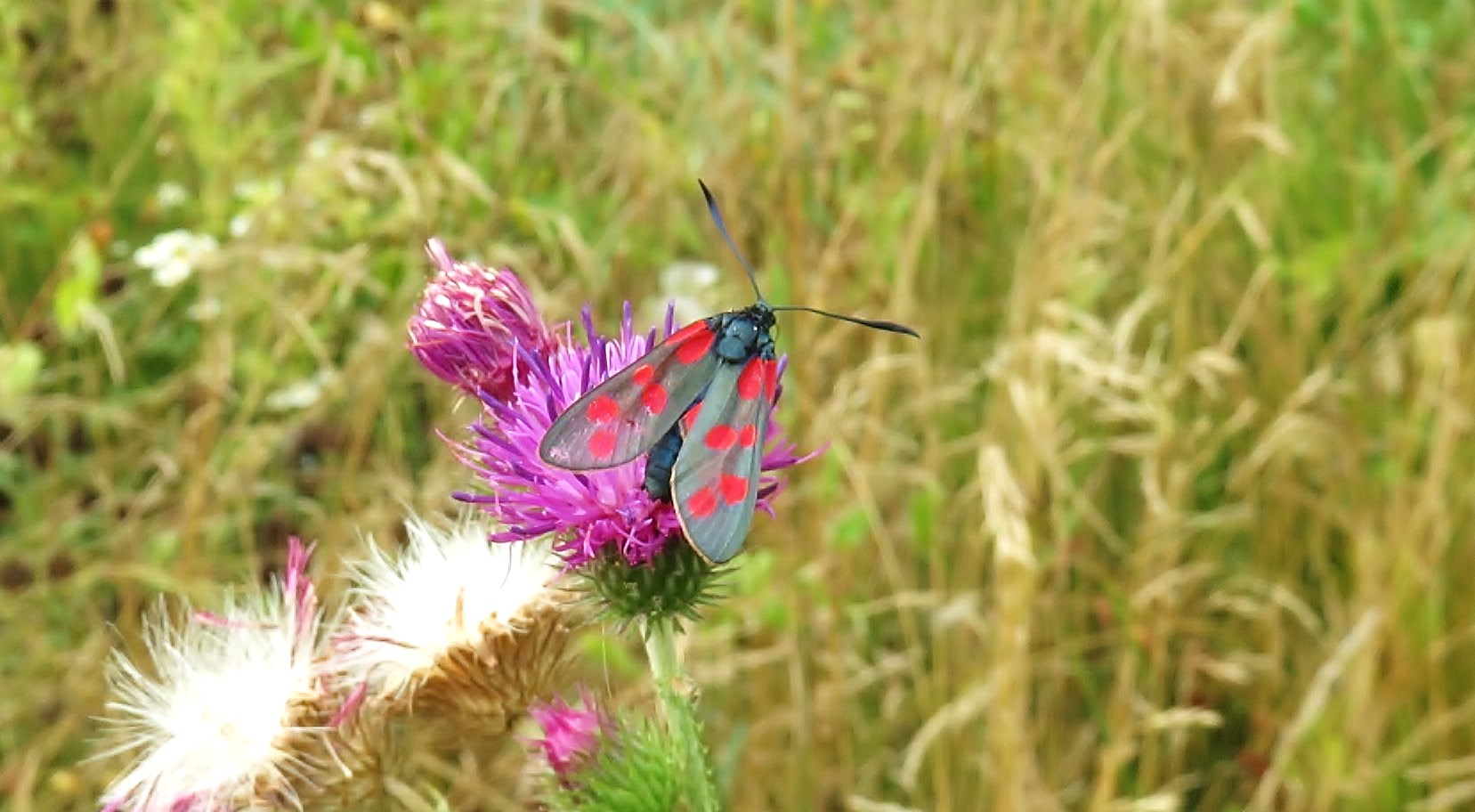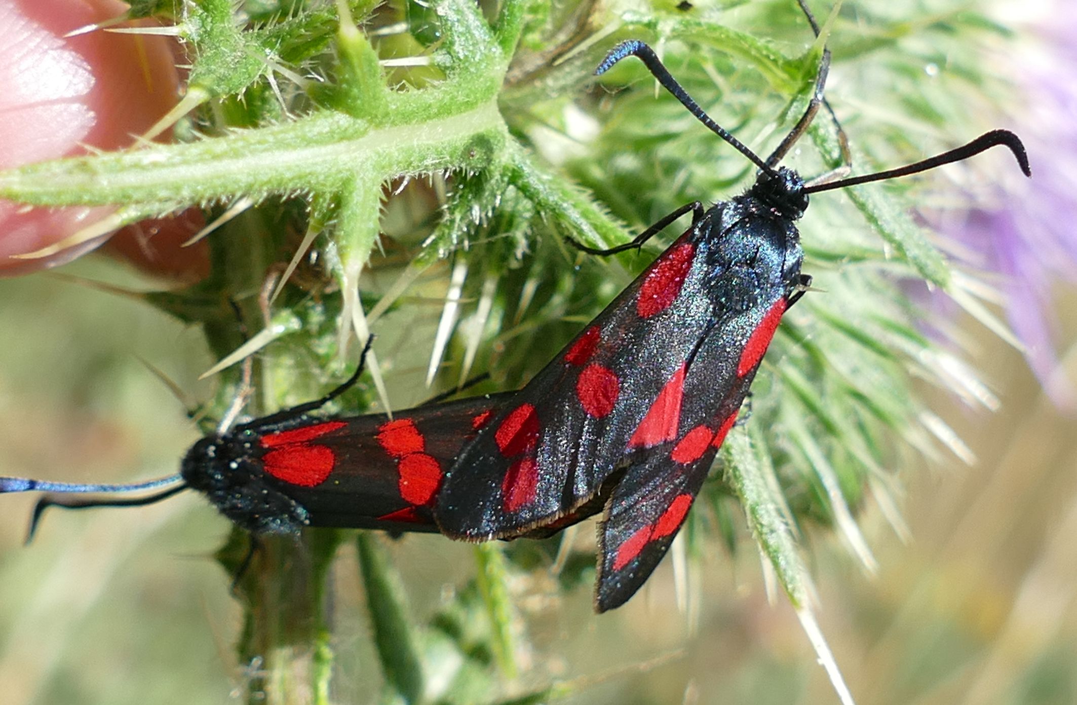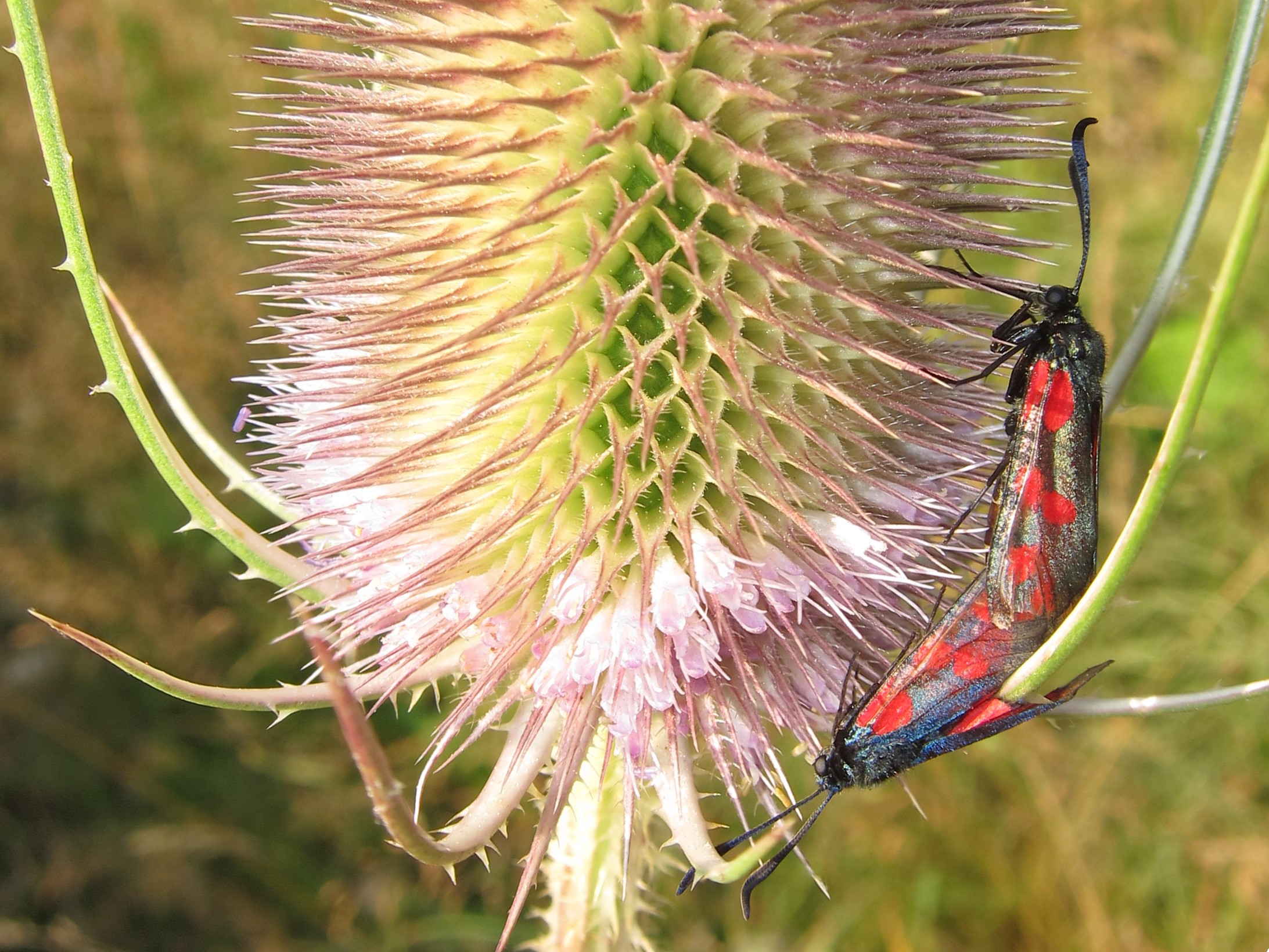 Sechsfleck-Widderchen (Zygaena filipendulae (Linnaeus, 1758)),Freital/Wurgwitz,Hammerteich,Wegrand auf Kratzdistel,Aug.2019