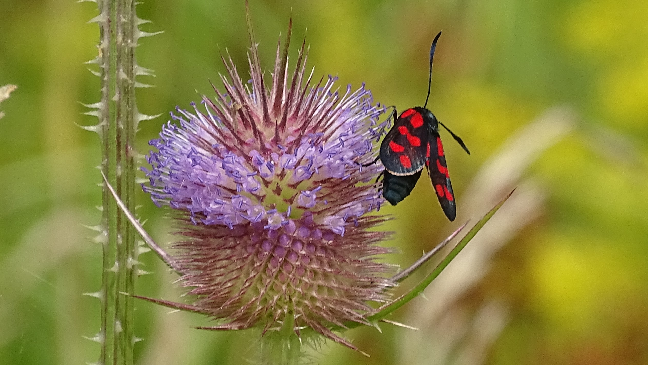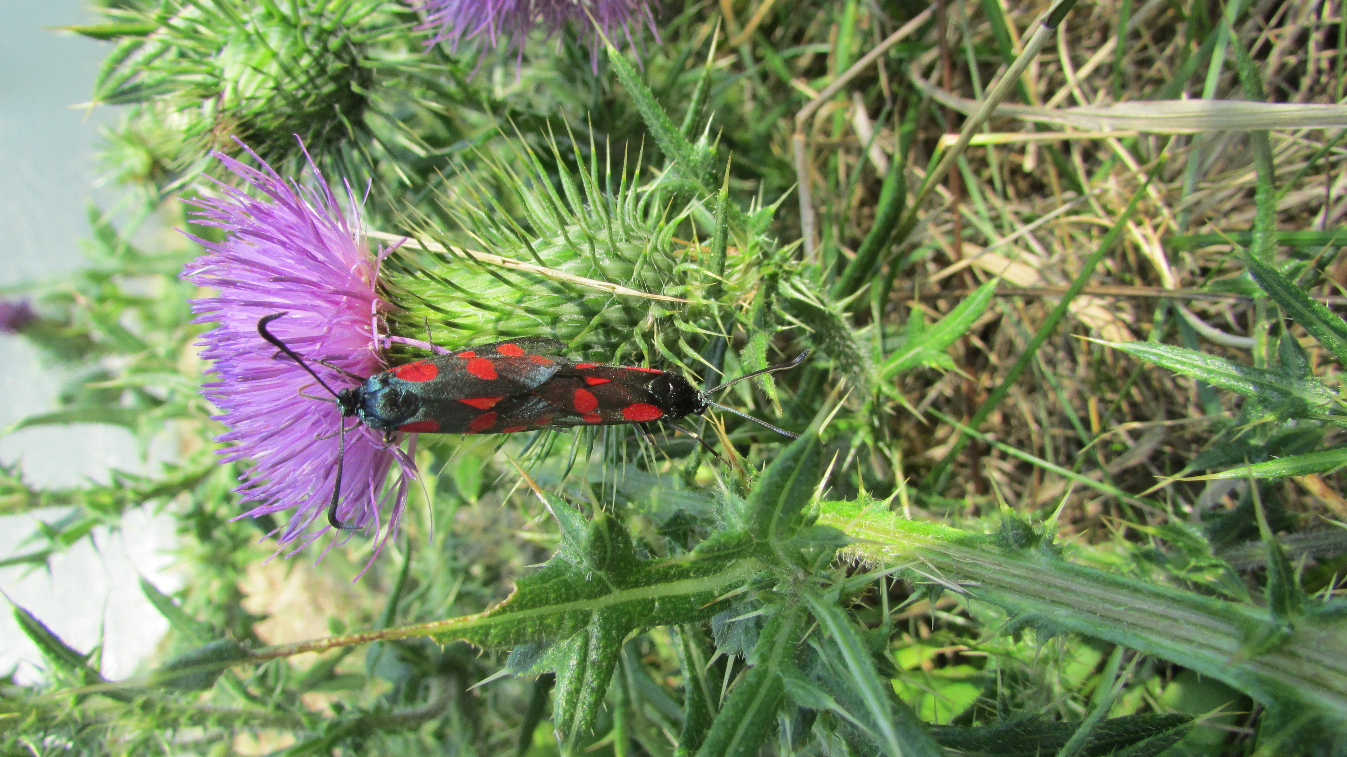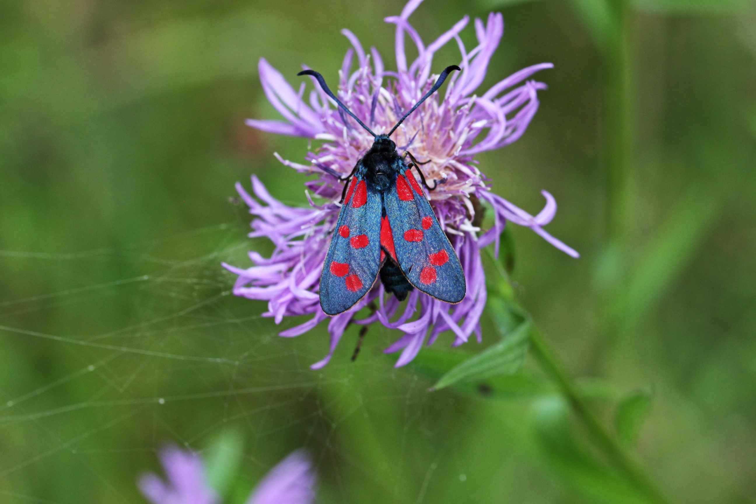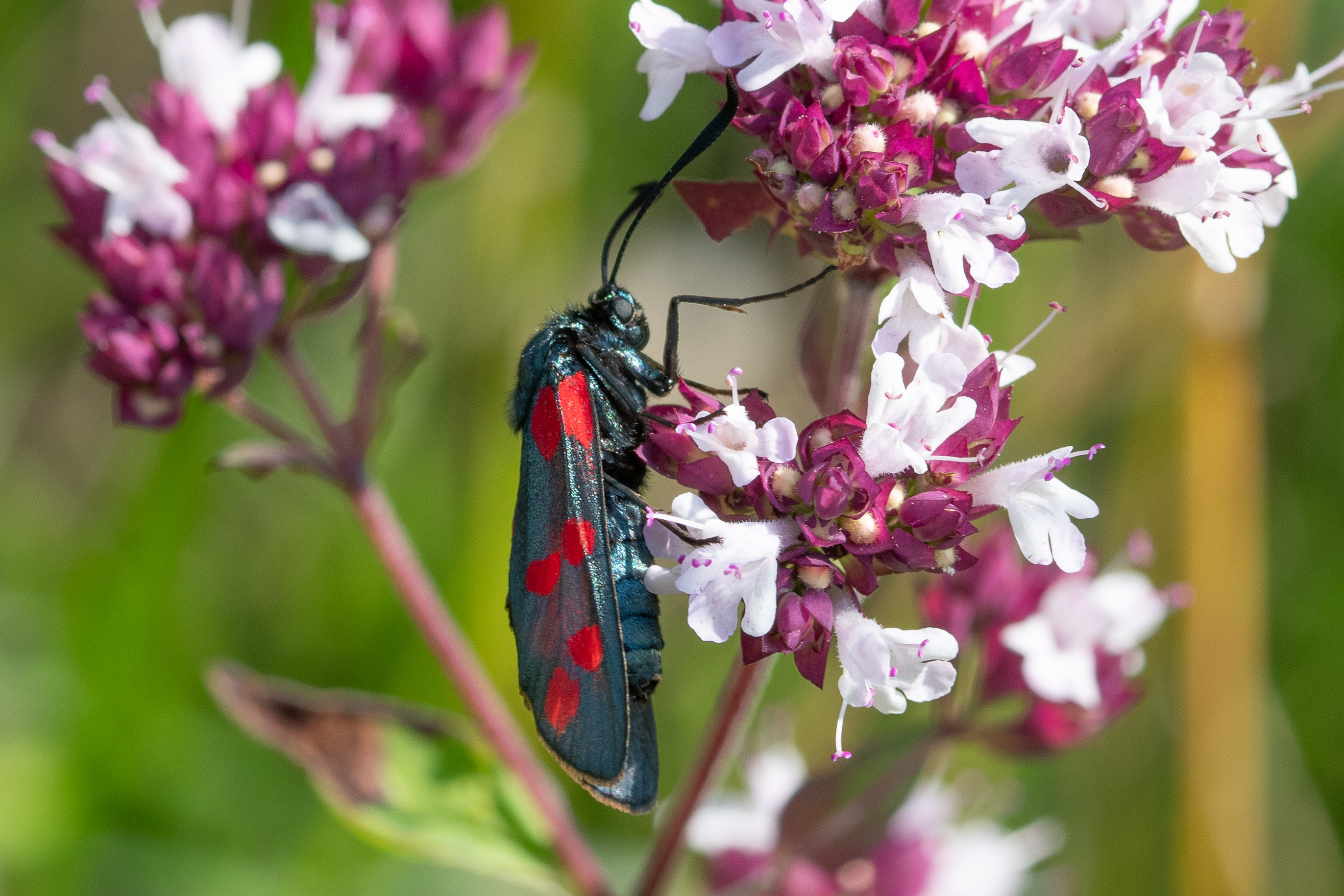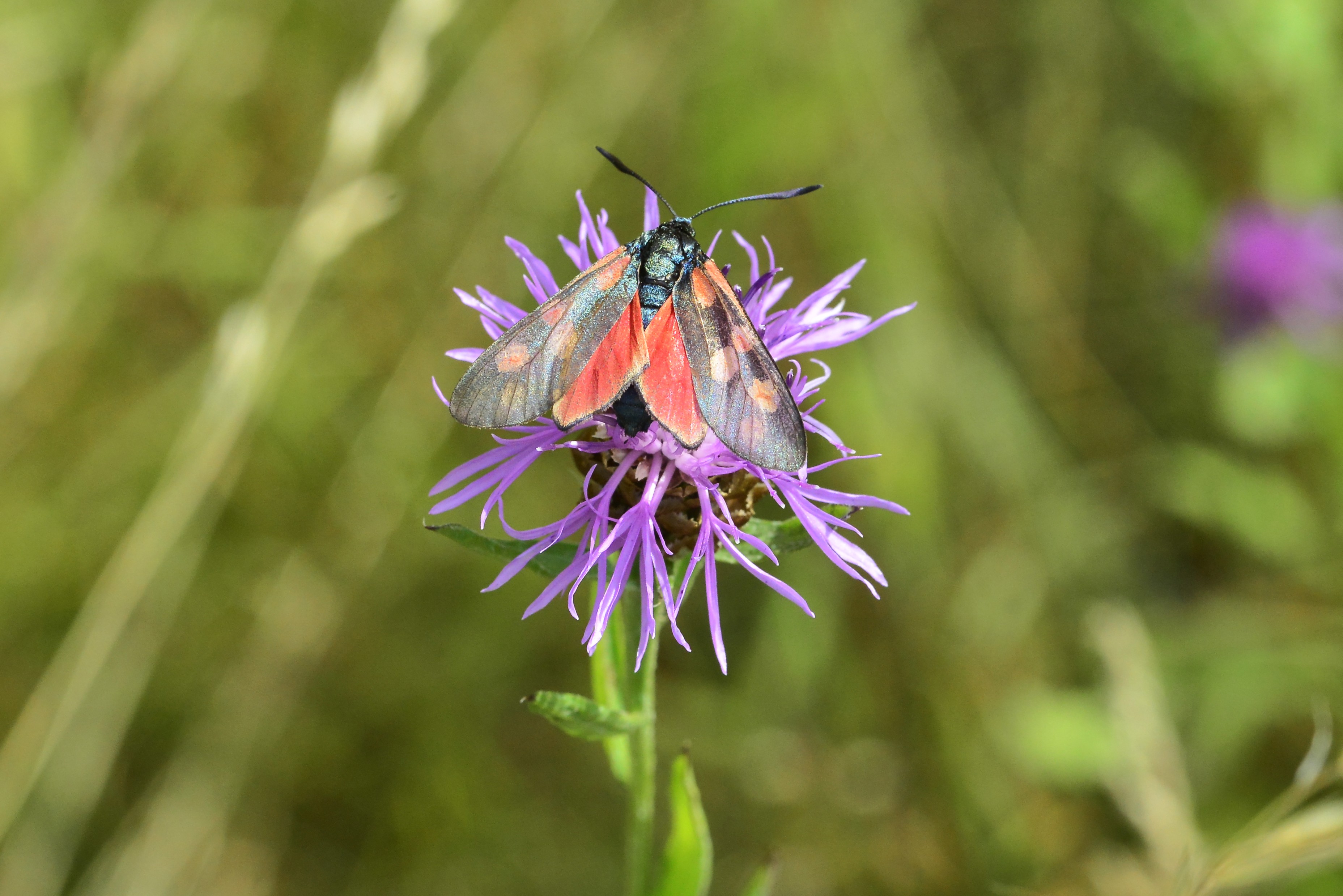Sechsfleck-Widderchen (Zygaena filipendulae (Linnaeus, 1758)),Freital/Wurgwitz,Hammerteich,Wegrand auf Kratzdistel,Aug.2019