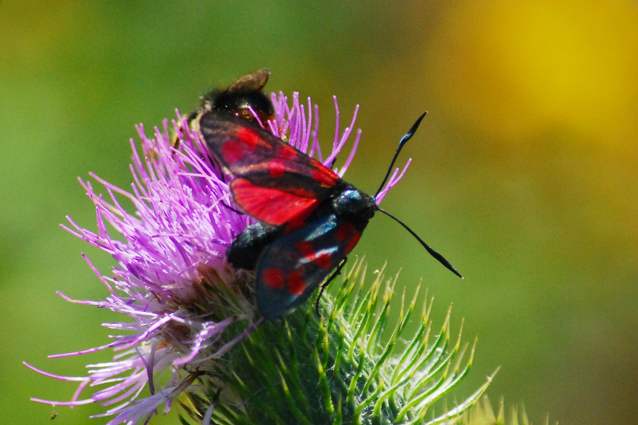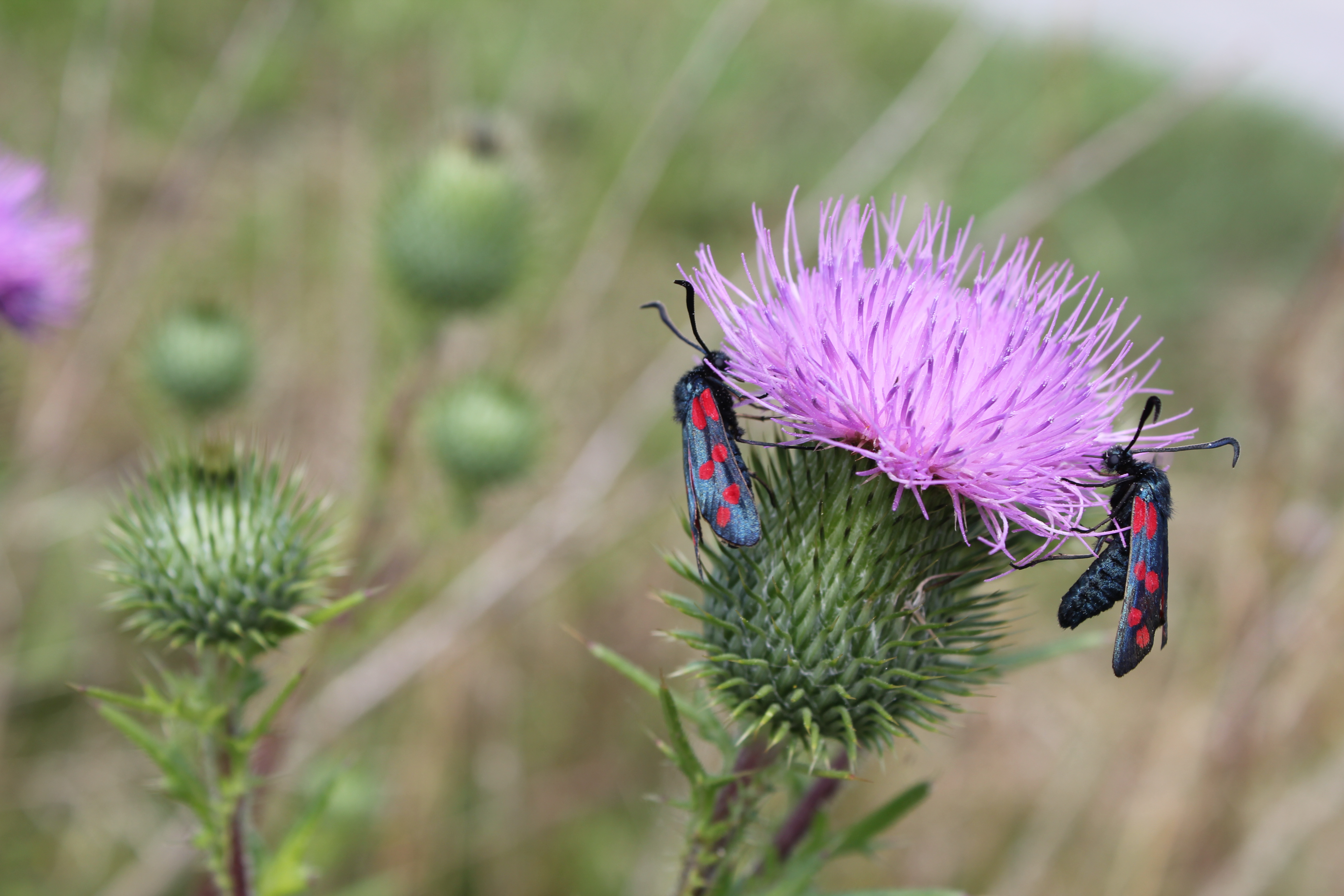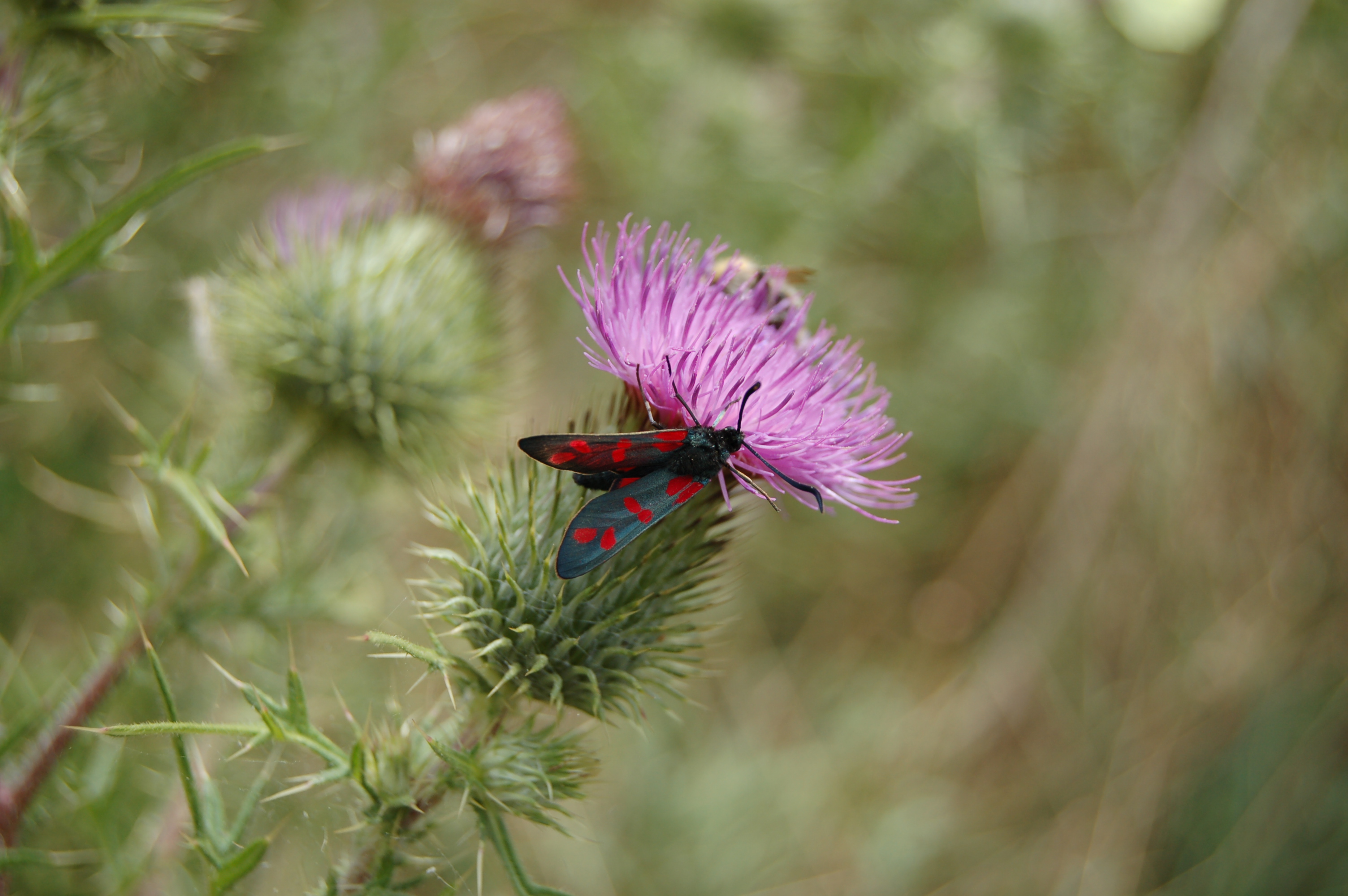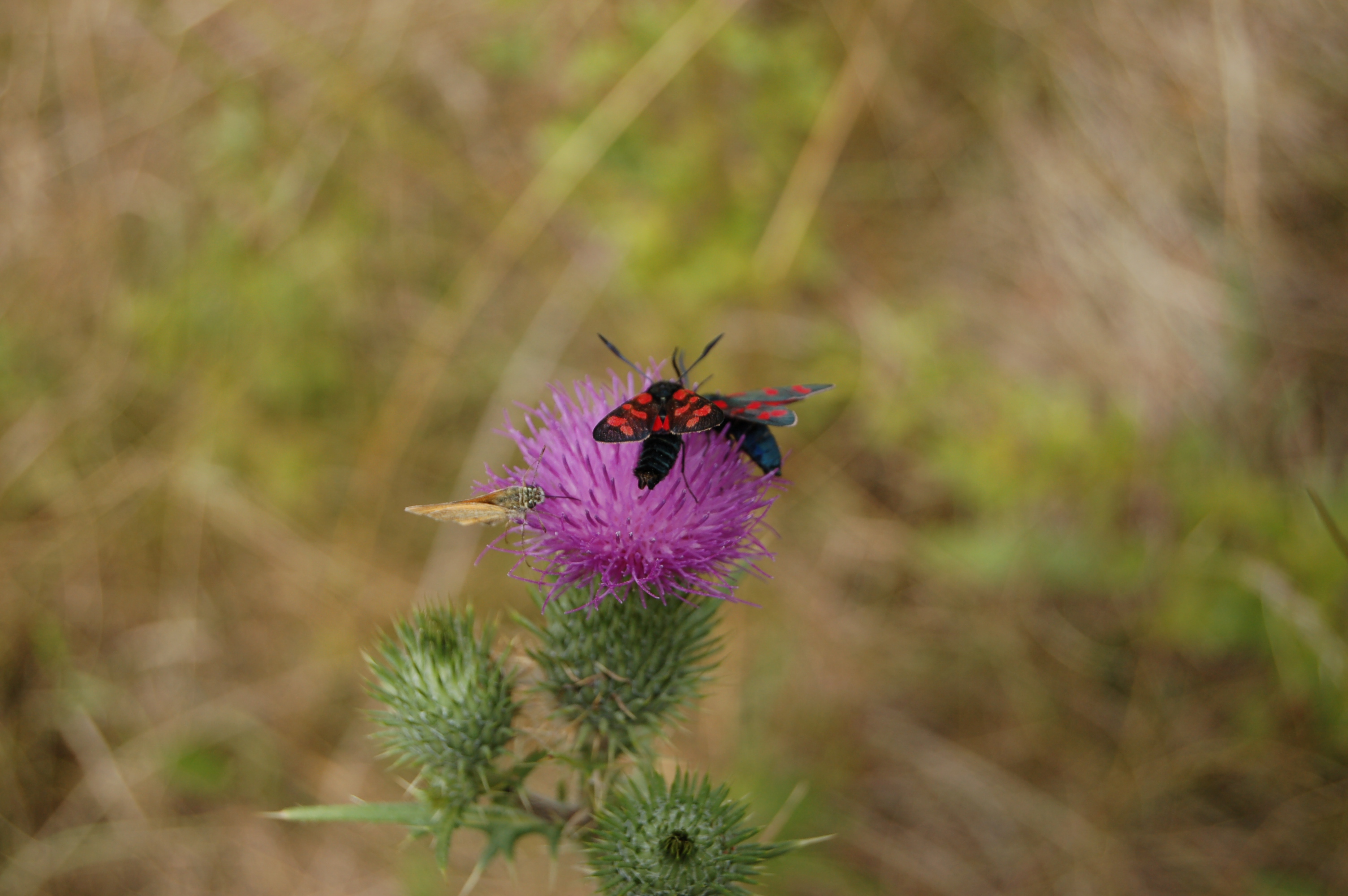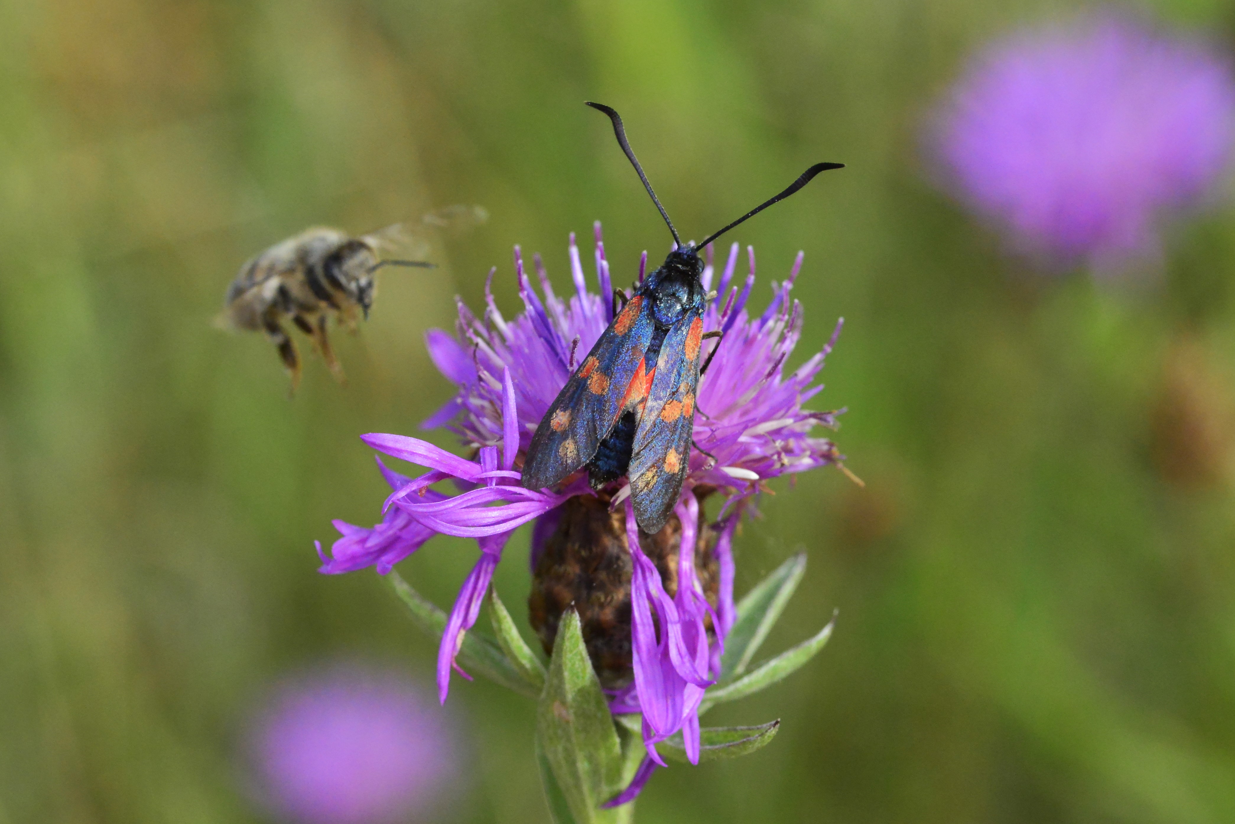 Sechsfleck-Widderchen (Zygaena filipendulae (Linnaeus, 1758)),Freital/Wurgwitz,Hammerteich,Wegrand auf Kratzdistel,Aug.2019