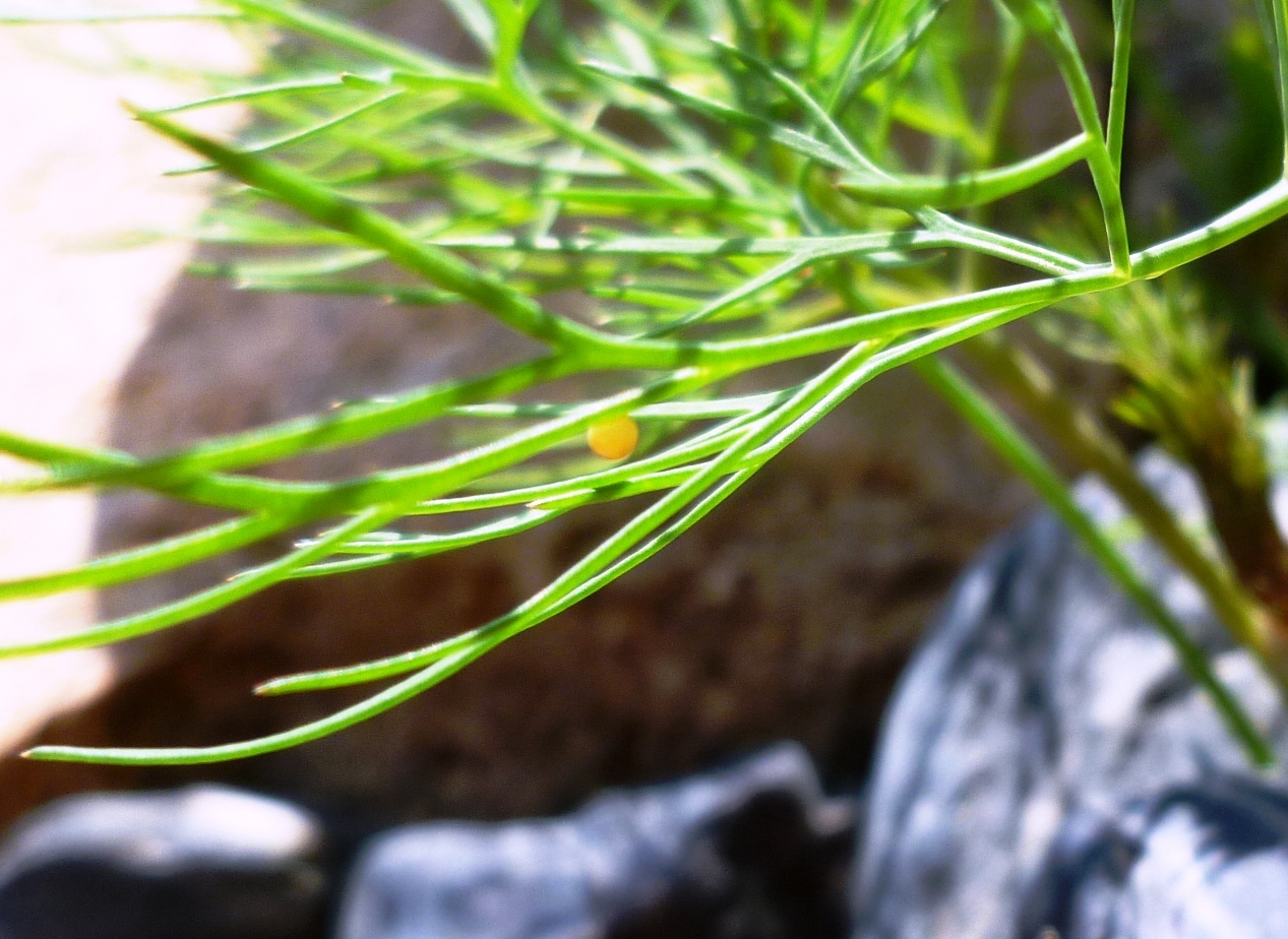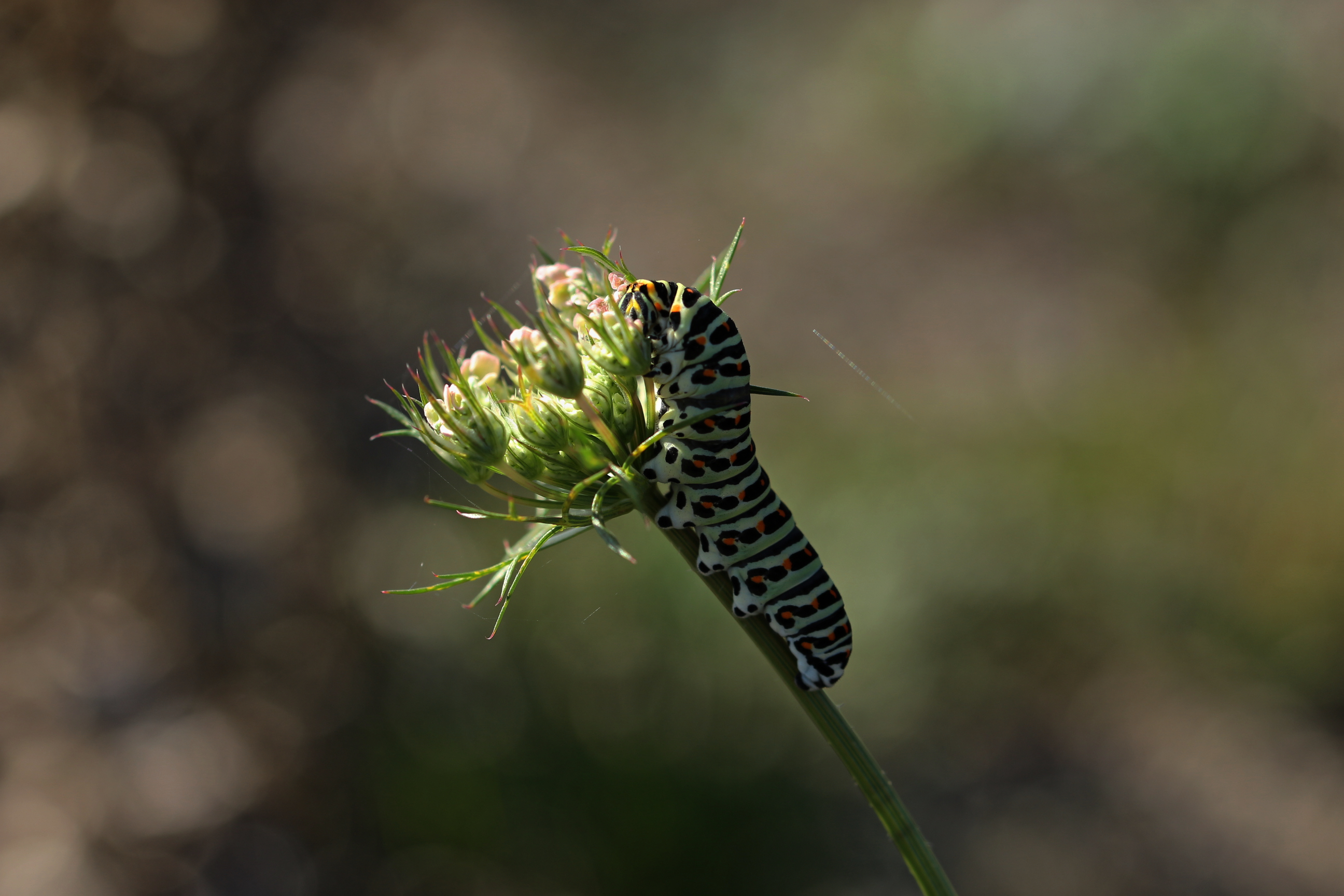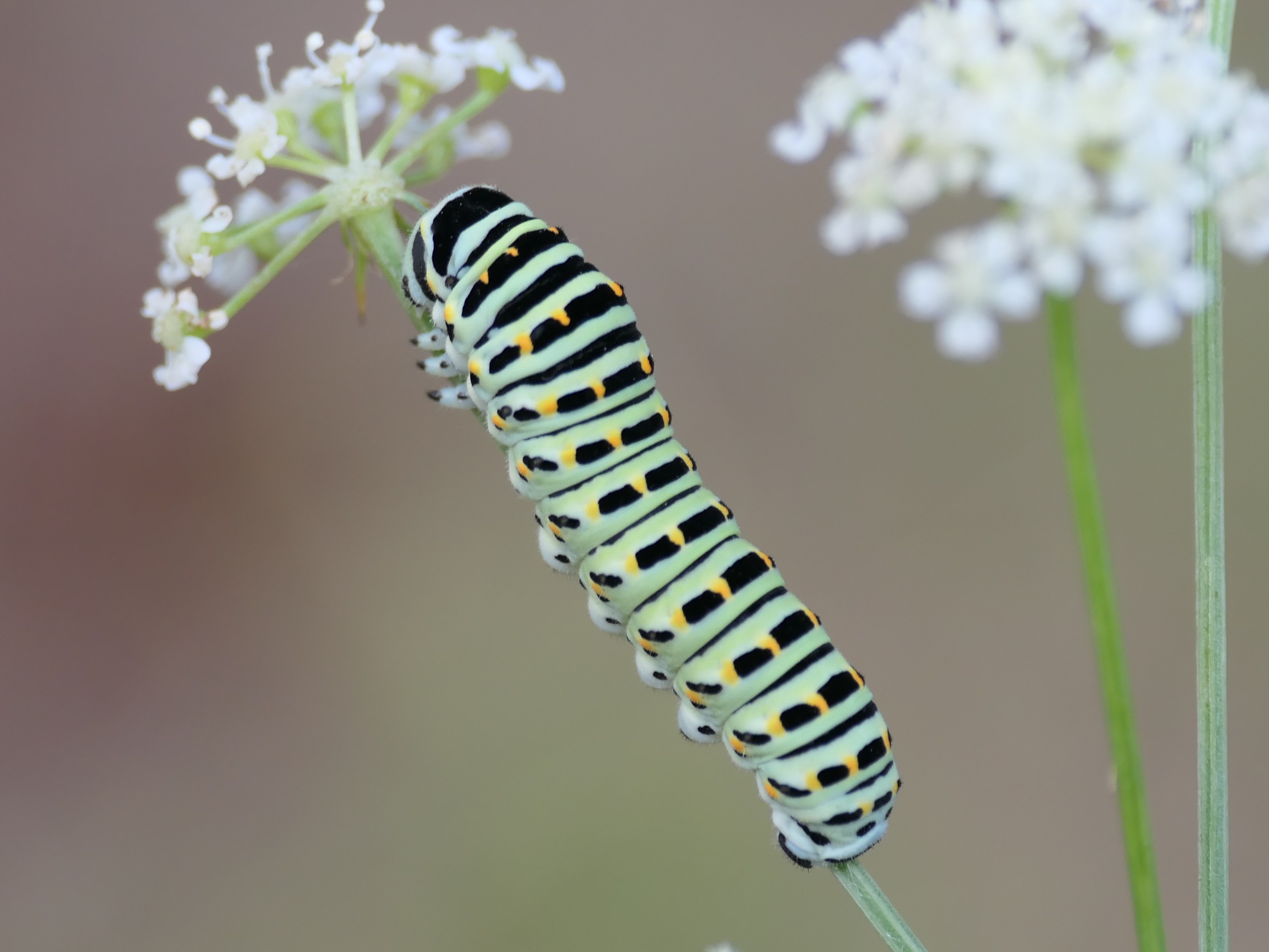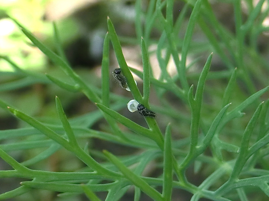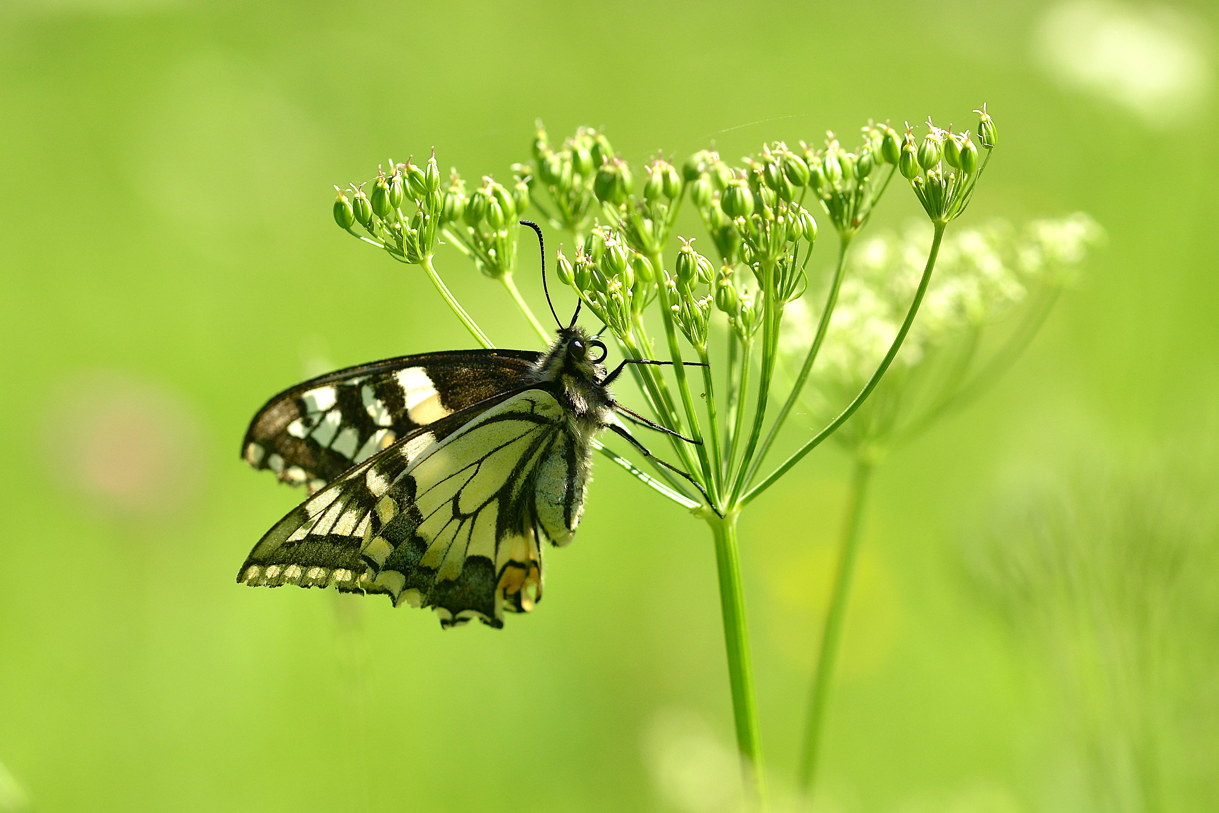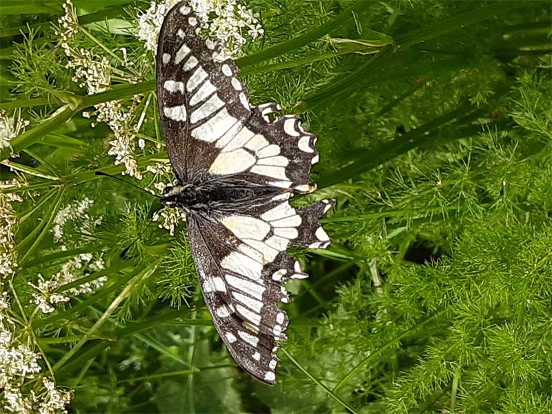 Schwalbenschwanz (Papilio machaon Linnaeus, 1758), Weibchen bei der Eiablage in Blütenknospen der Wilden Möhre (Daucus carota), Elbtal bei Meißen, Juli 2018