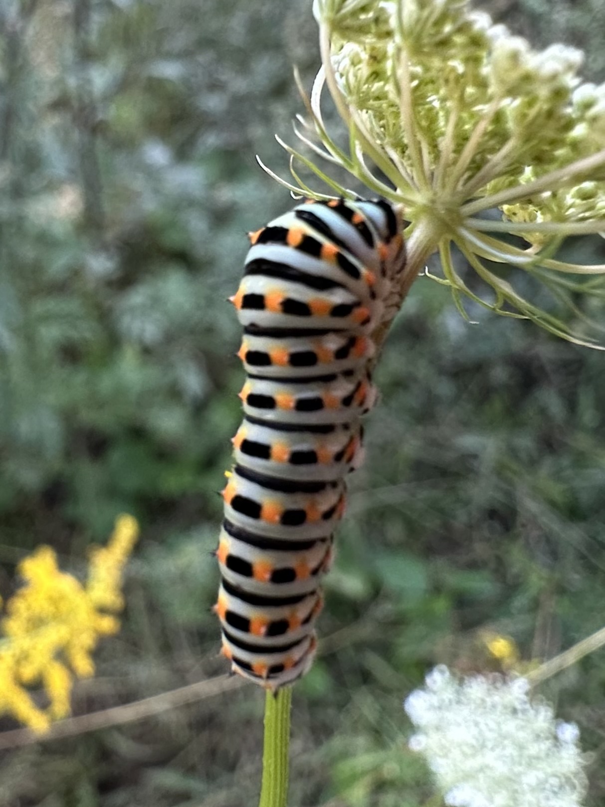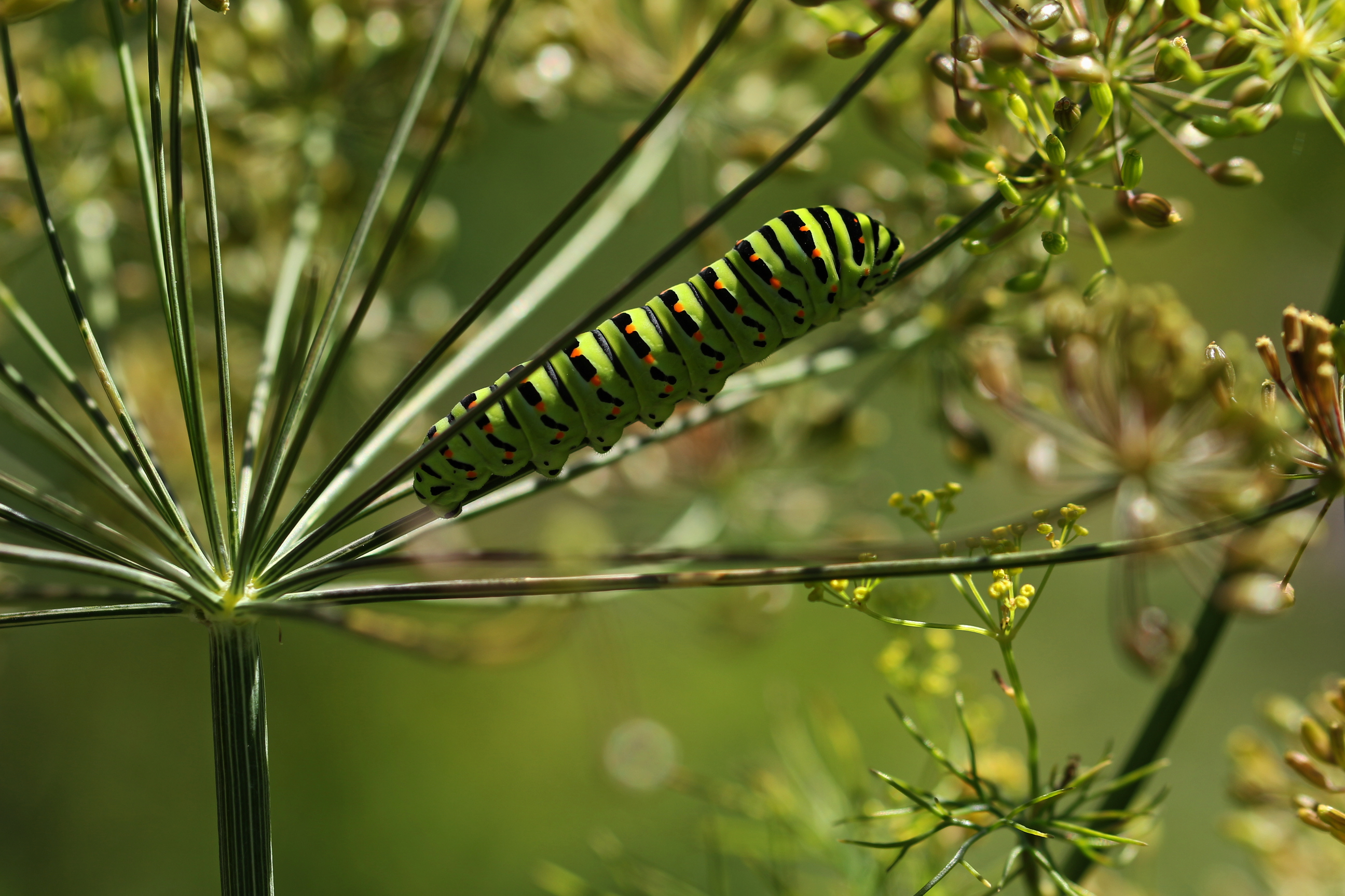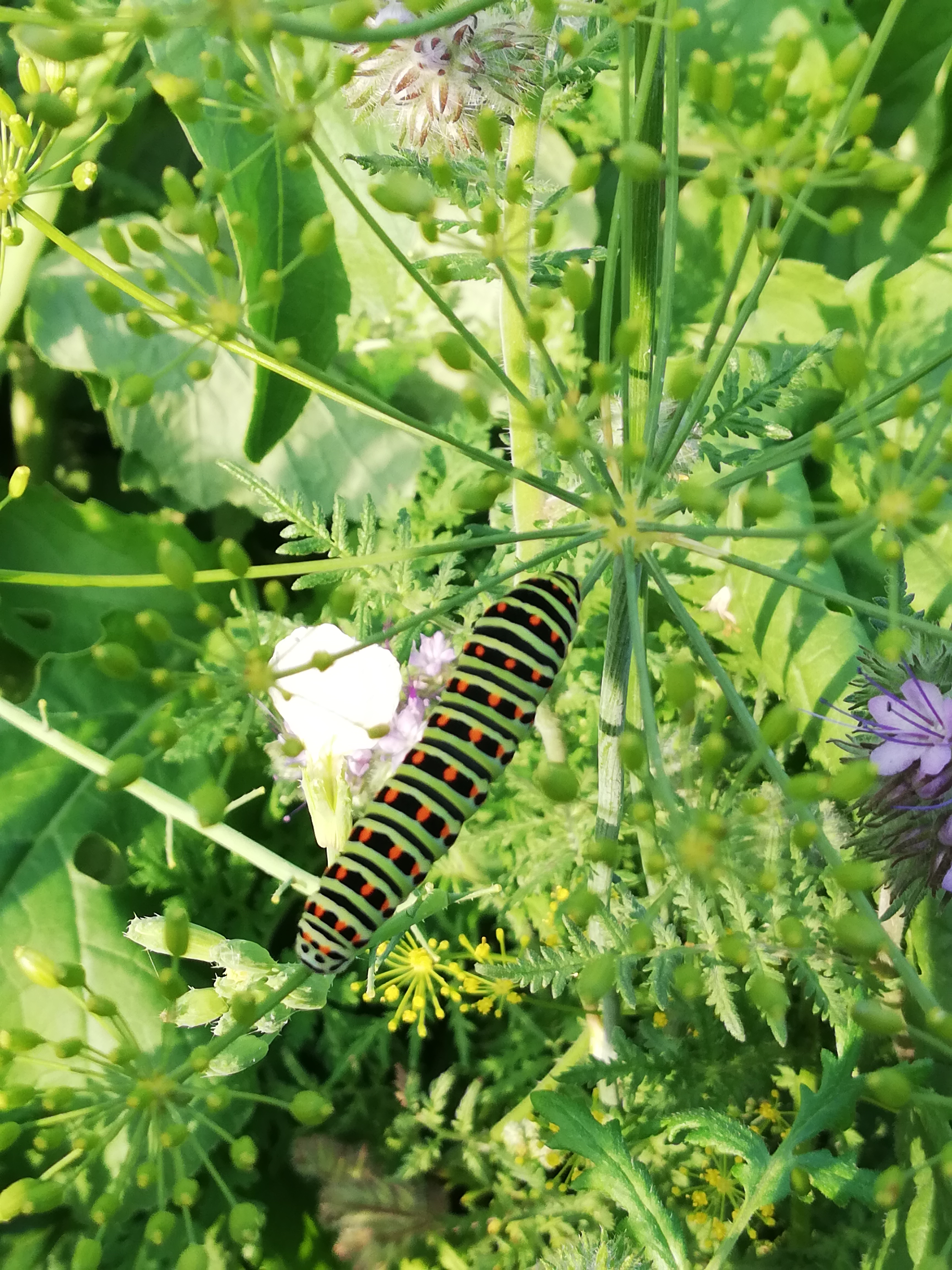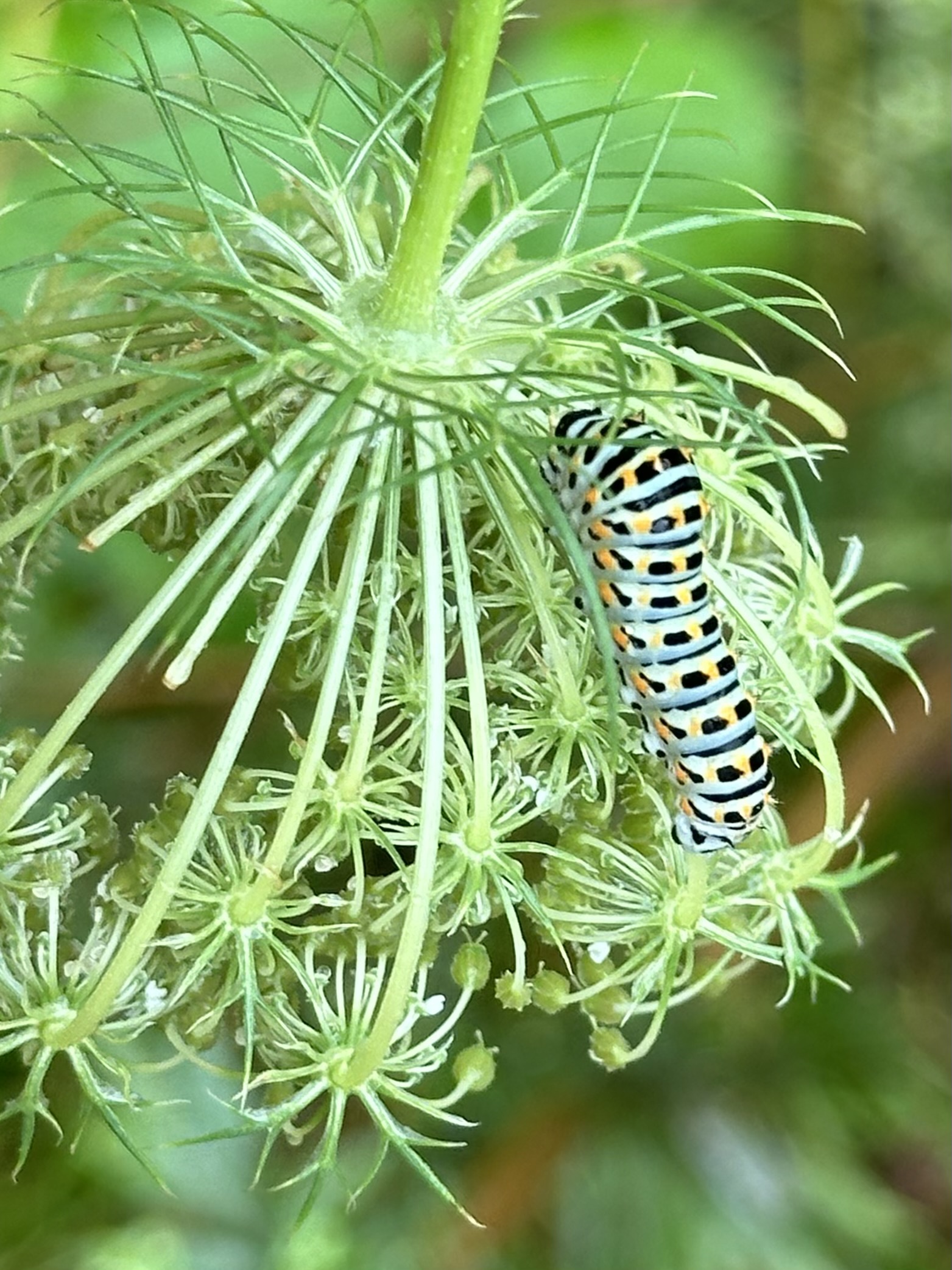 Schwalbenschwanz (Papilio machaon Linnaeus, 1758), Weibchen bei der Eiablage in Blütenknospen der Wilden Möhre (Daucus carota), Elbtal bei Meißen, Juli 2018