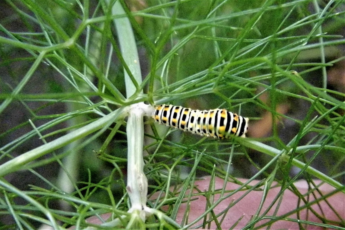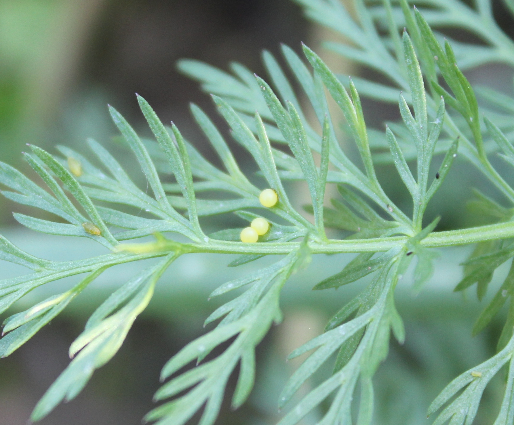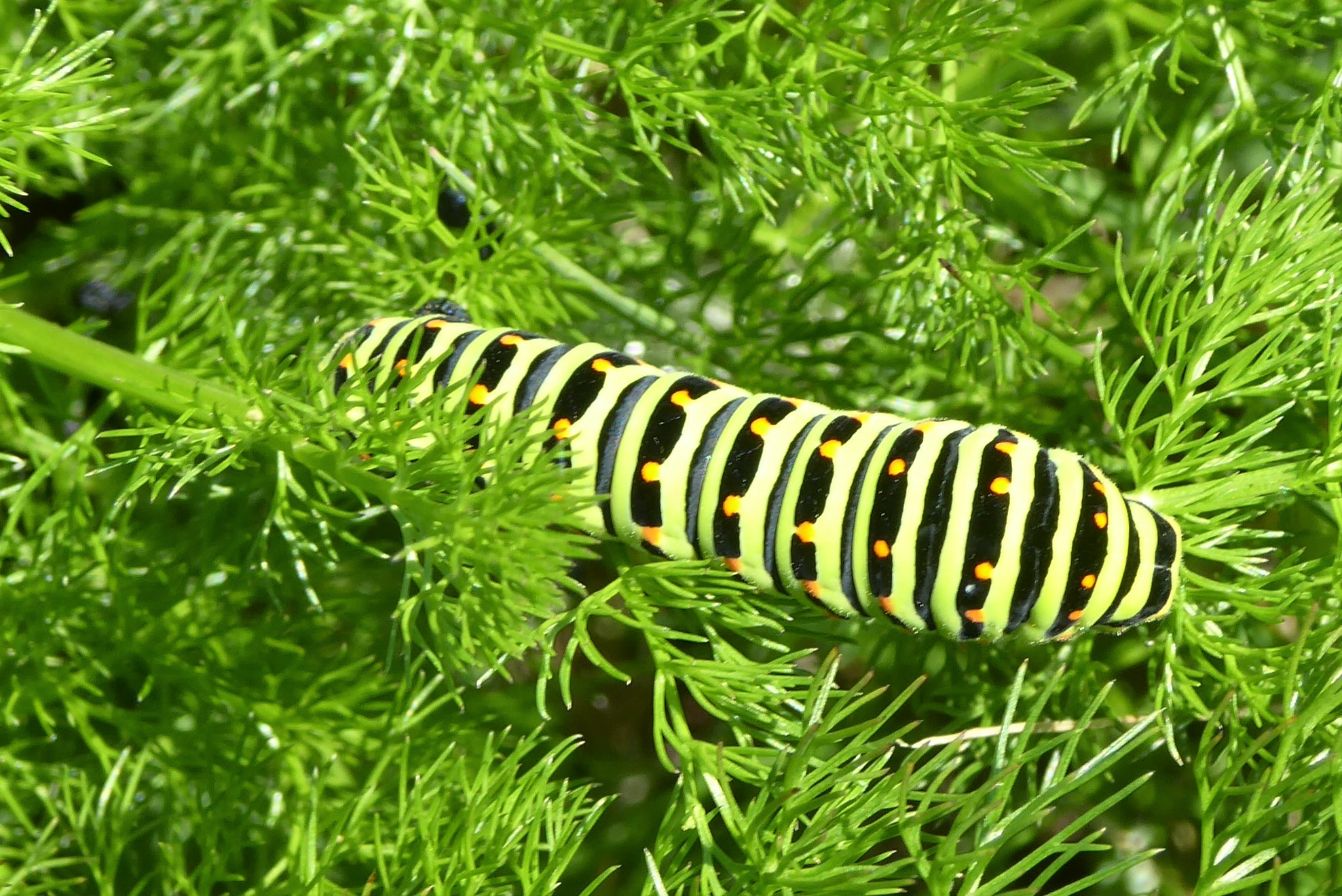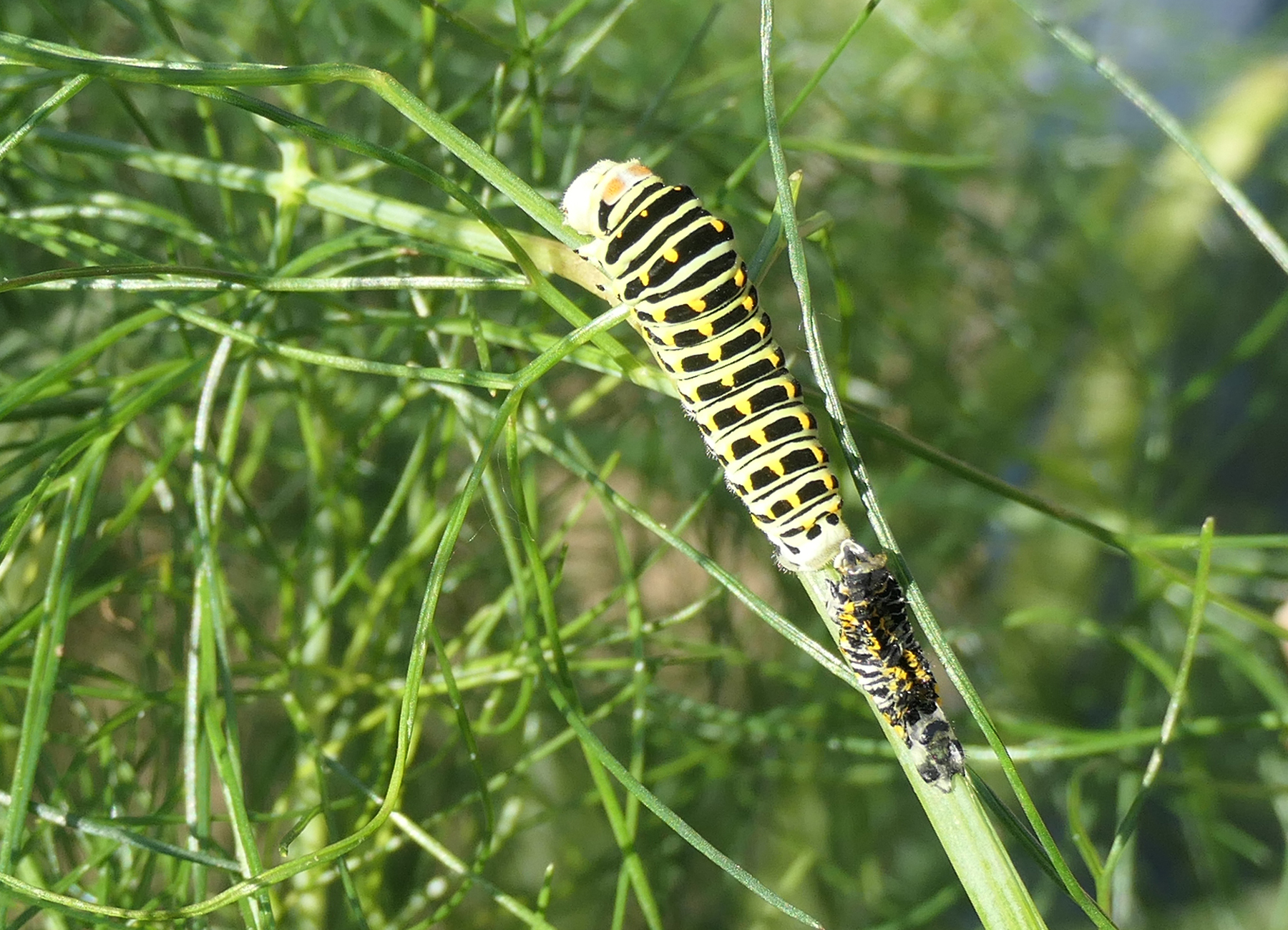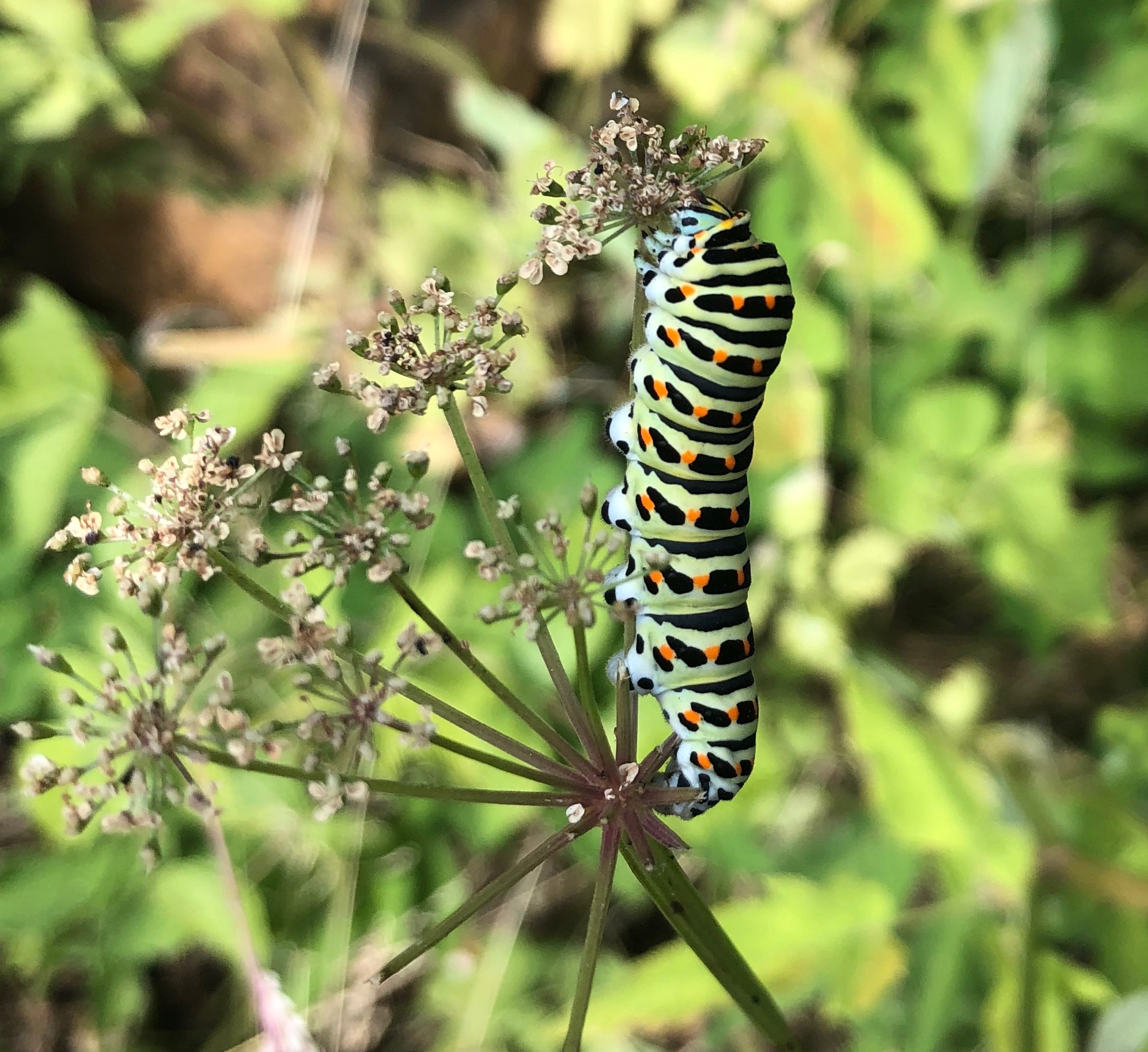 Schwalbenschwanz (Papilio machaon Linnaeus, 1758), Weibchen bei der Eiablage in Blütenknospen der Wilden Möhre (Daucus carota), Elbtal bei Meißen, Juli 2018