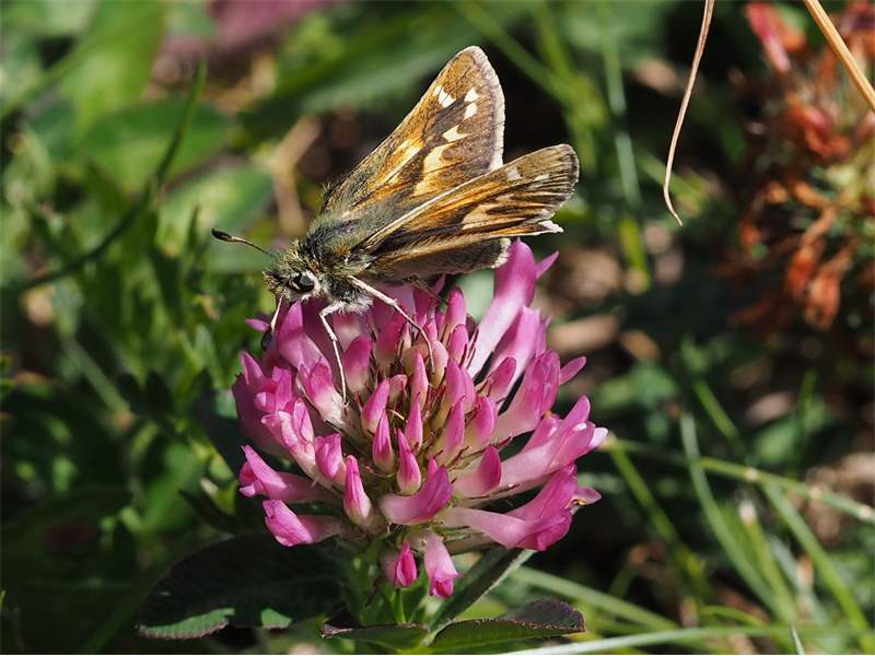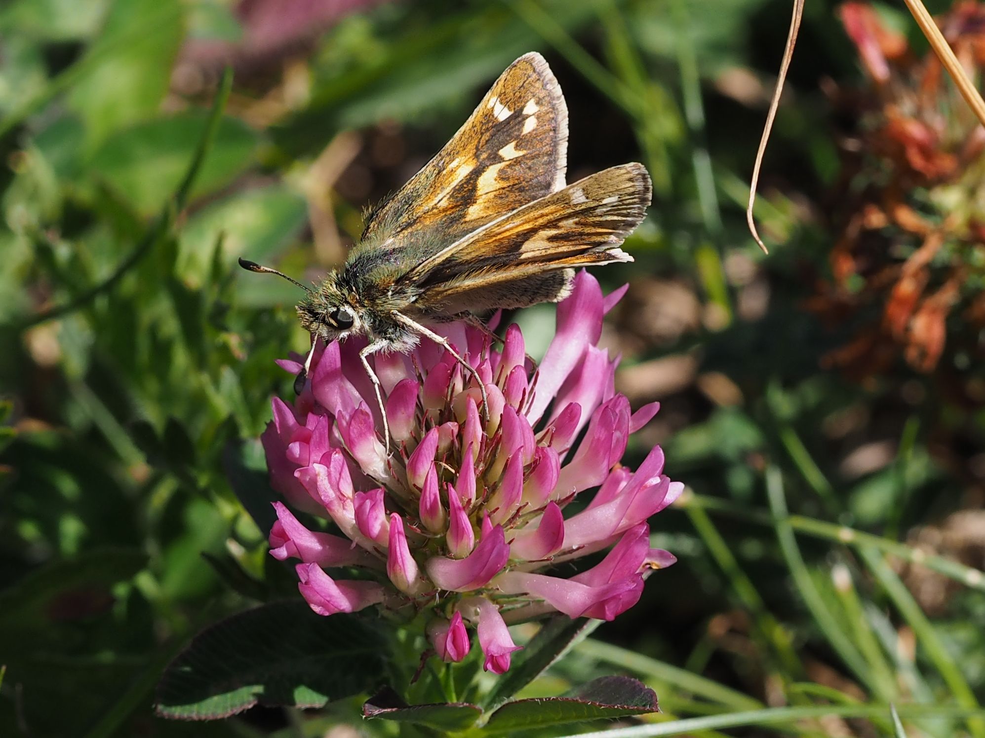 Weibchen des Kommadickkopfes auf Rotklee im August 2015 nördlich von Chamonix-Mont-Blanc auf 1830 m (Frankreich)