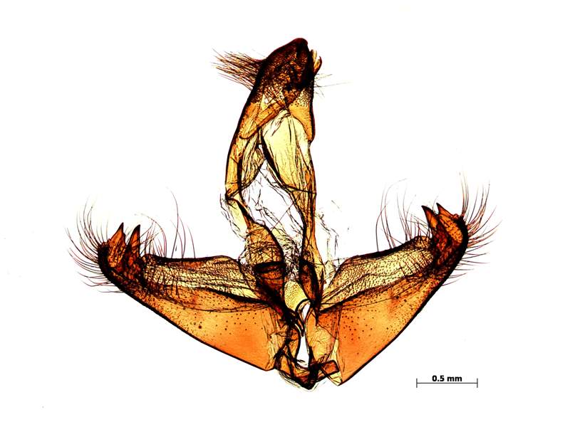 Männliches Genital: Uncus distal dreieckig, undeutlich gespalten, Gnathos lang zweizipfelig; Valven dorso-distal mit zwei großen Zähnen, welche die Costa deutlich überragen. Phallus mit einem Cornutus und posterior mit einer kielartigen Sklerotisierung.