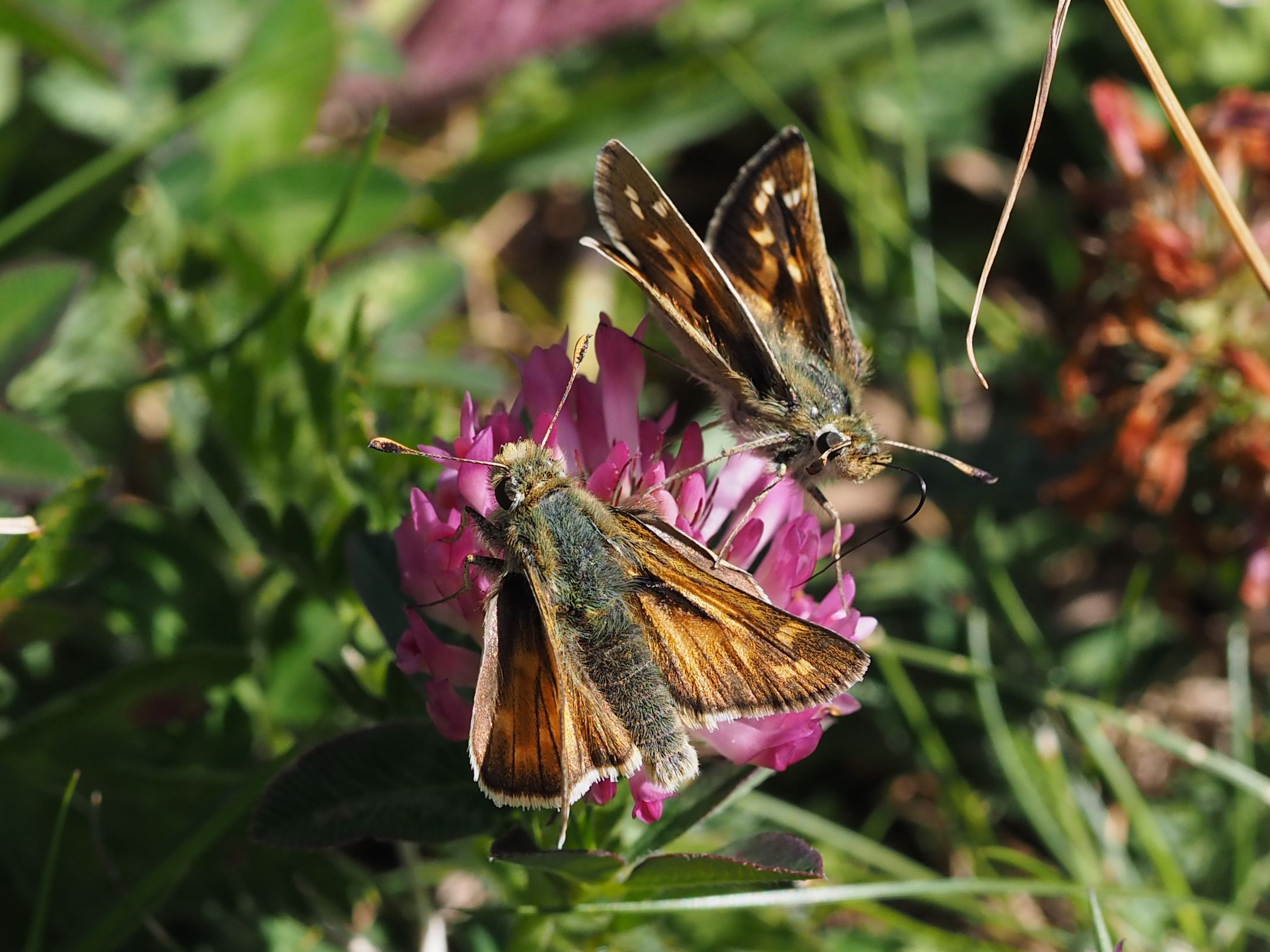 Kommadickköpfe auf Rotklee im August 2015 nördlich Chamonix-Mont-Blanc auf 1830 m (Frankreich). Vorn Männchen, hinten Weibchen. (© Matthias Nuß)( Bild vergrößern)