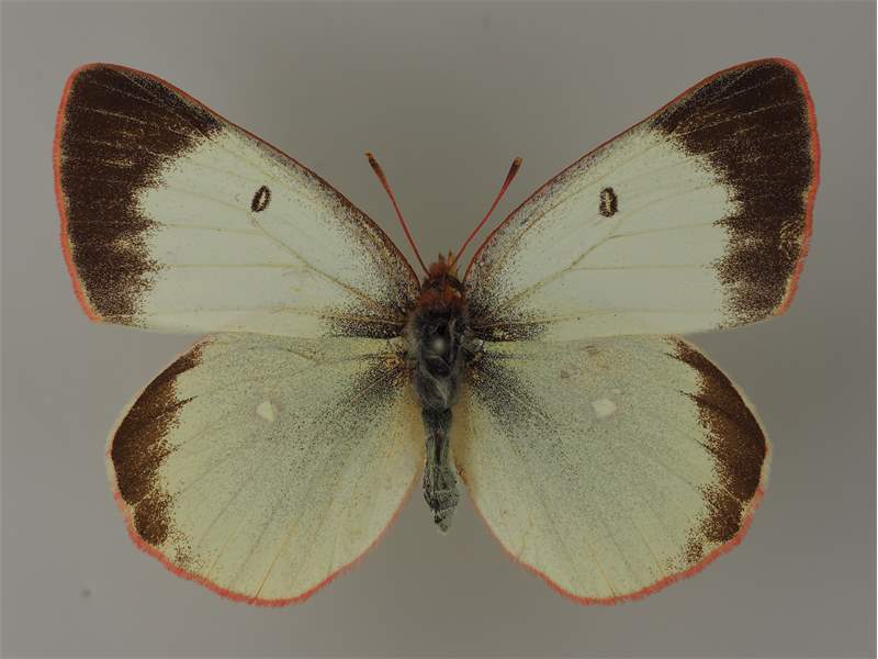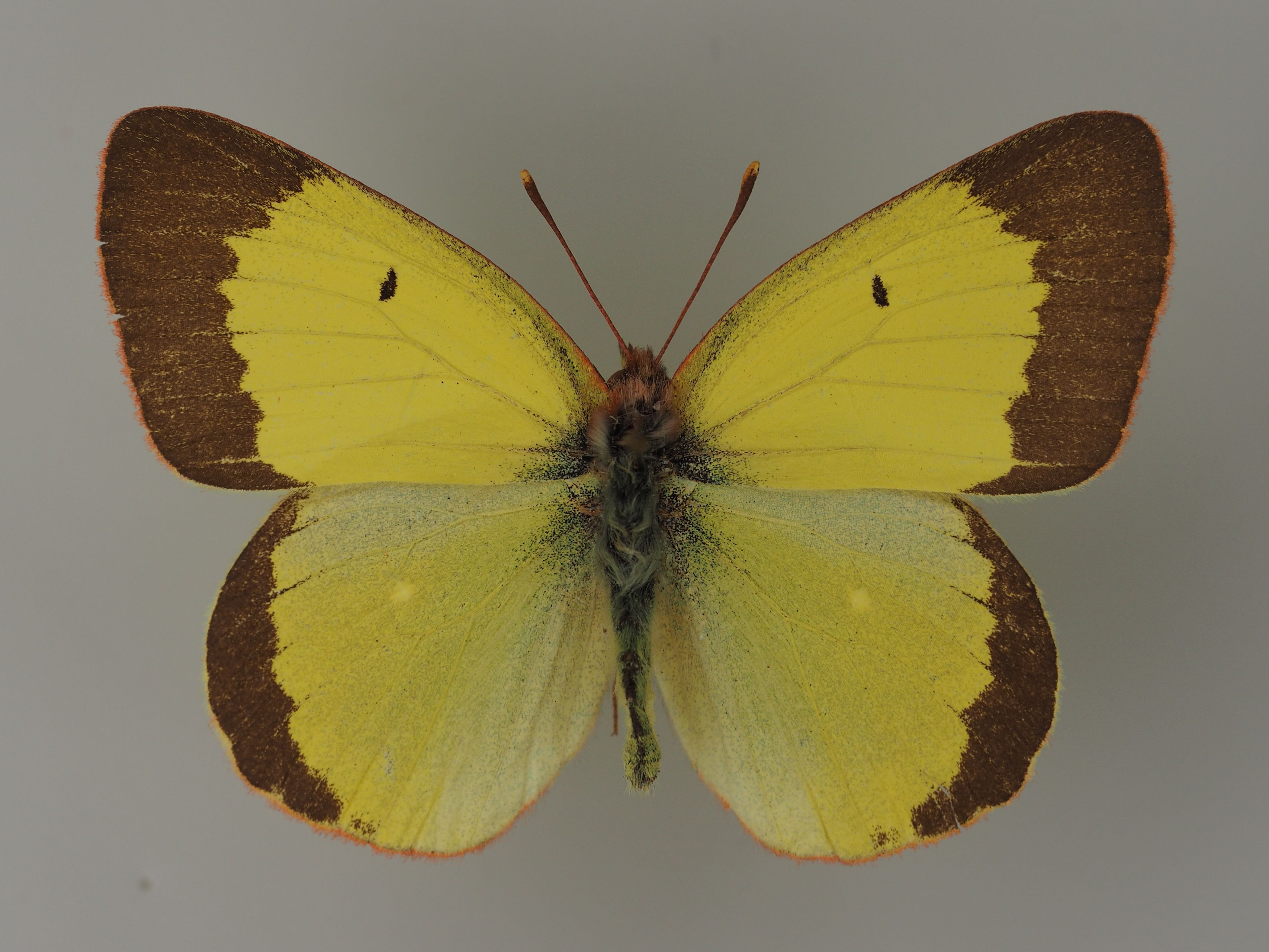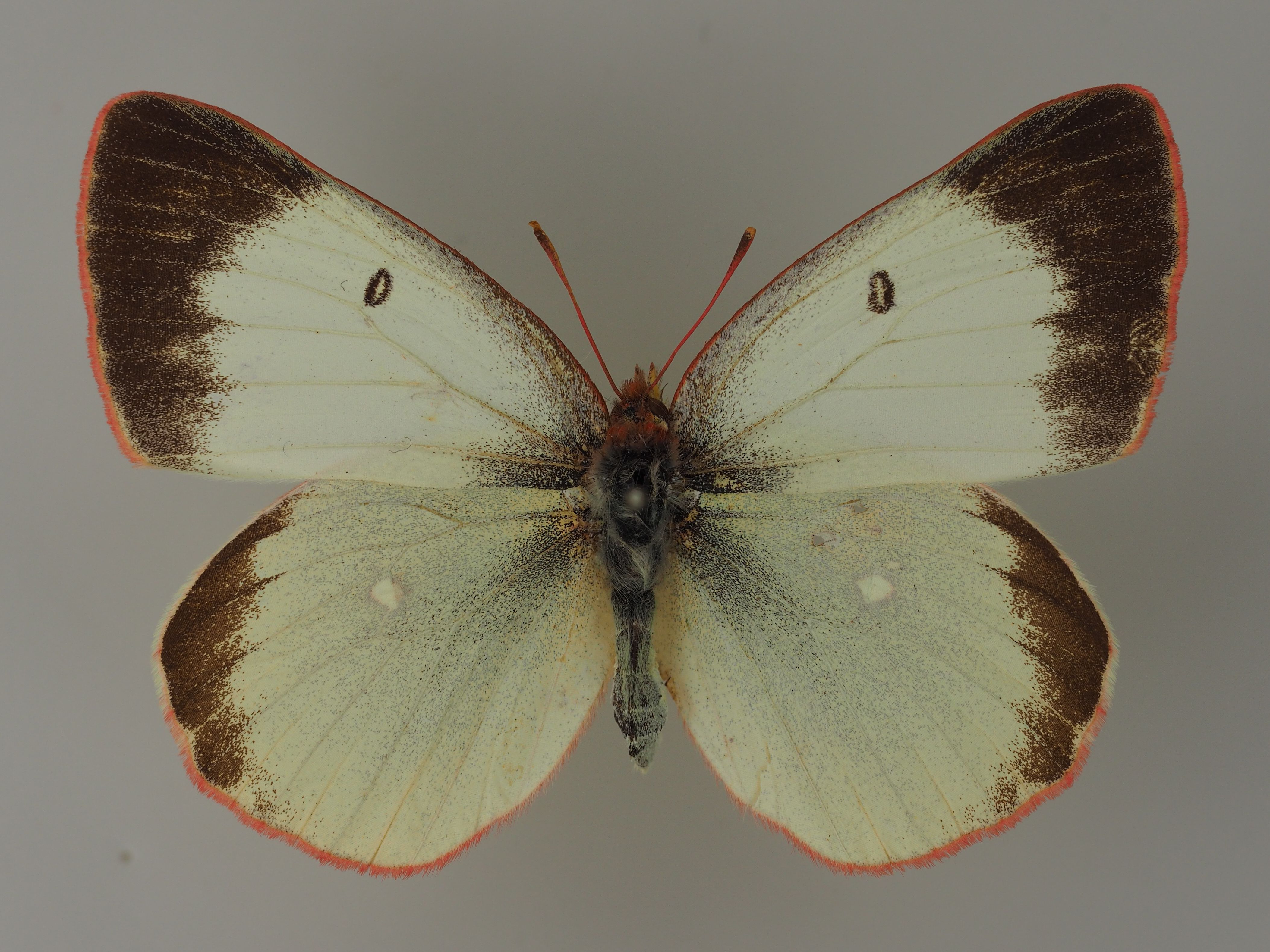 Flügeloberseiten gelb (Männchen) oder gelblich-weiß (Weibchen), mit schwarzen Randbinden, die keine hellen Flecke aufweisen; Basalfelder schwarz beschuppt; die Flügeladern unregelmäßig fein schwarz beschuppt; Vorderflügel etwa in der Mitte mit schwarzem Fleck, dieser kann ein helles Zentrum aufweisen; Hinterflügel etwa in der Mitte mit hellem Punkt.