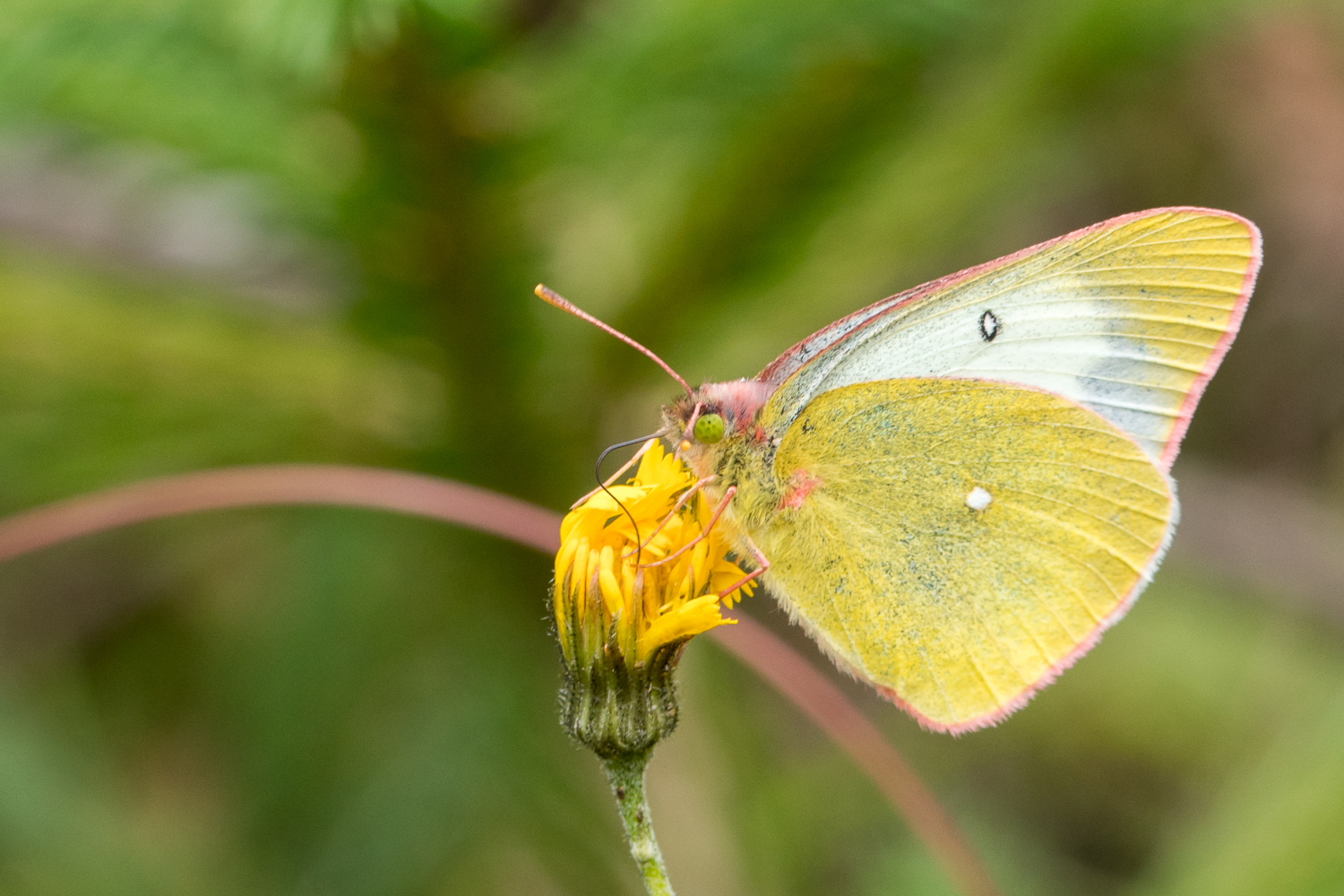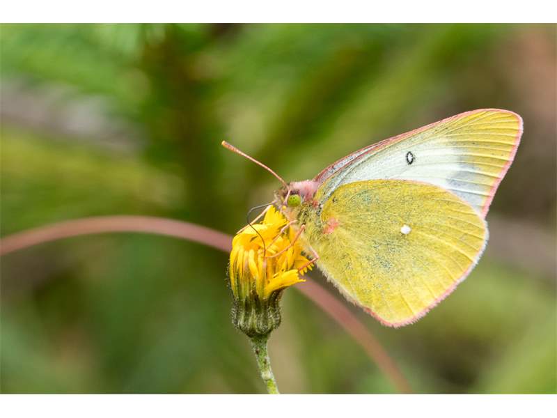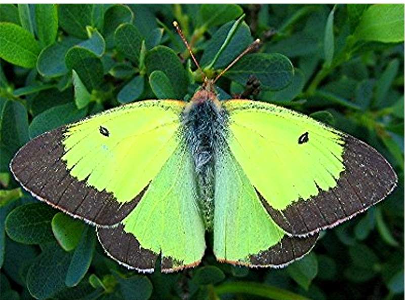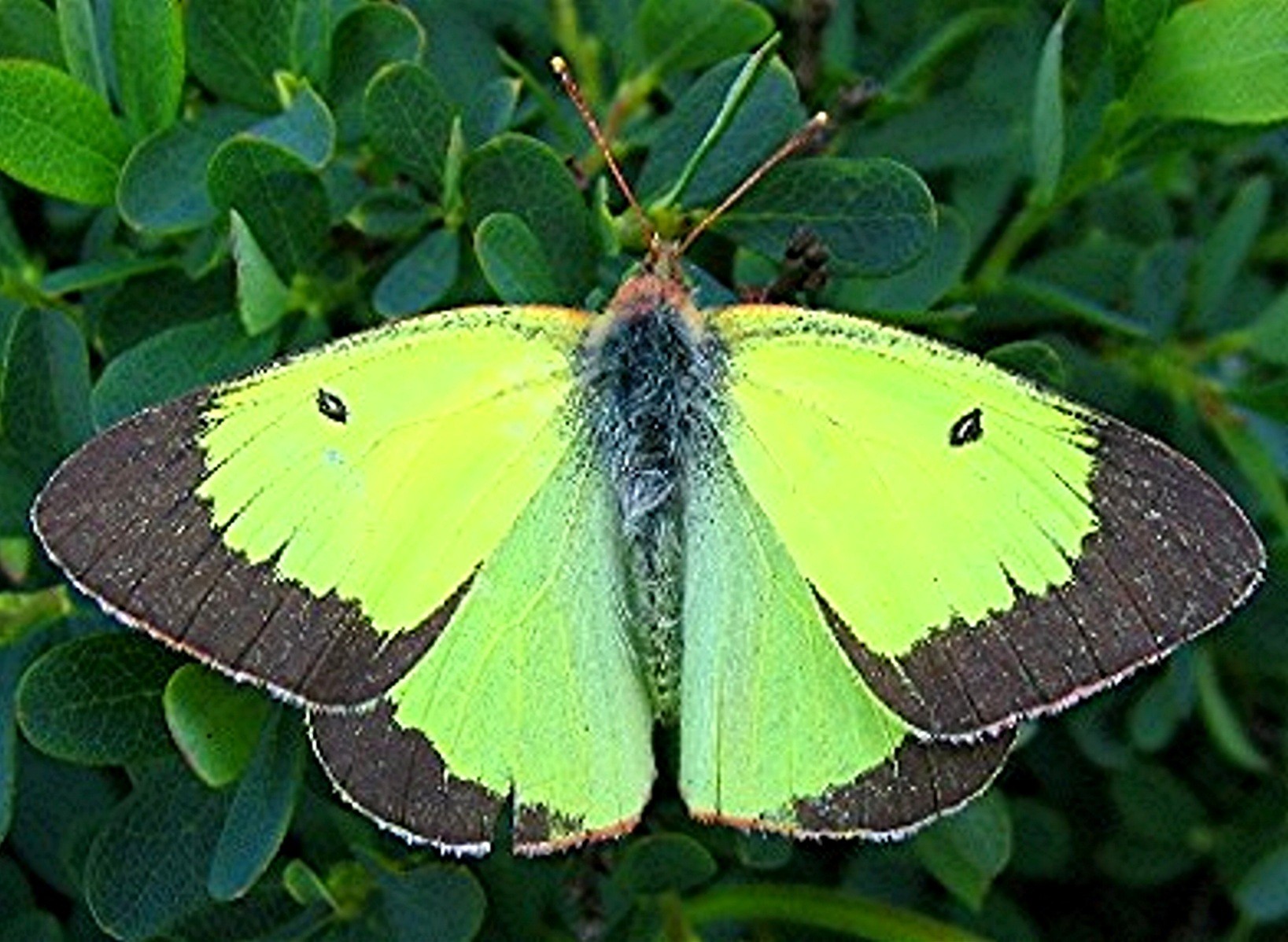 Flügeloberseiten gelb (Männchen) oder gelblich-weiß (Weibchen), mit schwarzen Randbinden, die keine hellen Flecke aufweisen; Basalfelder schwarz beschuppt; die Flügeladern unregelmäßig fein schwarz beschuppt; Vorderflügel etwa in der Mitte mit schwarzem Fleck, dieser kann ein helles Zentrum aufweisen; Hinterflügel etwa in der Mitte mit hellem Punkt.
