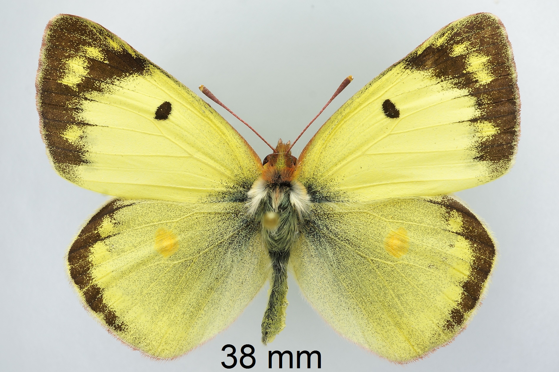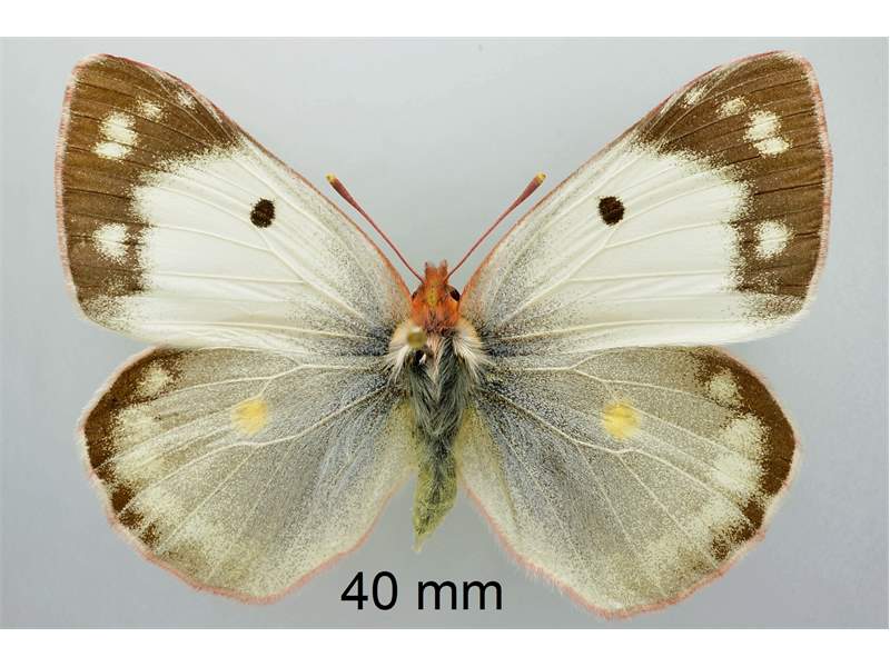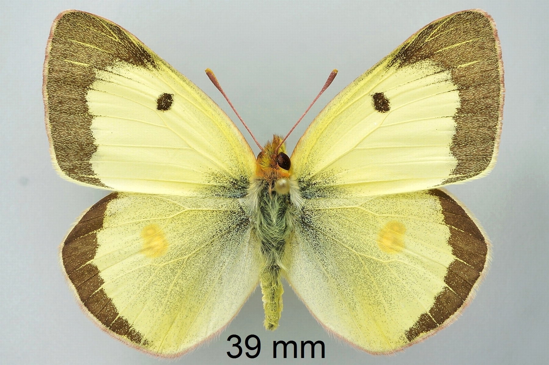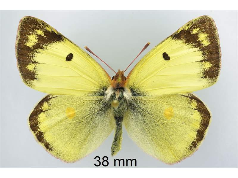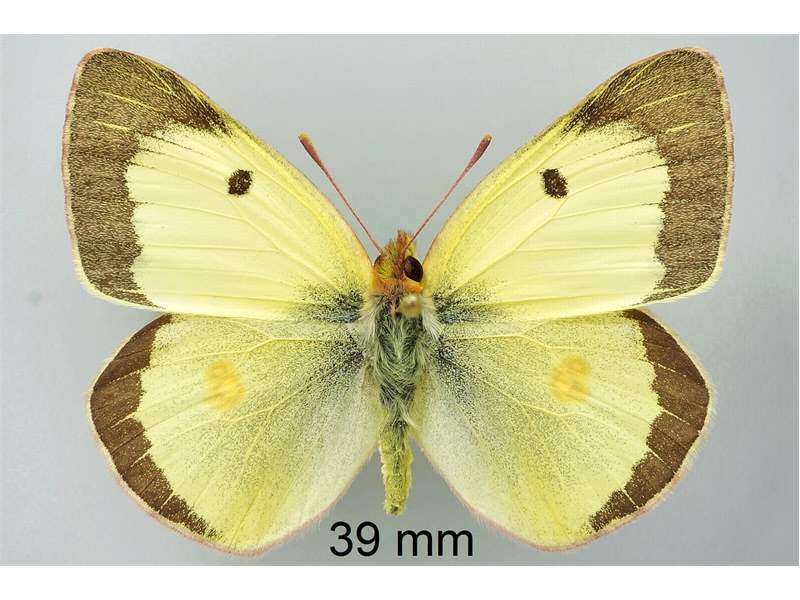 Flügeloberseiten gelb (Männchen) oder blassgelb (Weibchen); Flügelspitze und Außenrand mit breiter schwarzer Binde, diese beim Weibchen mit gelben Flecken; Basalfelder schwarz beschuppt; Vorderflügelmitte mit schwarzem Punkt, Hinterflügelmitte mit einer orangenen „8“.