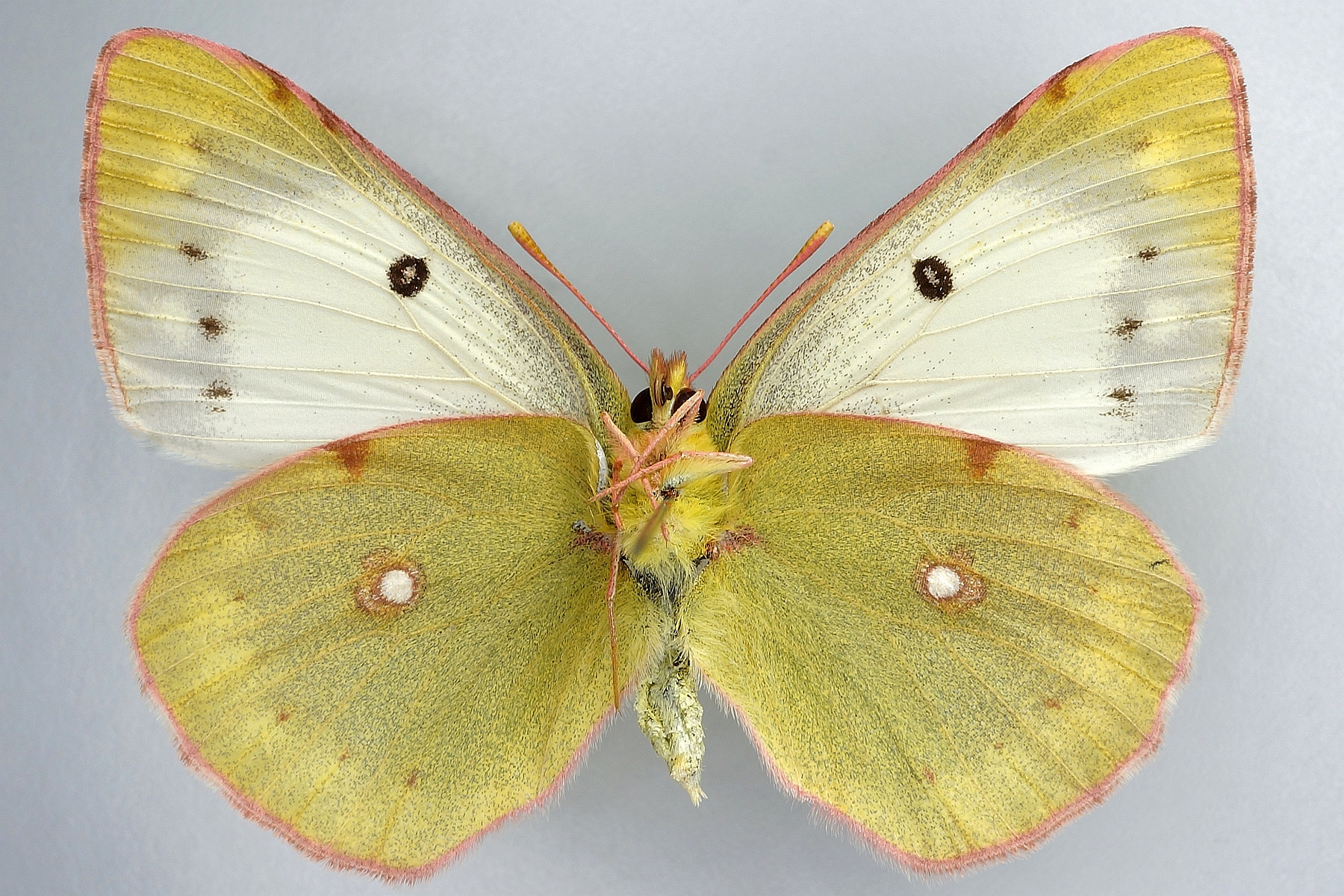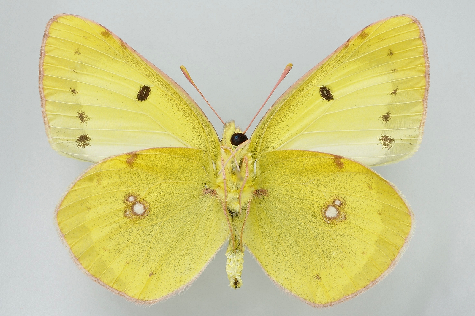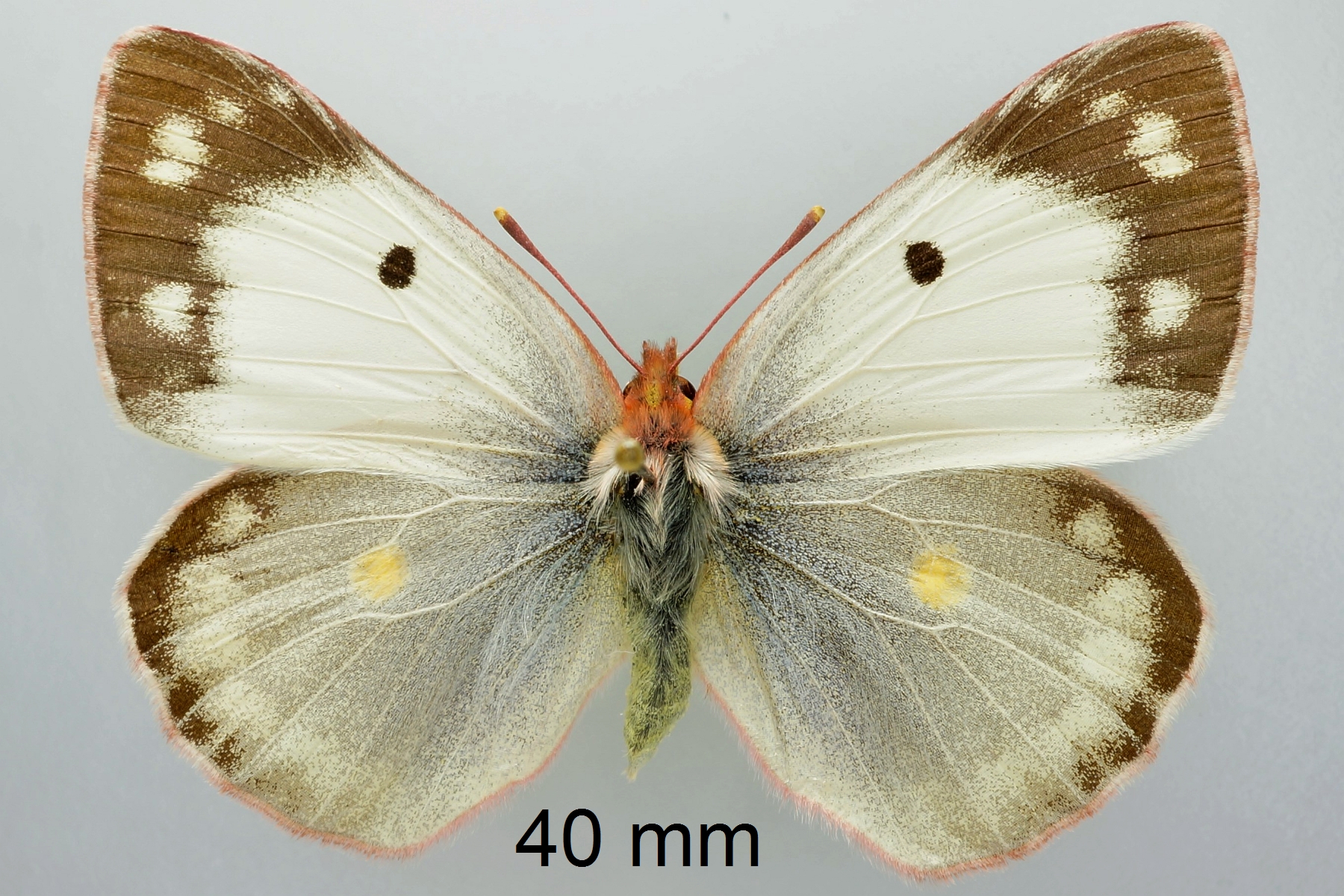 Flügeloberseiten gelb (Männchen) oder blassgelb (Weibchen); Flügelspitze und Außenrand mit breiter schwarzer Binde, diese beim Weibchen mit gelben Flecken; Basalfelder schwarz beschuppt; Vorderflügelmitte mit schwarzem Punkt, Hinterflügelmitte mit einer orangenen „8“.