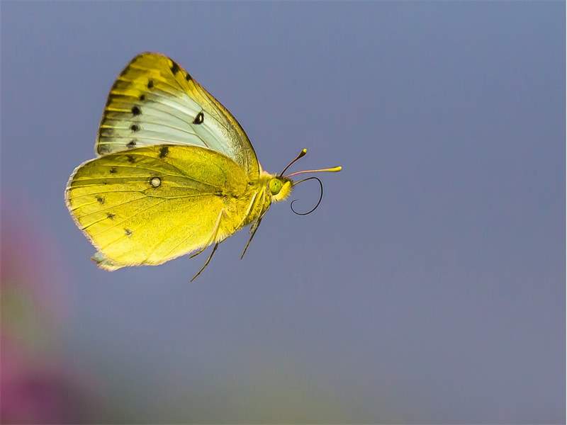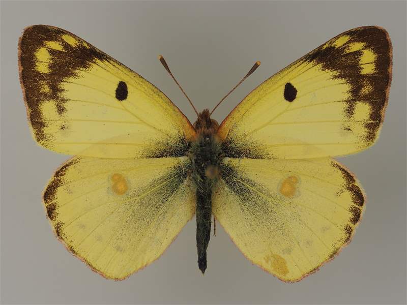 Flügeloberseiten gelb (Männchen) oder blassgelb (Weibchen); Flügelspitze und Außenrand mit breiter schwarzer Binde, in der sich gelbe Flecken befinden; Basalfelder schwarz beschuppt; Vorderflügelmitte mit schwarzem Punkt, Hinterflügelmitte mit einer orangenen „8“.