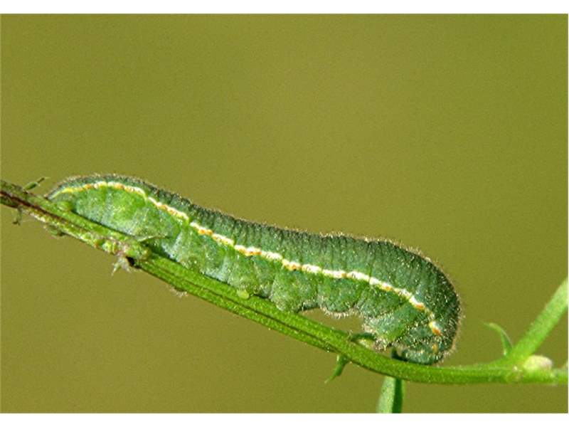 Larve von C. hyale nach der Überwinterung am 28.3.2012. Larvennahrungspflanze war Securigera varia (gezogen aus einem Ei, welches am 04.09.2011 in der Nähe von Pechtelsgrün auf einer Wiese gefunden wurde) (© Matthias Hartung)( Bild vergrößern)
