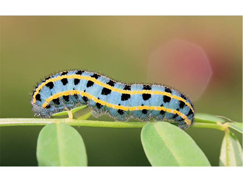 Erstes Larvenstadium mit schwarzem Kopf und hellbraunem Körper. Spätere Larvenstadien grün, mit zwei gelben Seitenlinien auf jeder Seite; die beiden oberen Linien sind auf jedem Segment beidseitig von einem schwarzen Punkt eingefasst (vergleiche Colias hyale).